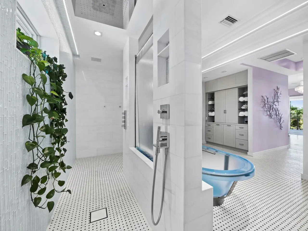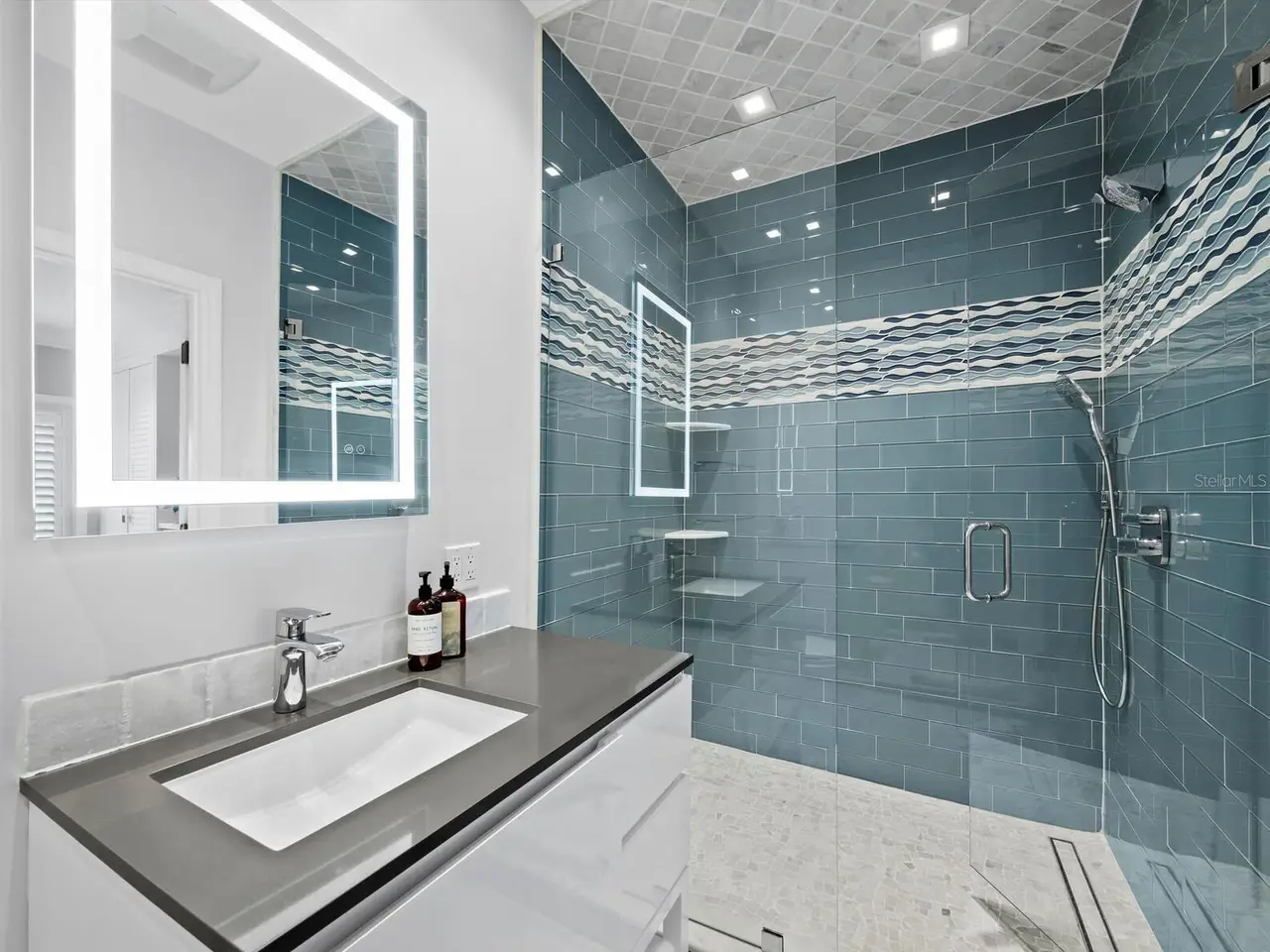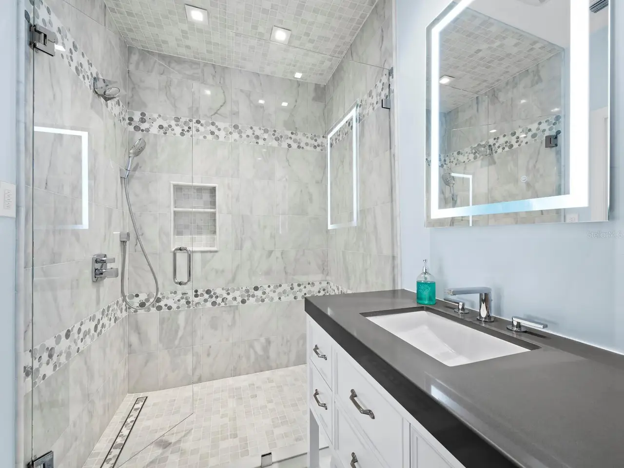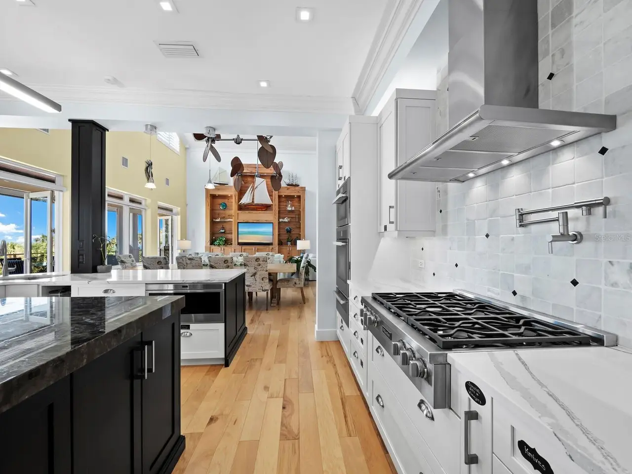 Welcome to this extraordinary Gulf-front estate located in one of Siesta Key’s most exclusive enclaves. Situated on a full acre in the private Sandy Hook community, this fully renovated, turnkey residence offers over 5,000 square feet of refined living space and more than 3,000 square feet of covered outdoor areas, all just a short stroll from Siesta Key Village and with direct access to a private community beach. Inside, the layout features five en-suite bedrooms, two powder baths, a dedicated office, and a three-car garage with beach cruisers and kayaks included. Floor-to-ceiling Andersen impact windows frame panoramic Gulf views, while rich finishes like Sapele mahogany siding, IPE hardwood decking, and a custom Pecky Cypress entertainment system reflect the home’s elevated craftsmanship. The chef’s kitchen is a showpiece, centered around a Labradorite Lumarian Blue granite island imported from Brazil, with Wolf, Miele, and Sub-Zero appliances throughout. The spa-inspired primary suite includes a waterfall feature wall, dual curbless shower, lighted soaking tub, and Toto smart toilets. A private elevator and full smart-home system ensure ease and efficiency. Outdoor living is exceptional, with a heated saltwater pool and Jacuzzi, a fully equipped summer kitchen, a covered outdoor living room with fireplace and TV, a poolside theater with dual fireplaces and TVs, and a sunset-facing gas fire pit. The professionally designed $1M+ tropical landscape includes advanced mosquito-misting and irrigation systems for effortless maintenance. With direct access to a private, resident-only beach and an ideal location just minutes from restaurants, shopping, and entertainment, this one-of-a-kind estate offers a rare opportunity to experience the best of coastal living on Siesta Key. Designed for elevated living and effortless enjoyment, 26 Sandy Hook Road S is more than a home—it is a fully realized Gulf-front sanctuary.