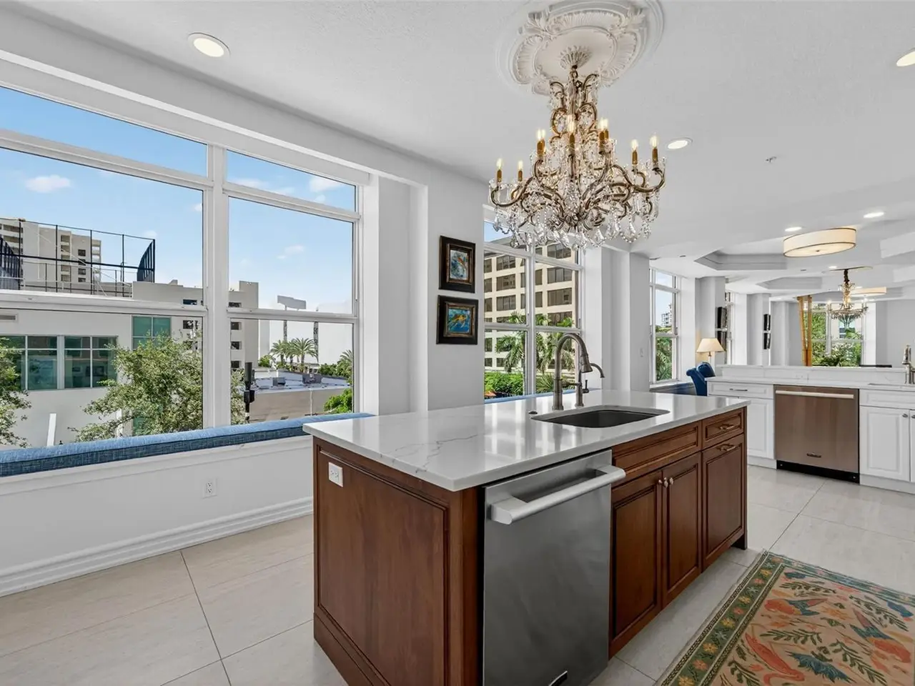 A luxurious piece of Sarasota’s history, combining timeless architecture, generous space, and modern upgrades in the heart of downtown. This rarely available full-floor residence at the iconic Orange Blossom Tower, built in 1926, one of downtown Sarasota’s most prestigious addresses at Main Street and Palm Avenue. Occupying the entire third floor, this 3-bedroom, 3-bath, 3,974-square-foot home offers a vibrant urban lifestyle just steps from fine dining, art galleries, boutiques, Bayfront Park, the marina, and Sarasota’s renowned theater district. From your private elevator, a grand foyer opens to a gallery hallway showcasing an antique brick wine cellar with a custom iron door, leading into expansive living and dining spaces adorned with bespoke millwork, a fireplace, octagonal ceiling detail, and oversized 7’ windows that flood the interiors with natural light. Two private terraces, including an oversized 13’ x 46’ retreat, to extend your living space outdoors for al fresco dining, and relaxation. The professionally enhanced kitchen is a chef’s dream, featuring quartz countertops, a Wolf 6-burner gas range, two Signature dishwashers, built-in refrigerator, beverage refrigerator, and a crystal chandelier over the center island. Condo features a water treatment system with reverse osmosis. Other recent updates include new AC units with infrared (2022 and 2023), new hot water heater (2024), new engineered wood flooring and carpet, a remodeled bath, new electrical outlets, electronic shades throughout, quartz window sills, and LED surface-mount fixtures and dimmers, The spacious owner’s suite offers large windows, 17’7” x 18’ antique-brick terrace overlooking tree-lined Palm Avenue, and an elegantly updated bath with dual vanities, walk-in shower, soaking tub, and custom closet system. Two guest suites are tucked into a private wing, each with a full bath and new custom closets—one opens directly to the expansive terrace—while a versatile large den makes an ideal office, reading room, or potential fourth bedroom with views of Sarasota Bay and stunning sunsets. Residents of Orange Blossom Tower enjoy concierge service, secure lobby entry, two deeded garage spaces, and use of the pool, spa, and fitness center at neighboring 1350 Main, along with additional storage room on the terrace and second floor. Importantly, the building’s Structural Integrity Reserve Study (SIRS) and Financial Reserve Study (FRS) were both completed in 2024, ensuring full compliance with current Florida regulations and giving buyers added peace of mind.