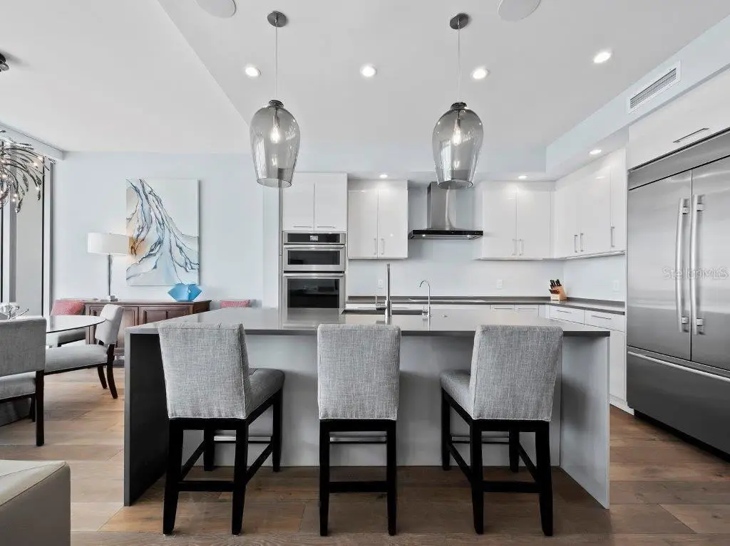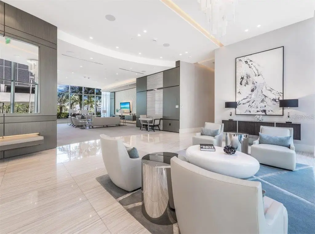 A fabulously appointed designer residence in a coveted, amenity-rich building, VUE 703 offers the pinnacle of luxury living in the heart of Sarasota's cosmopolitan downtown. Now available turnkey with luxury furnishings and accessories. Renowned for its exceptional resort-style living and elegant contemporary style, VUE is an incredible high-rise building with enviably curated amenities that extend from the valet service and concierge to plush resident lounges and facilities, all within steps of Sarasota's world-class cultural scene and thriving hub of shops, restaurants, and galleries. This elevated residence with private elevator access is a spacious retreat that blends the sleek modern style of the building with exquisite design elements that lend warmth and enhance the luxurious comfort. Premium upgrades include elegant wide-plank wood floors, designer lighting and decor-both by Creston; high-end built-in audio video system, water filtration by Aqua, while tall 10" ceilings throughout accentuate absolutely stunning water views. From the front door, unobstructed site lines showcase spectacular southwest vistas across Sarasota Bay and the keys to the Gulf of Mexico beyond. Thoughtfully designed to maximize the views, the home features an airy, open layout with a full wall of floor-to-ceiling sliding impact glass doors that extend the central living space to a deep private terrace with glass railings. Overlooking the dining and central living spaces, the gourmet kitchen with beautiful Italian cabinetry and stainless appliances wraps around a large quartz-clad island with abundant prep and storage space as well as additional seating for guests. The open plan living room and dining area are perfect for entertaining, flowing seamlessly to a private terrace that spans nearly 300 square feet with protective shade and picture-perfect views overlooking the waterfront and marina. The owner's suite enjoys its own floor-to-ceiling wall of windows for spectacular water and sunset views, with a resort-style bathroom that features extra-long double vanity, enviable storage, glass-enclosed walk-in shower, and separate water closet. Two separate walk-in closets add to the owner's luxury. Near the home's entry, a spacious second bedroom offers en suite comfort and ample closet space, and a separate den accommodates a private office or media lounge. The additional half bath is luxuriously outfitted with haute design elements including crystal sconces and a carved onyx sink. A generous, separate utility room with washer and dryer adds to the exceptional in-home conveniences. The residence comes with deeded, secure storage space and two assigned parking spaces that are gated and enclosed. Ideally located across from Sarasota's celebrated waterfront and within steps of Downtown's cosmopolitan core, VUE is a highly sought after address with a dazzling array of premium amenities including heated pool and spa with a spectacular pool deck that encompasses multiple lounge areas, fire pit, and enormous pergola with gourmet grill station. Additional amenities include fitness center, dedicated pet recreational area, concierge and security. Offered by the original owners, meticulously maintained and upgraded, VUE 703 is a valuable opportunity to enjoy a lifestyle of ultimate comfort and style.