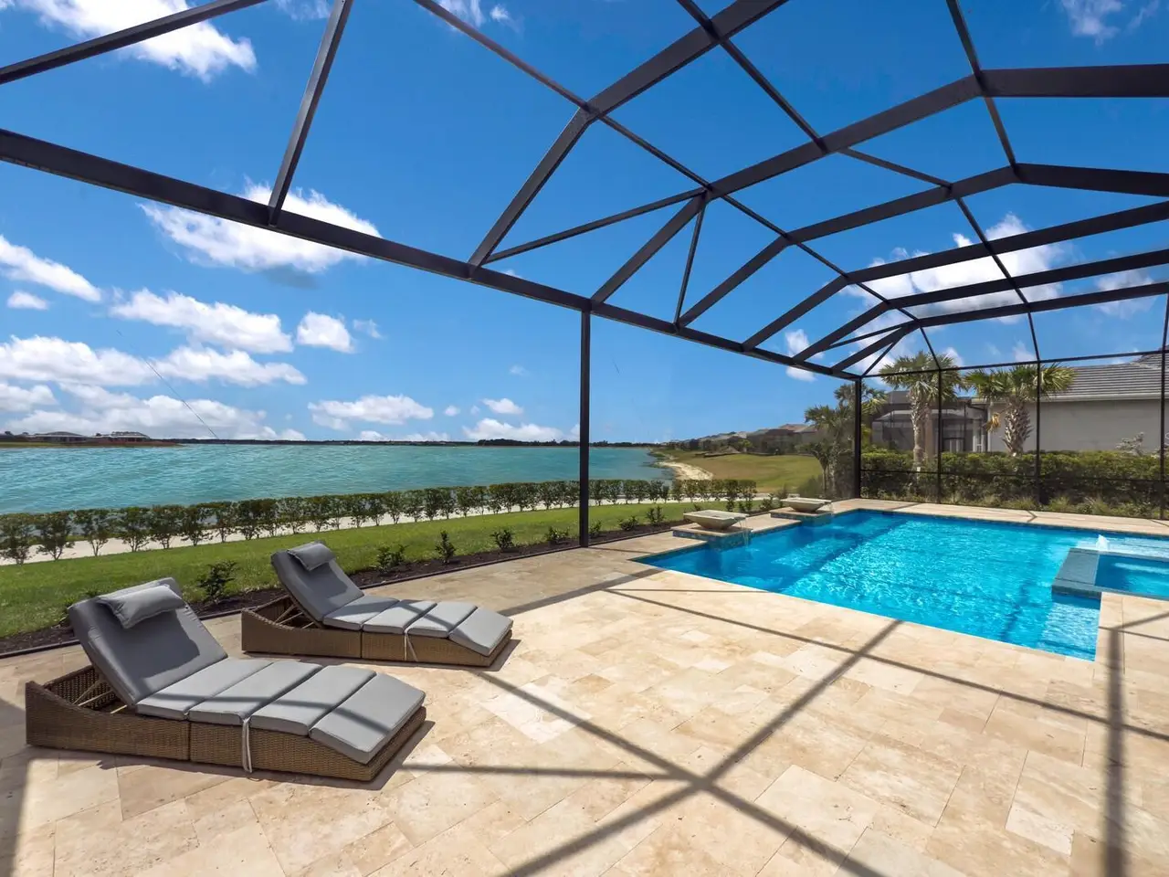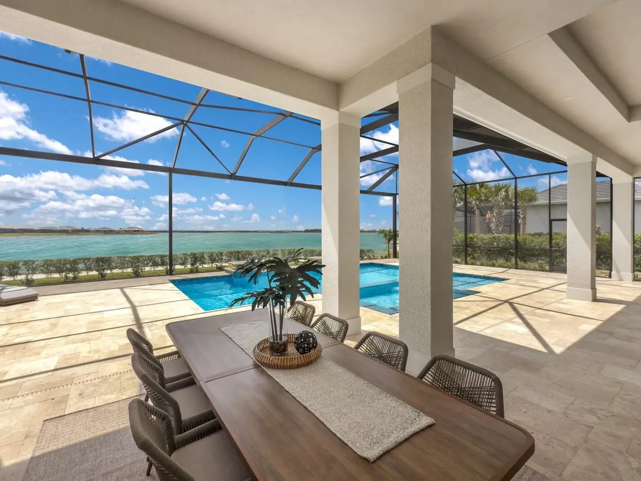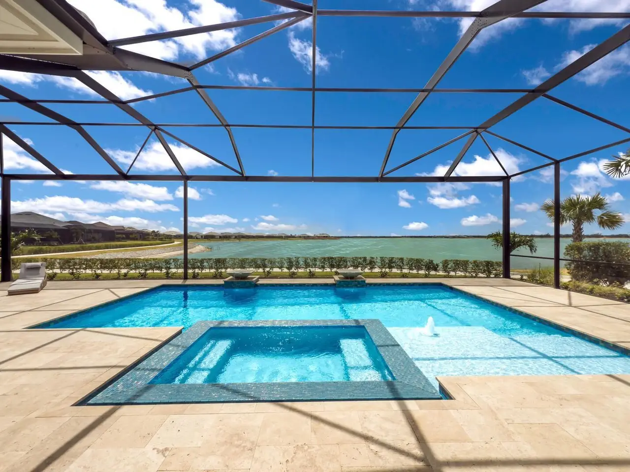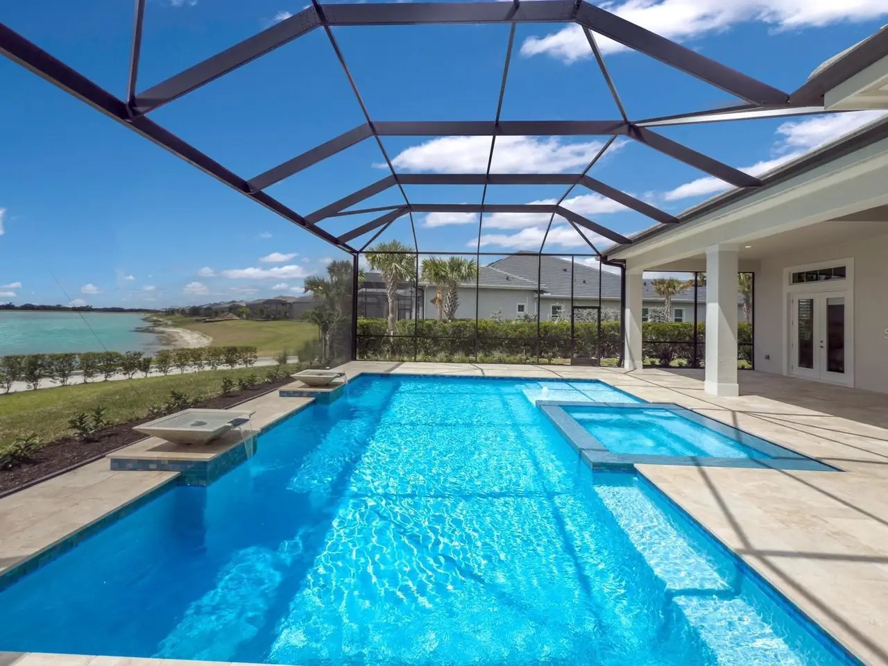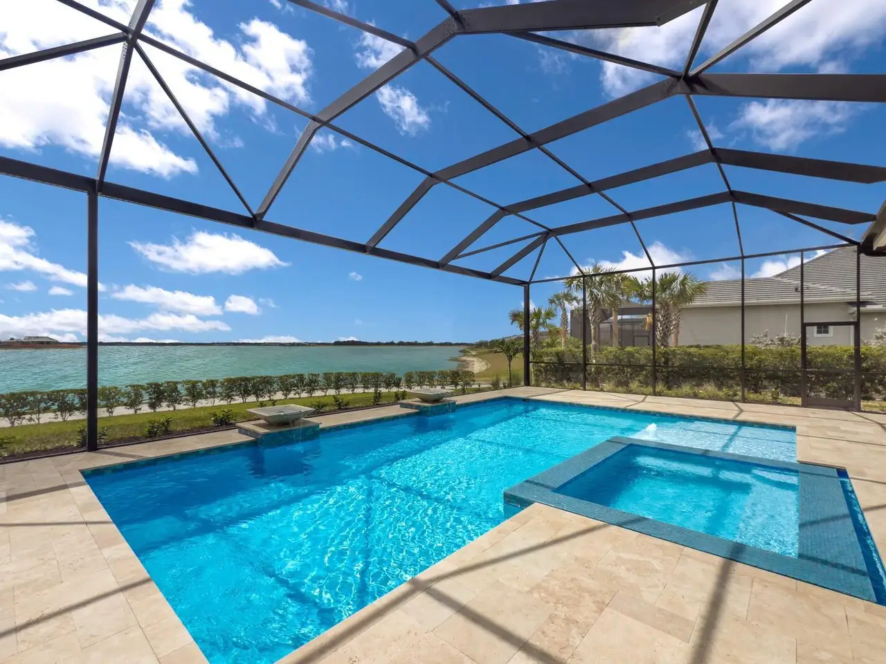 Superior long lake views and exceptional open indoor/outdoor living defines this Madison II residence built in 2024 positioned on a breathtaking southerly waterfront setting in Wild Blue at Lakewood Ranch showcasing generously sized spaces, vibrant clean lines, volume ceilings, and the sought-after far away distance from the new construction activity. A brilliantly planned layout, this three bedroom residence boasts 3,054 square feet of one-story design, a premium lake view, and a vastly extensive outdoor area with abundant open and under cover spaces, travertine deck scape, pre-plumbed for an outdoor kitchen, panoramic screen, and a PebbleTec heated pool/spa with sun shelf just completed in 2025. Seamlessly connecting this resort-styled lanai to the oversized great room, kitchen, and dining areas are the 10-foot IMPACT GLASS doors into an invitingly stylish living area adorned with plank porcelain tile and soaring ceilings. Chefs and guests alike will delight in the beautifully appointed kitchen with stainless steel JennAir appliances, induction cooktop (and also plumbed for natural gas), sprawling quartz counters, oversized island, wood cabinetry, and a walk-in pantry. Relax and unwind in the elegant owner’s retreat positioned on a private wing, offering two oversized walk-in closets, direct lanai access via French doors, and a luxuriously appointed spa-like bath with separate vanities, oversized shower and separate soaking tub. Overnight visitors will be right at home in the two additional guest ensuites, each with their own private full baths. Behind double French doors is a voluminous bonus room, also with its own private full bath offering a multiple array of flex living options. Additionally the residence offers a spacious study/den off the great room with double entry doors and soaring 15-foot ceilings. Other highlights of this 4,770 total square foot newly built residence includes a conveniently located half bath off the great room, impact windows/doors/sliders, perfectly sized laundry room with cabinetry and sink, gutters all around home, reverse osmosis in the kitchen, whole home water softener, an oversized three car garage, and even lawn and landscape maintenance is included. Wild Blue will provide its residents a resort-styled 25,000 square foot clubhouse with and an on-site lifestyle director boasting concierge-level amenities to include a fitness center with gym and studio, golf simulator and putting green, dining options for both indoors and out, and a theatre facility. Wild Blue residents also have access to the recently completed hub at Midway Park that offers Wild Blue and Shellstone residents tennis, pickleball, basketball courts, kayak launch, walking trails, dog parks, playground, pro shop, and pavilions. Ideally located in Waterside, renowned for its vibrant Lakewood Ranch lifestyle surrounded by dining, shopping, polo, golf, community events, Waterside Place, UTC Mall, and minutes to SRQ Airport and the beaches of Sarasota.