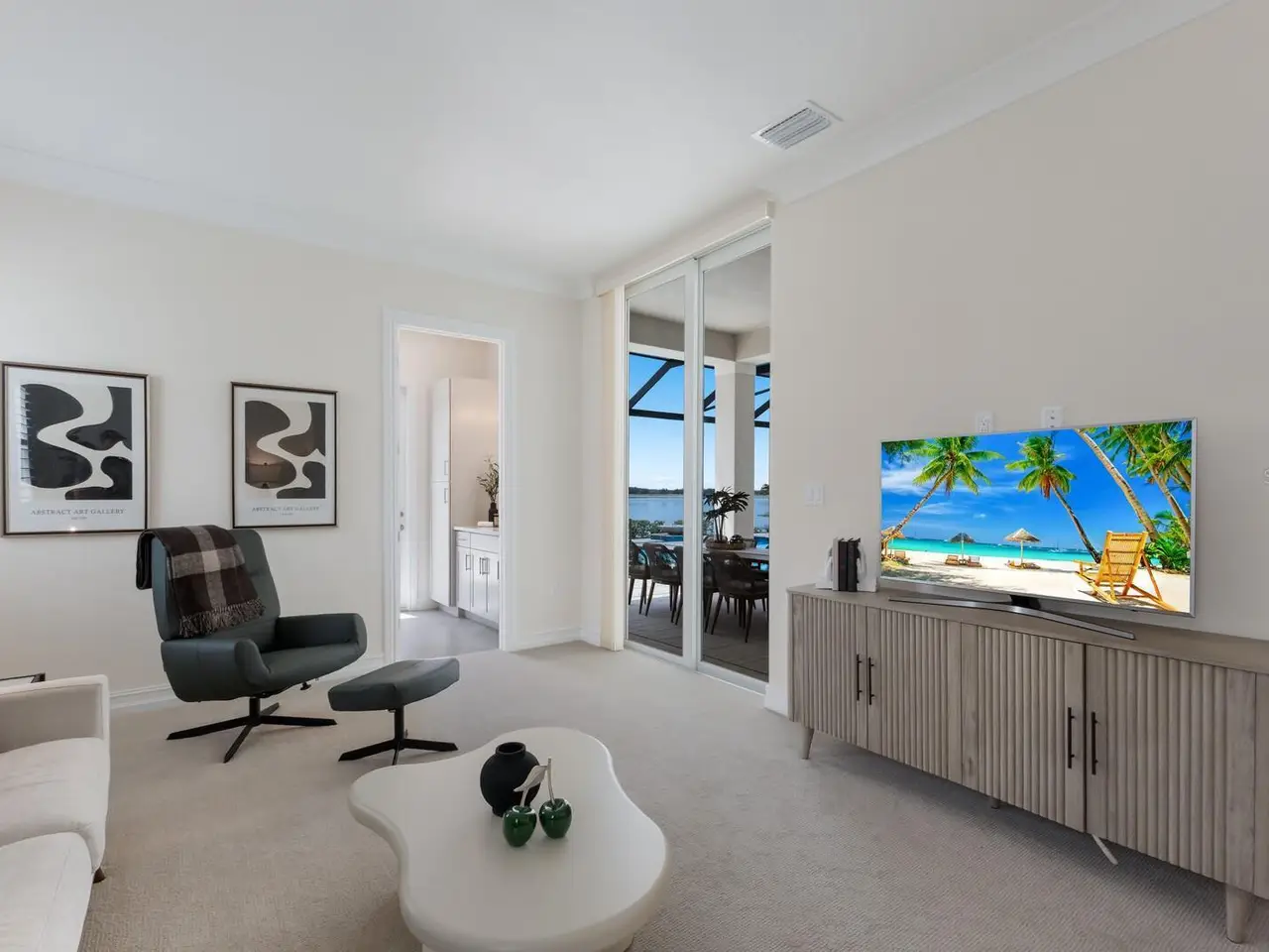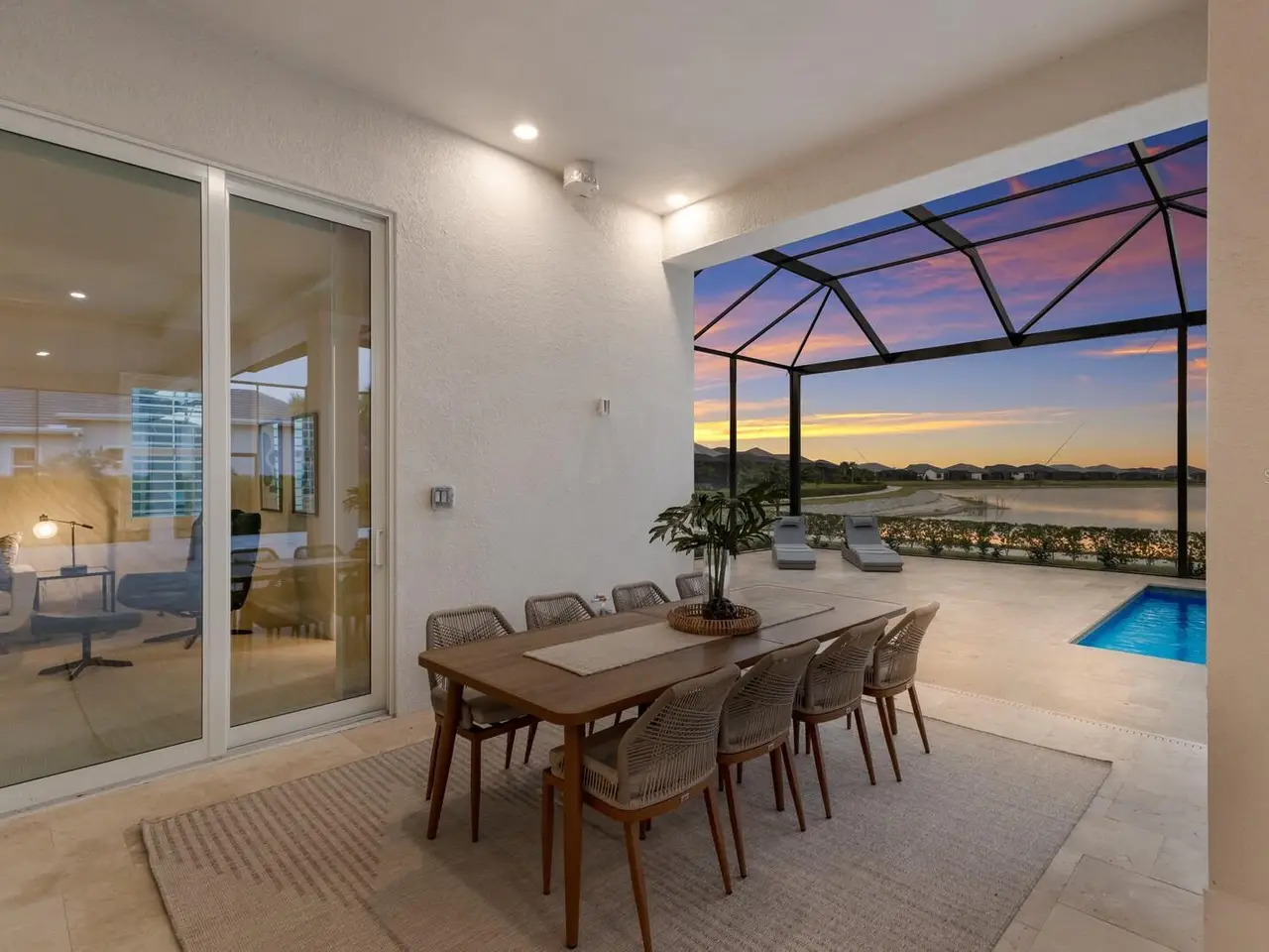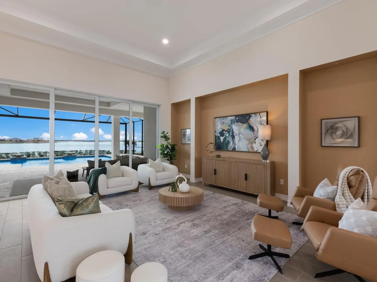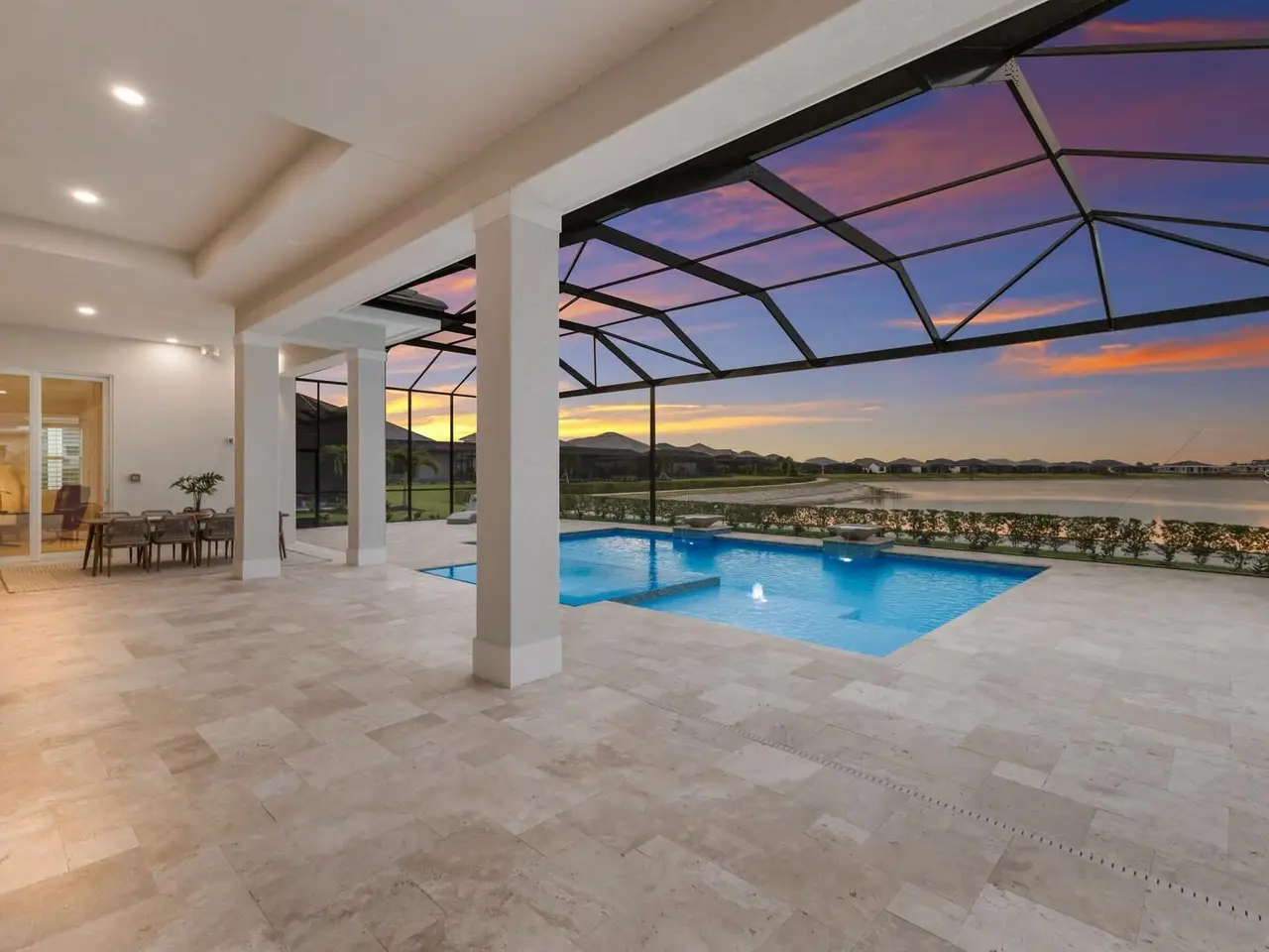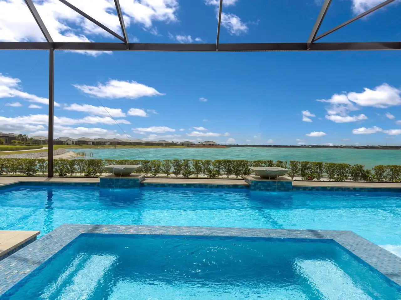 Superior long lake views and exceptional open indoor/outdoor living defines this Madison II residence built in 2024 positioned on a breathtaking southerly waterfront setting in Wild Blue at Lakewood Ranch showcasing generously sized spaces, vibrant clean lines, volume ceilings, and the sought-after far away distance from the new construction activity. A brilliantly planned layout, this three bedroom residence boasts 3,054 square feet of one-story design, a premium lake view, and a vastly extensive outdoor area with abundant open and under cover spaces, travertine deck scape, pre-plumbed for an outdoor kitchen, panoramic screen, and a PebbleTec heated pool/spa with sun shelf just completed in 2025. Seamlessly connecting this resort-styled lanai to the oversized great room, kitchen, and dining areas are the 10-foot IMPACT GLASS doors into an invitingly stylish living area adorned with plank porcelain tile and soaring ceilings. Chefs and guests alike will delight in the beautifully appointed kitchen with stainless steel JennAir appliances, induction cooktop (and also plumbed for natural gas), sprawling quartz counters, oversized island, wood cabinetry, and a walk-in pantry. Relax and unwind in the elegant owner’s retreat positioned on a private wing, offering two oversized walk-in closets, direct lanai access via French doors, and a luxuriously appointed spa-like bath with separate vanities, oversized shower and separate soaking tub. Overnight visitors will be right at home in the two additional guest ensuites, each with their own private full baths. Behind double French doors is a voluminous bonus room, also with its own private full bath offering a multiple array of flex living options. Additionally the residence offers a spacious study/den off the great room with double entry doors and soaring 15-foot ceilings. Other highlights of this 4,770 total square foot newly built residence includes a conveniently located half bath off the great room, impact windows/doors/sliders, perfectly sized laundry room with cabinetry and sink, gutters all around home, reverse osmosis in the kitchen, whole home water softener, an oversized three car garage, and even lawn and landscape maintenance is included. Wild Blue will provide its residents a resort-styled 25,000 square foot clubhouse with and an on-site lifestyle director boasting concierge-level amenities to include a fitness center with gym and studio, golf simulator and putting green, dining options for both indoors and out, and a theatre facility. Wild Blue residents also have access to the recently completed hub at Midway Park that offers Wild Blue and Shellstone residents tennis, pickleball, basketball courts, kayak launch, walking trails, dog parks, playground, pro shop, and pavilions. Ideally located in Waterside, renowned for its vibrant Lakewood Ranch lifestyle surrounded by dining, shopping, polo, golf, community events, Waterside Place, UTC Mall, and minutes to SRQ Airport and the beaches of Sarasota.