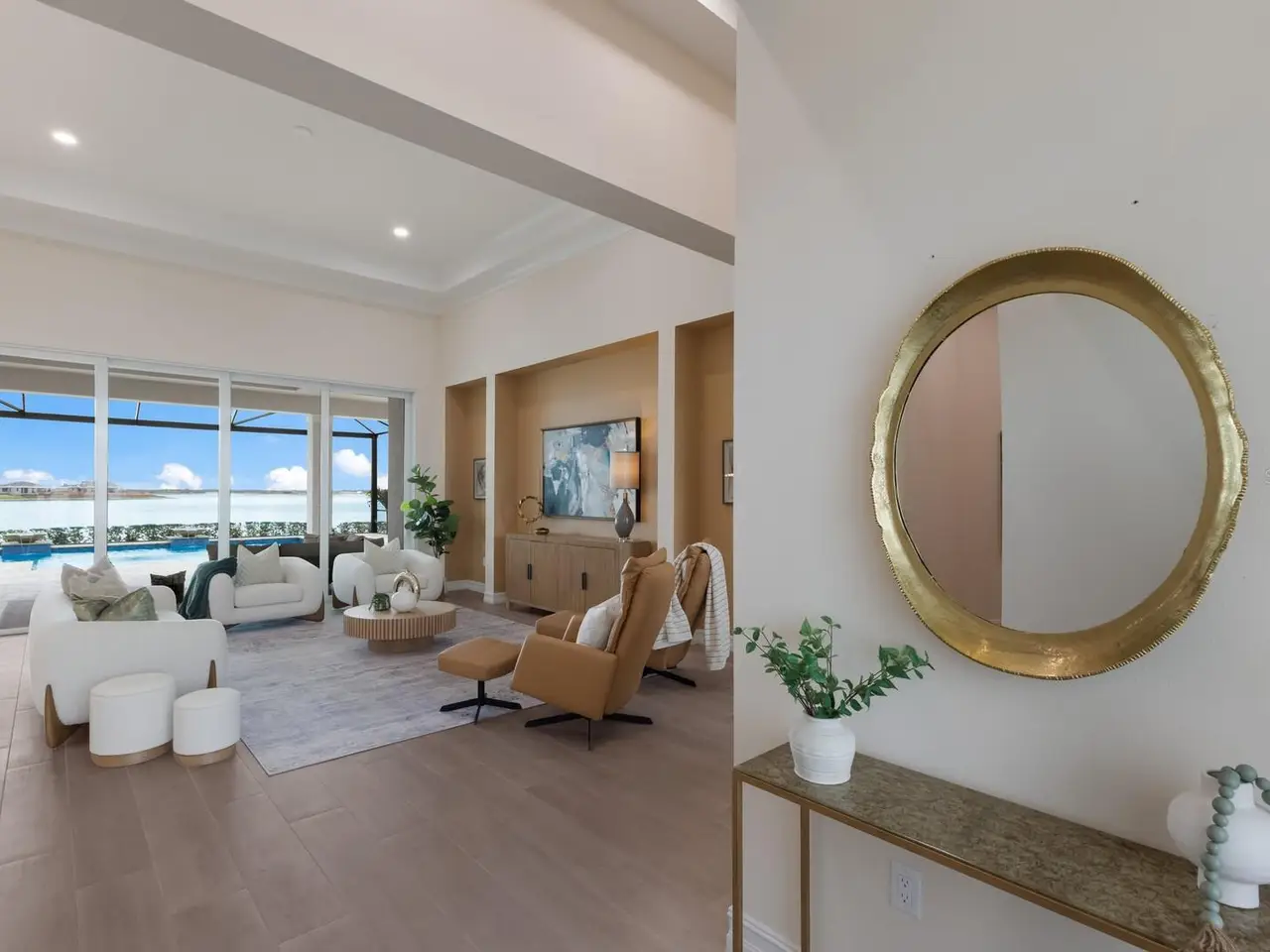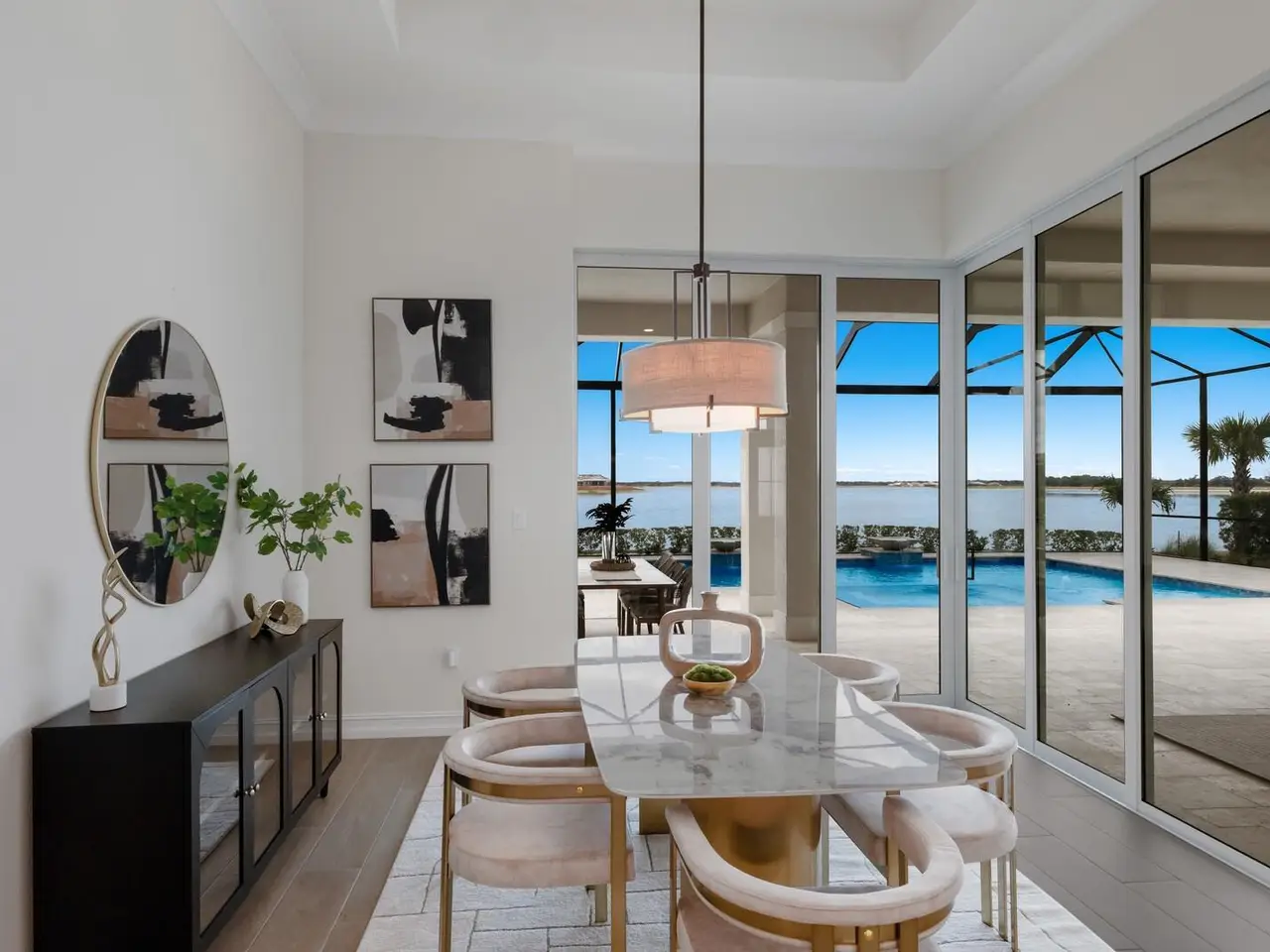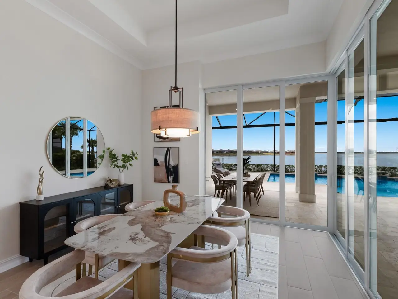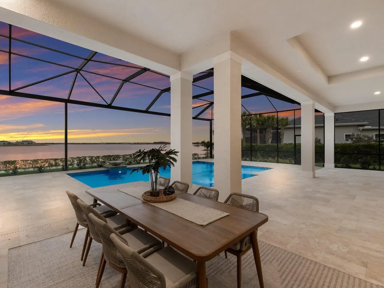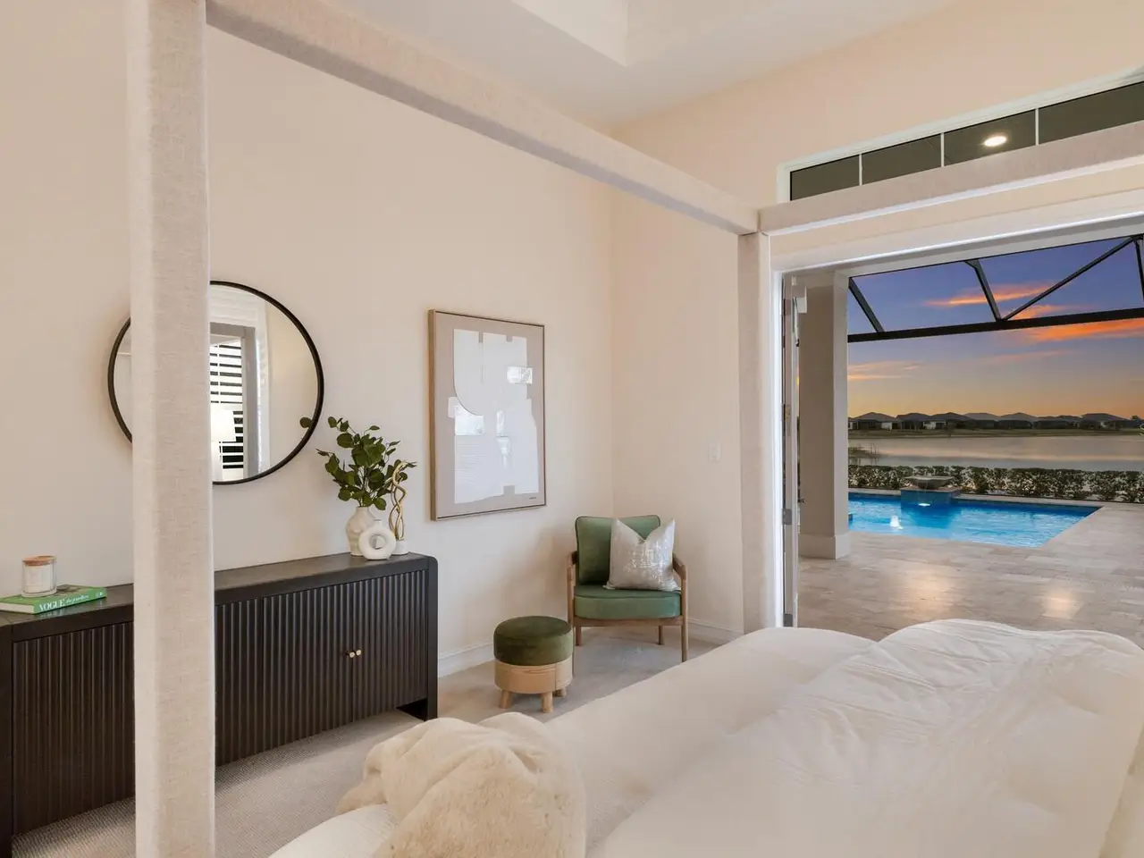 Superior long lake views and exceptional open indoor/outdoor living defines this Madison II residence built in 2024 positioned on a breathtaking southerly waterfront setting in Wild Blue at Lakewood Ranch showcasing generously sized spaces, vibrant clean lines, volume ceilings, and the sought-after far away distance from the new construction activity. A brilliantly planned layout, this three bedroom residence boasts 3,054 square feet of one-story design, a premium lake view, and a vastly extensive outdoor area with abundant open and under cover spaces, travertine deck scape, pre-plumbed for an outdoor kitchen, panoramic screen, and a PebbleTec heated pool/spa with sun shelf just completed in 2025. Seamlessly connecting this resort-styled lanai to the oversized great room, kitchen, and dining areas are the 10-foot IMPACT GLASS doors into an invitingly stylish living area adorned with plank porcelain tile and soaring ceilings. Chefs and guests alike will delight in the beautifully appointed kitchen with stainless steel JennAir appliances, induction cooktop (and also plumbed for natural gas), sprawling quartz counters, oversized island, wood cabinetry, and a walk-in pantry. Relax and unwind in the elegant owner’s retreat positioned on a private wing, offering two oversized walk-in closets, direct lanai access via French doors, and a luxuriously appointed spa-like bath with separate vanities, oversized shower and separate soaking tub. Overnight visitors will be right at home in the two additional guest ensuites, each with their own private full baths. Behind double French doors is a voluminous bonus room, also with its own private full bath offering a multiple array of flex living options. Additionally the residence offers a spacious study/den off the great room with double entry doors and soaring 15-foot ceilings. Other highlights of this 4,770 total square foot newly built residence includes a conveniently located half bath off the great room, impact windows/doors/sliders, perfectly sized laundry room with cabinetry and sink, gutters all around home, reverse osmosis in the kitchen, whole home water softener, an oversized three car garage, and even lawn and landscape maintenance is included. Wild Blue will provide its residents a resort-styled 25,000 square foot clubhouse with and an on-site lifestyle director boasting concierge-level amenities to include a fitness center with gym and studio, golf simulator and putting green, dining options for both indoors and out, and a theatre facility. Wild Blue residents also have access to the recently completed hub at Midway Park that offers Wild Blue and Shellstone residents tennis, pickleball, basketball courts, kayak launch, walking trails, dog parks, playground, pro shop, and pavilions. Ideally located in Waterside, renowned for its vibrant Lakewood Ranch lifestyle surrounded by dining, shopping, polo, golf, community events, Waterside Place, UTC Mall, and minutes to SRQ Airport and the beaches of Sarasota.