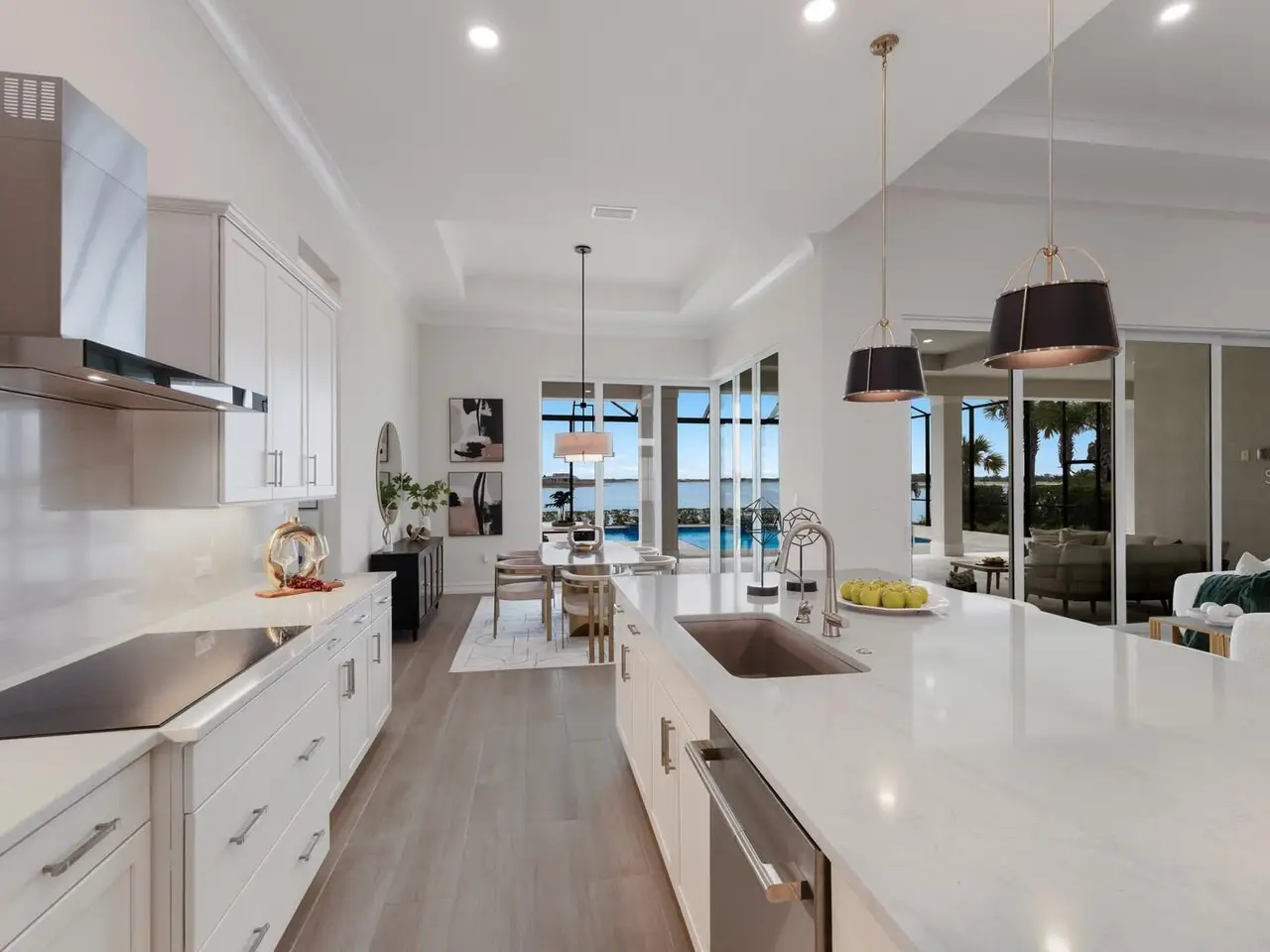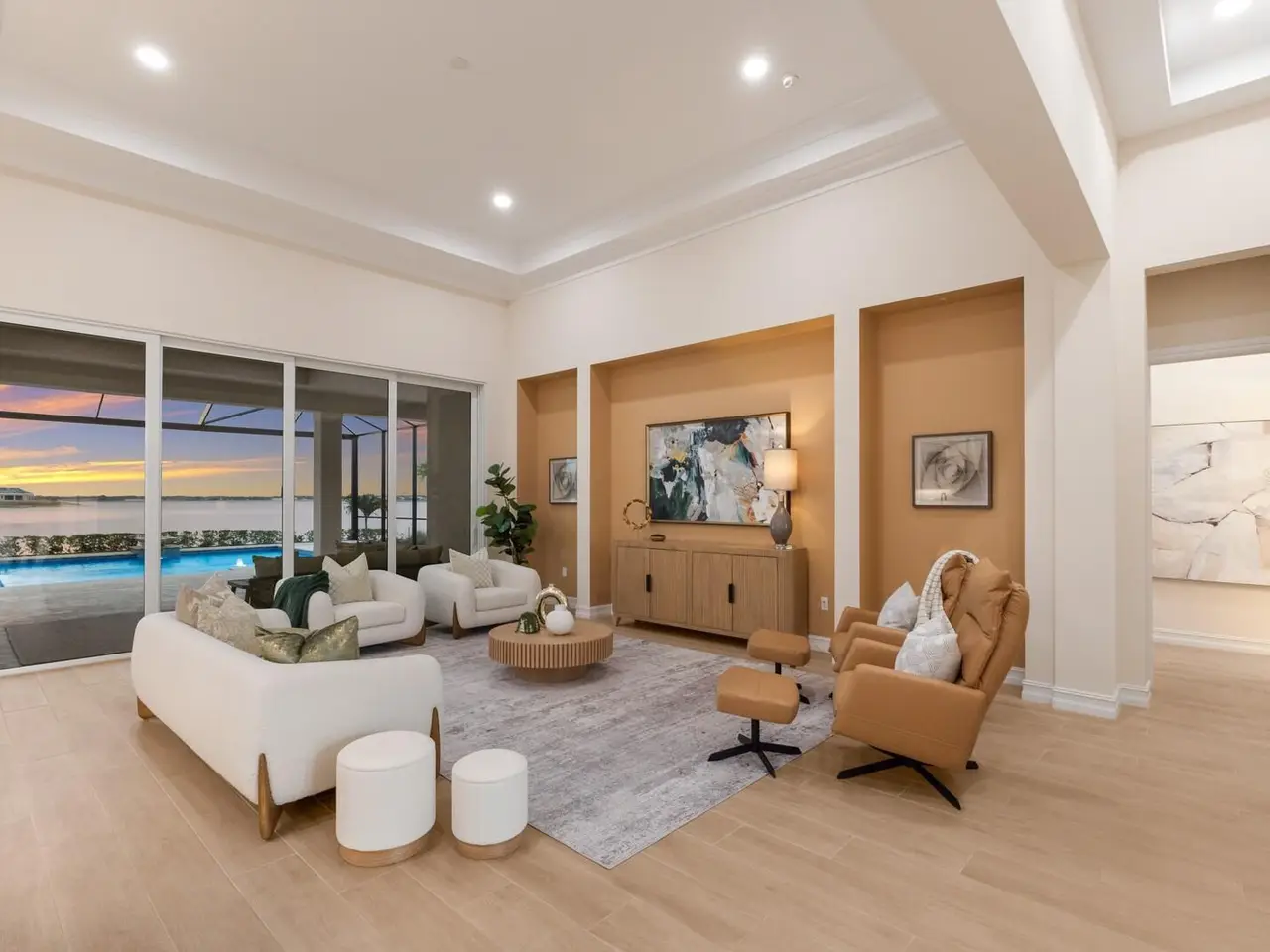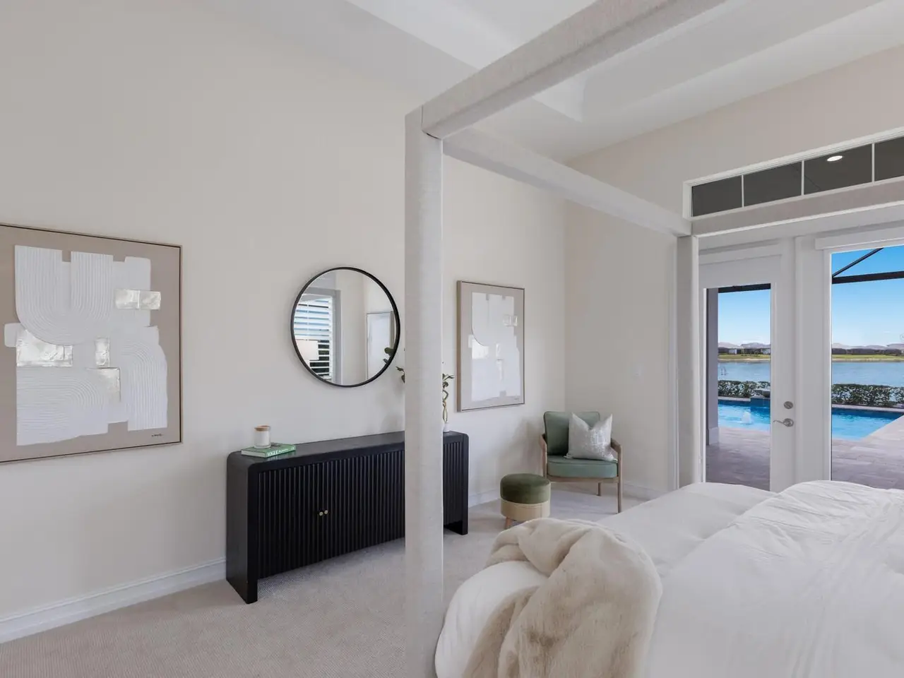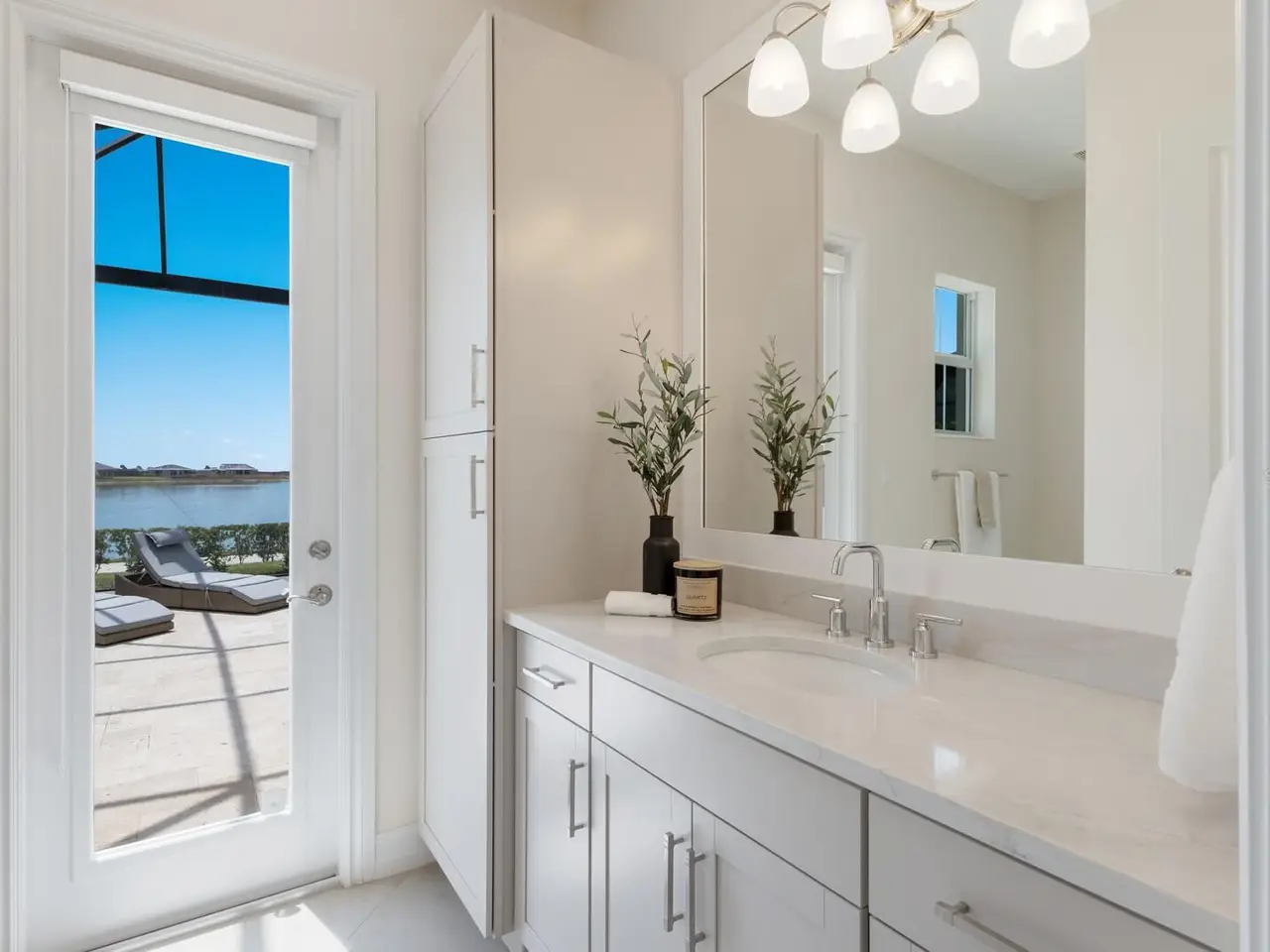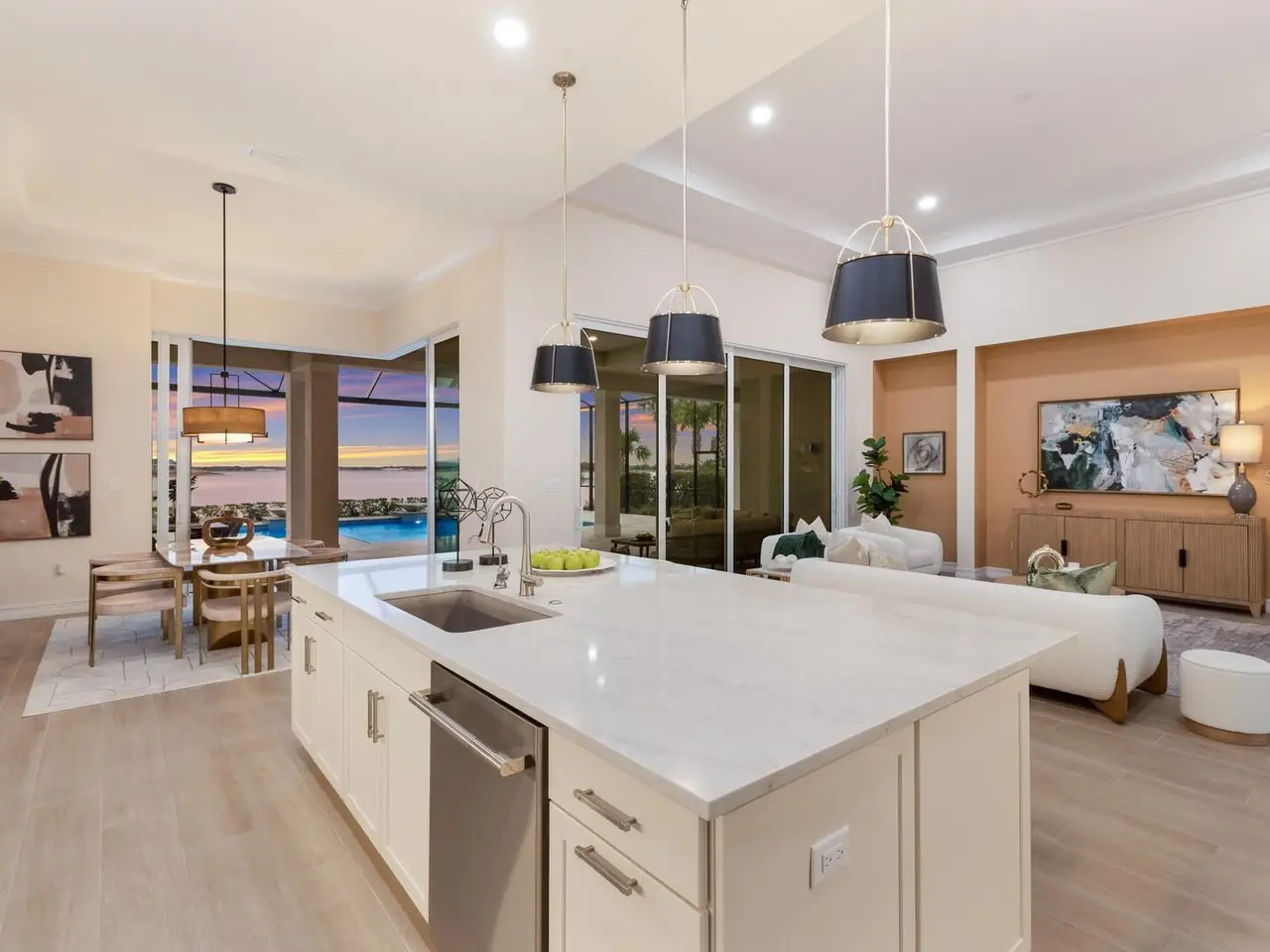 Superior long lake views and exceptional open indoor/outdoor living defines this Madison II residence built in 2024 positioned on a breathtaking southerly waterfront setting in Wild Blue at Lakewood Ranch showcasing generously sized spaces, vibrant clean lines, volume ceilings, and the sought-after far away distance from the new construction activity. A brilliantly planned layout, this three bedroom residence boasts 3,054 square feet of one-story design, a premium lake view, and a vastly extensive outdoor area with abundant open and under cover spaces, travertine deck scape, pre-plumbed for an outdoor kitchen, panoramic screen, and a PebbleTec heated pool/spa with sun shelf just completed in 2025. Seamlessly connecting this resort-styled lanai to the oversized great room, kitchen, and dining areas are the 10-foot IMPACT GLASS doors into an invitingly stylish living area adorned with plank porcelain tile and soaring ceilings. Chefs and guests alike will delight in the beautifully appointed kitchen with stainless steel JennAir appliances, induction cooktop (and also plumbed for natural gas), sprawling quartz counters, oversized island, wood cabinetry, and a walk-in pantry. Relax and unwind in the elegant owner’s retreat positioned on a private wing, offering two oversized walk-in closets, direct lanai access via French doors, and a luxuriously appointed spa-like bath with separate vanities, oversized shower and separate soaking tub. Overnight visitors will be right at home in the two additional guest ensuites, each with their own private full baths. Behind double French doors is a voluminous bonus room, also with its own private full bath offering a multiple array of flex living options. Additionally the residence offers a spacious study/den off the great room with double entry doors and soaring 15-foot ceilings. Other highlights of this 4,770 total square foot newly built residence includes a conveniently located half bath off the great room, impact windows/doors/sliders, perfectly sized laundry room with cabinetry and sink, gutters all around home, reverse osmosis in the kitchen, whole home water softener, an oversized three car garage, and even lawn and landscape maintenance is included. Wild Blue will provide its residents a resort-styled 25,000 square foot clubhouse with and an on-site lifestyle director boasting concierge-level amenities to include a fitness center with gym and studio, golf simulator and putting green, dining options for both indoors and out, and a theatre facility. Wild Blue residents also have access to the recently completed hub at Midway Park that offers Wild Blue and Shellstone residents tennis, pickleball, basketball courts, kayak launch, walking trails, dog parks, playground, pro shop, and pavilions. Ideally located in Waterside, renowned for its vibrant Lakewood Ranch lifestyle surrounded by dining, shopping, polo, golf, community events, Waterside Place, UTC Mall, and minutes to SRQ Airport and the beaches of Sarasota.
