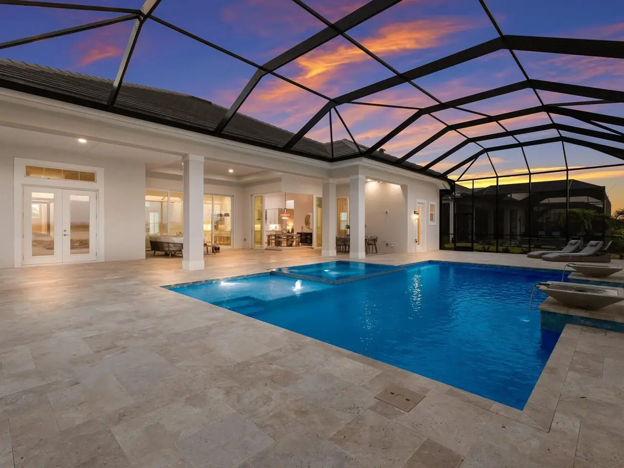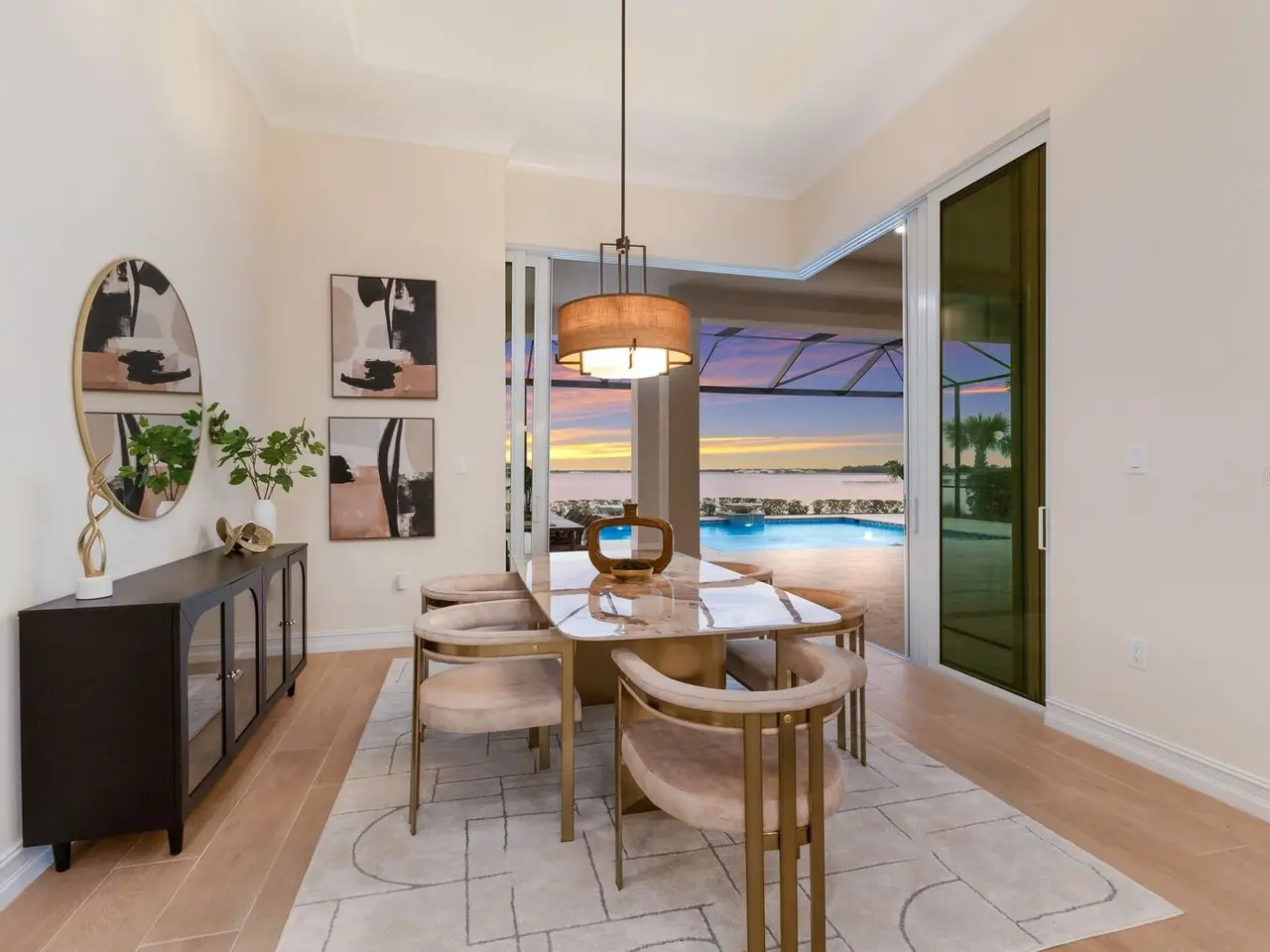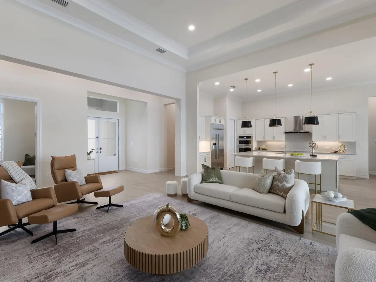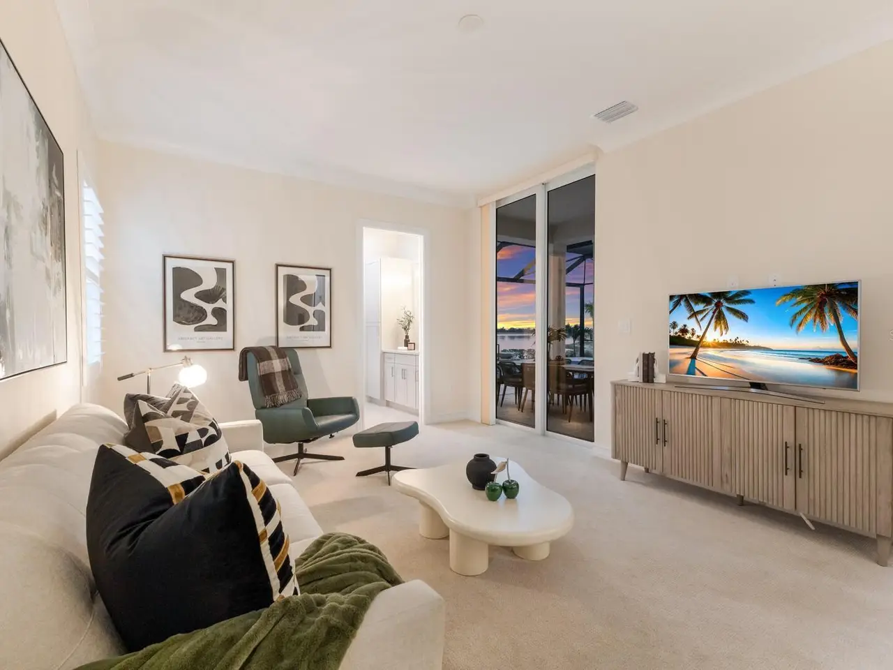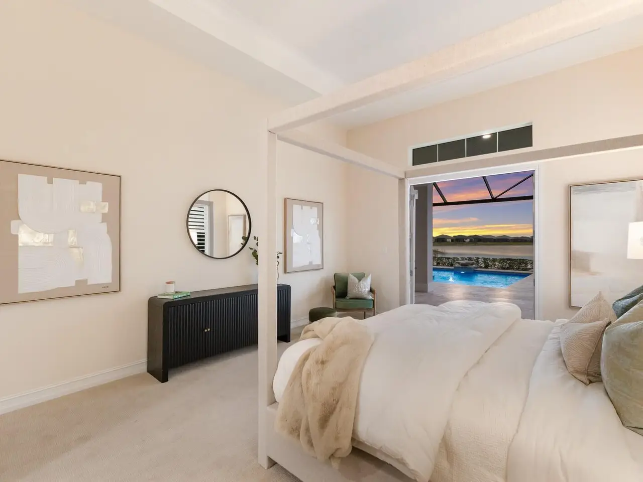 Superior long lake views and exceptional open indoor/outdoor living defines this Madison II residence built in 2024 positioned on a breathtaking southerly waterfront setting in Wild Blue at Lakewood Ranch showcasing generously sized spaces, vibrant clean lines, volume ceilings, and the sought-after far away distance from the new construction activity. A brilliantly planned layout, this three bedroom residence boasts 3,054 square feet of one-story design, a premium lake view, and a vastly extensive outdoor area with abundant open and under cover spaces, travertine deck scape, pre-plumbed for an outdoor kitchen, panoramic screen, and a PebbleTec heated pool/spa with sun shelf just completed in 2025. Seamlessly connecting this resort-styled lanai to the oversized great room, kitchen, and dining areas are the 10-foot IMPACT GLASS doors into an invitingly stylish living area adorned with plank porcelain tile and soaring ceilings. Chefs and guests alike will delight in the beautifully appointed kitchen with stainless steel JennAir appliances, induction cooktop (and also plumbed for natural gas), sprawling quartz counters, oversized island, wood cabinetry, and a walk-in pantry. Relax and unwind in the elegant owner’s retreat positioned on a private wing, offering two oversized walk-in closets, direct lanai access via French doors, and a luxuriously appointed spa-like bath with separate vanities, oversized shower and separate soaking tub. Overnight visitors will be right at home in the two additional guest ensuites, each with their own private full baths. Behind double French doors is a voluminous bonus room, also with its own private full bath offering a multiple array of flex living options. Additionally the residence offers a spacious study/den off the great room with double entry doors and soaring 15-foot ceilings. Other highlights of this 4,770 total square foot newly built residence includes a conveniently located half bath off the great room, impact windows/doors/sliders, perfectly sized laundry room with cabinetry and sink, gutters all around home, reverse osmosis in the kitchen, whole home water softener, an oversized three car garage, and even lawn and landscape maintenance is included. Wild Blue will provide its residents a resort-styled 25,000 square foot clubhouse with and an on-site lifestyle director boasting concierge-level amenities to include a fitness center with gym and studio, golf simulator and putting green, dining options for both indoors and out, and a theatre facility. Wild Blue residents also have access to the recently completed hub at Midway Park that offers Wild Blue and Shellstone residents tennis, pickleball, basketball courts, kayak launch, walking trails, dog parks, playground, pro shop, and pavilions. Ideally located in Waterside, renowned for its vibrant Lakewood Ranch lifestyle surrounded by dining, shopping, polo, golf, community events, Waterside Place, UTC Mall, and minutes to SRQ Airport and the beaches of Sarasota.