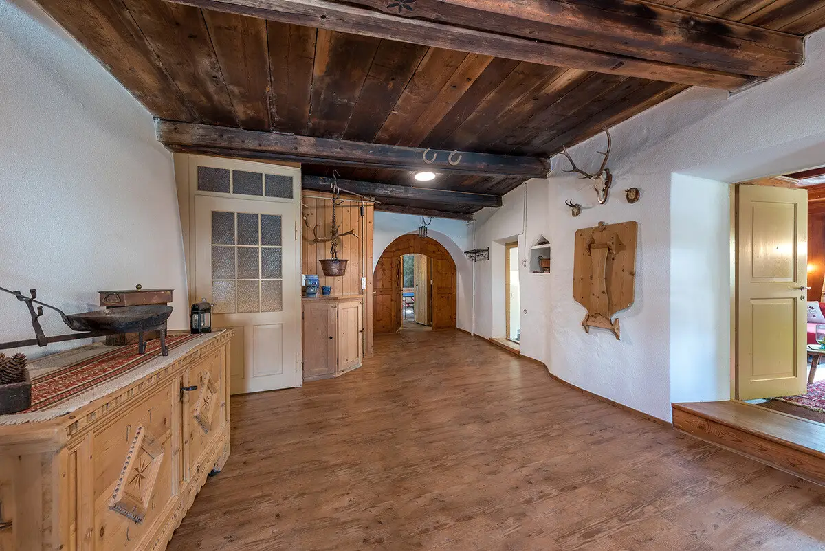 "Guardamunt", a historic Engadine house in Scuol Pradella, combines the charm of the 18th century with contemporary living standards. The two-storey Engadine house, carefully restored, affords a welcoming home with approximately 195 square meters of living space and three bedrooms. Embedded in a quiet and unspoiled natural setting, the house is surrounded by fields, woodlands, and the Inn river. Nature begins right on your doorstep: a cross-country skiing trail runs through the picturesque landscape, perfect for sports enthusiasts looking to actively explore the beauty of the surroundings. For those who prefer peaceful walks or hikes, there are numerous paths leading through the woods and along the Inn, where you can bask in the serene atmosphere. The property: - Charming Engadine house with 4.5 rooms - Quiet location in Pradella/Scuol, surrounded by untamed landscape - Approximately 195m² of living space - Approximately 300m² of additional usable space in the hay barn and basement - Further potential in terms of refurbishment - Two parking spaces