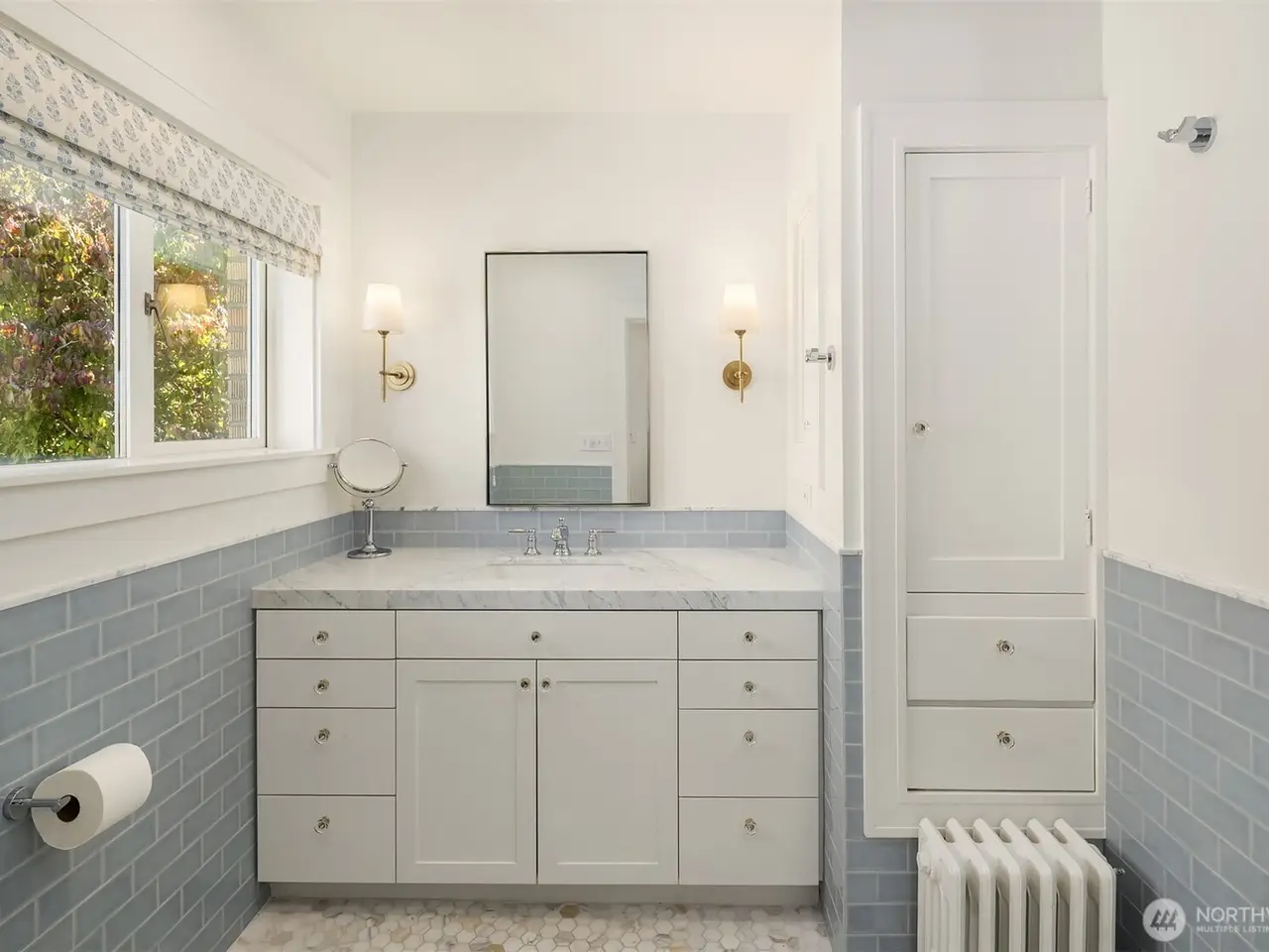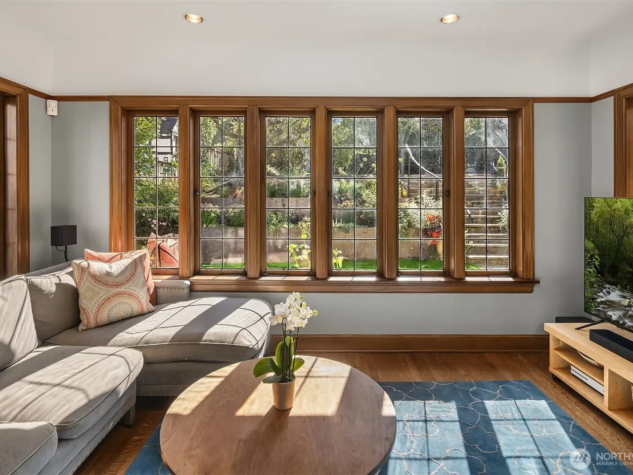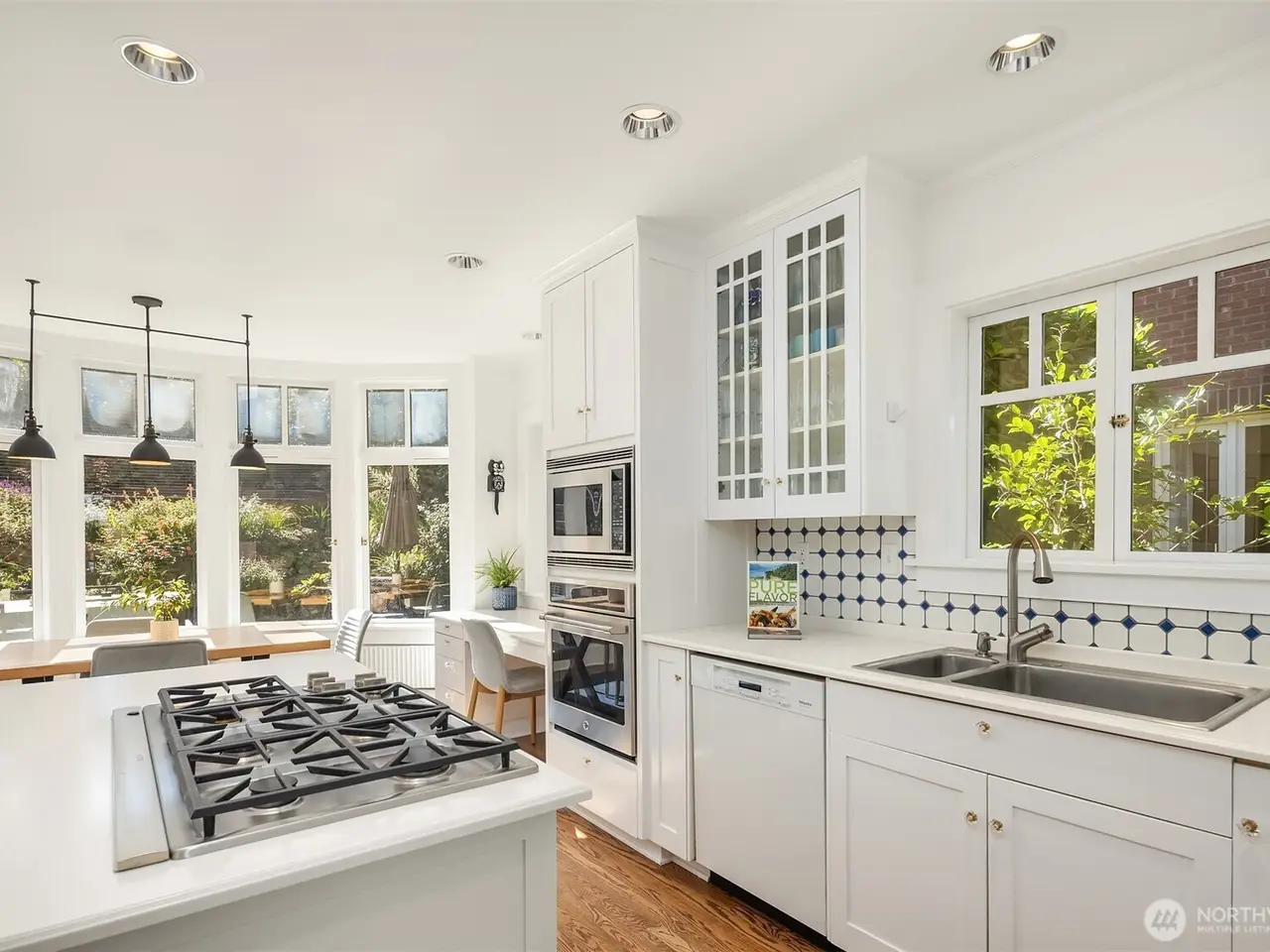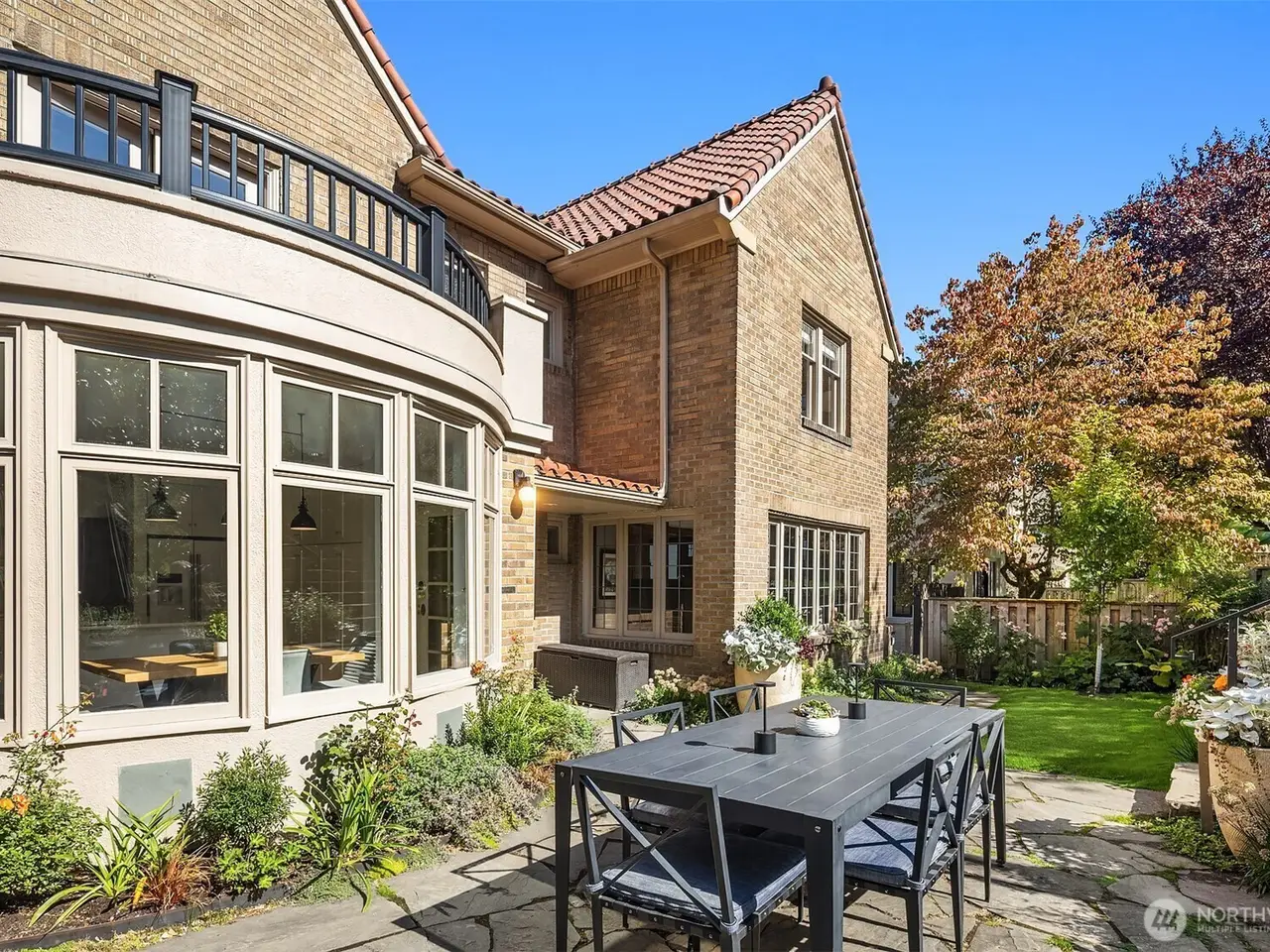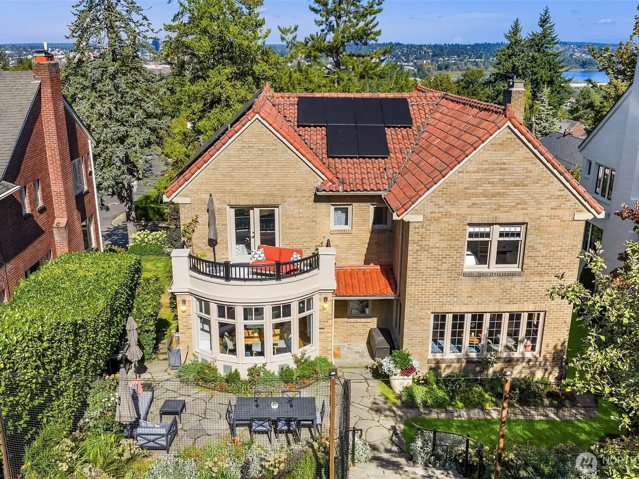 One of N Capitol Hill's finest homes w/ views of the Lake and Cascades! Built in 1926 and exquisitely maintained, this luxury home combines historical details w/ contemporary necessities. Original craftsmanship steeped throughout with tradition. Beautiful leaded glass windows, hardwood floors, Batchelder FP, French Doors, Coved Ceilings, picture moulding, custom built-in shelves & private balcony overlooking professionally landscaped yard w/ elegant gardens, patio & sport court. Exquisite formal LR, DR, chef's kitchen, sunroom & spacious new media center. Plus more - updated radiant heaters, tile roof w/ solar panels, updated electrical panel, 2-car garage w/ EV charger. Close to restaurants, coffee shops, parks, bike trails, UW and freeway.