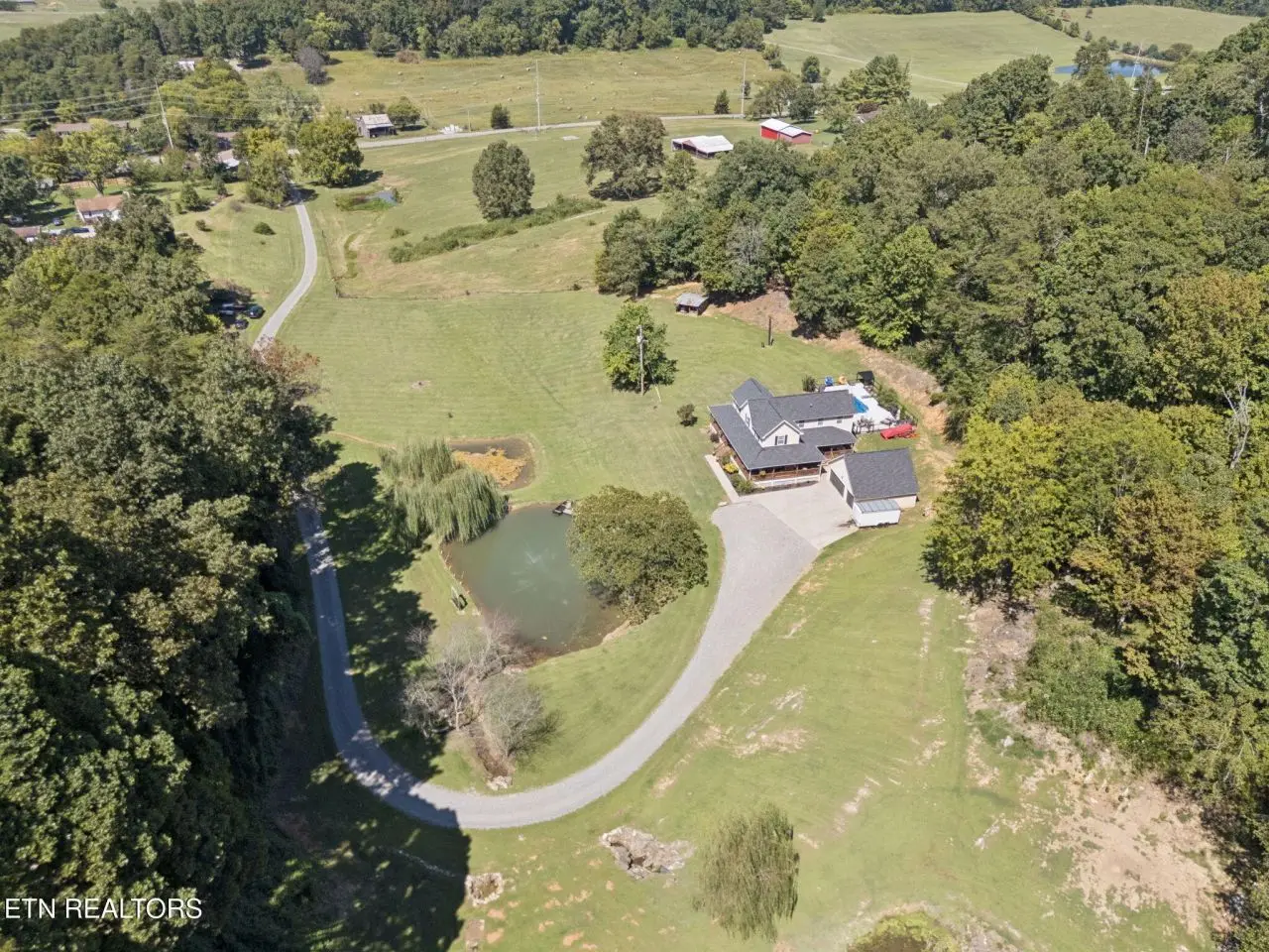 ''Welcome Homestead'' Almost 8 Acres of unrestricted land in between Knoxville and Sevierville; 2960 sq ft home enhanced with a 3/4 wrap around porch; its own spring water with 3 spring fed ponds stocked; small barn; portion cleared with more if need be to expand your pasture for your future homestead. The fiberglass pool with a surround patio awaits your floats. Entering this farmstyle home you are greeted to hardwood flooring; vaulted ceilings; a bedroom on main floor with a living area flowing into the kitchen area offers 3 tone custom maple cabinetry; granite counter tops; composite granite double sink; newer appliances; and a center island; laundry is conveniently located for life ease. Sweeping upstairs on hardwood flooring, there are 3 updated bedrooms including a large master suite area. New roof in 2020; new tankless water heater in 2024; one new heating/cooling unit installed in 2024. There is also a separate septic system with another electric pole for another home. Property is ready for your small farm and peace. 36 miles to Dollywood and University of Tennessee is 25 miles from this oasis of peace. ''Come On Homestead'' Buyer to verify information before making an informed offer.