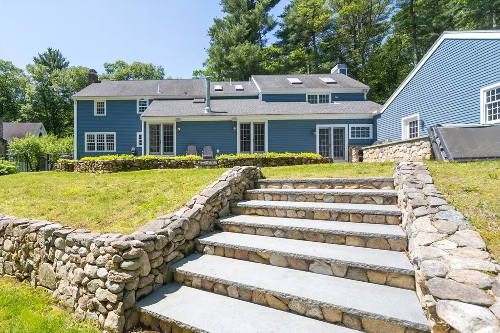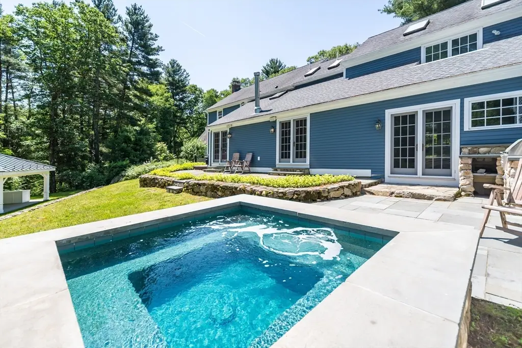 Nestled along a quiet country road, this stunning property offers the perfect blend of rustic charm and refined living. This beautifully crafted home exudes warmth and character. Lots of windows and French doors bring the outside in. The chef's kitchen boasts a fireplace, butler's pantry, large island, and gas cooking. The mud room is huge with plenty of closet space and shelves. The first floor office has its own entry, with a bath nearby. Main bedroom has a cathedral ceiling and another fireplace. The very private outdoor living space includes a saltwater pool that is just steps away from the patio and a year-round spa. Offering separate additional living space is a VERY COOL 3 Level Circle B barn, with a stone fireplace, open living area, a loft, and a lower level to accommodate 2 horses. The professionally landscaped grounds are accentuated with cobblestone and brick pathways, and direct trail access. All this and one of Massachusetts best school systems!!