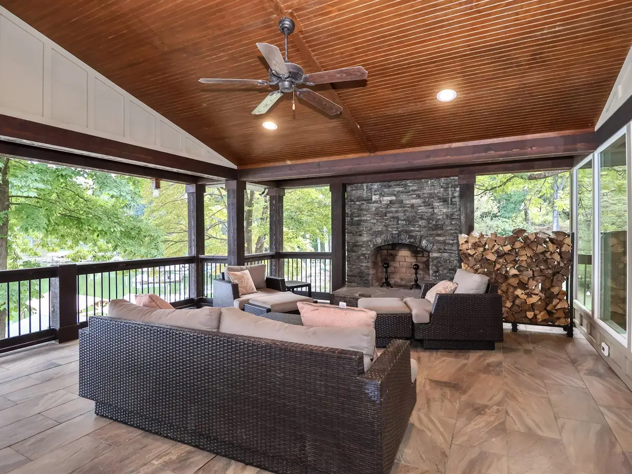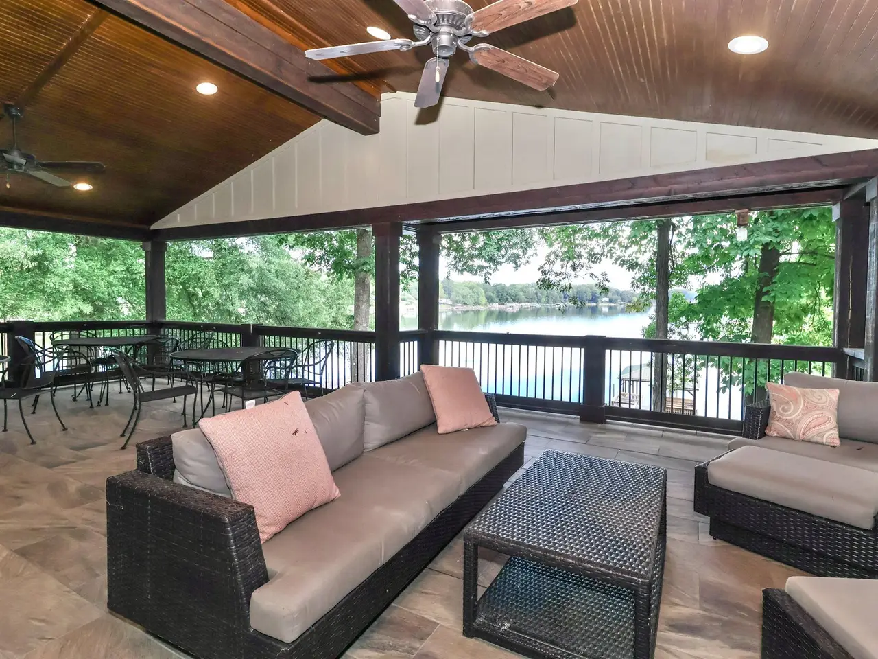 Covered deck with fireplace and million-dollar lake views
