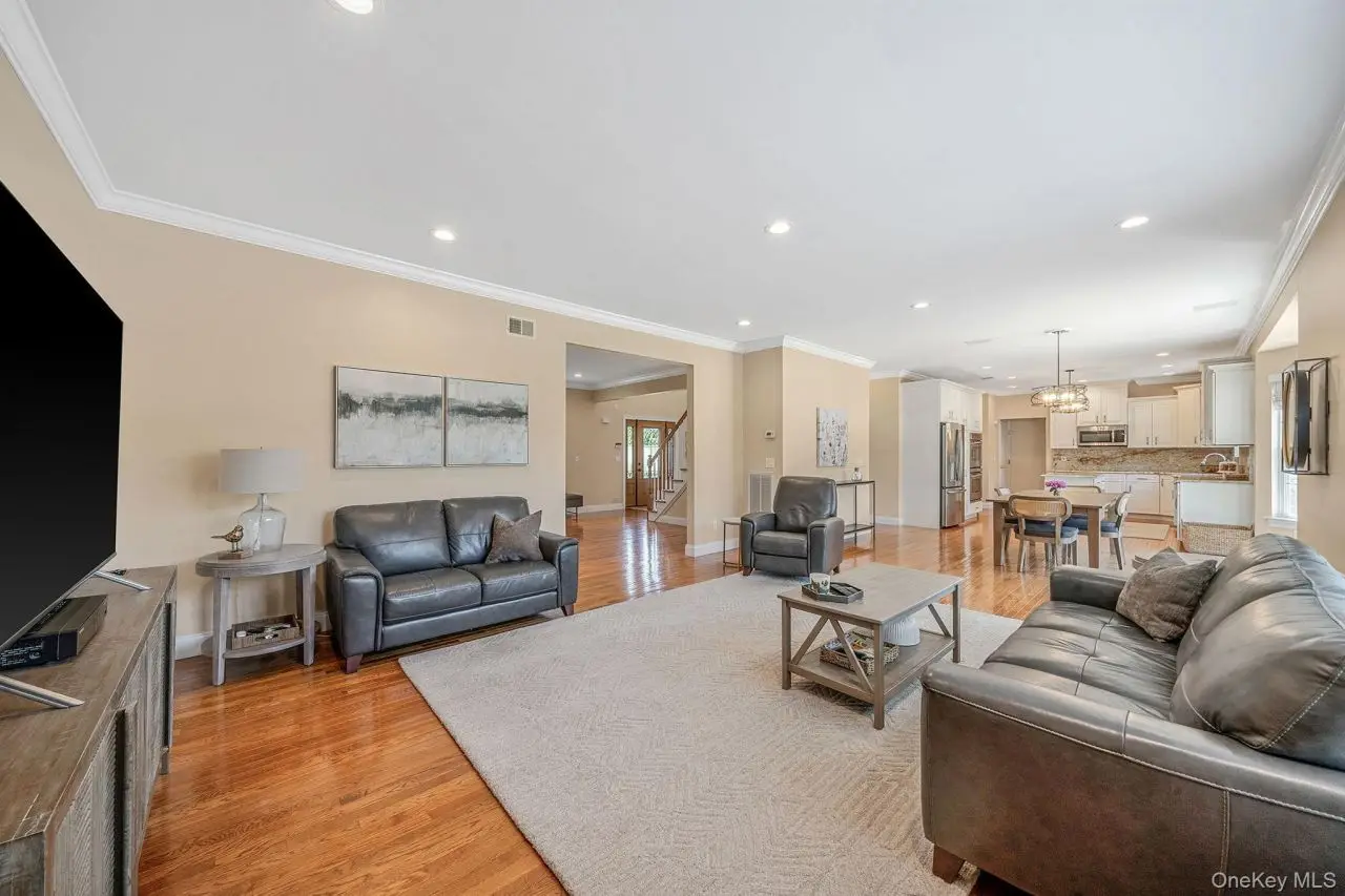 Set on a premium 1.25-acre parcel in Country Manor Estates, this post-modern colonial blends everyday comfort with resort-style outdoor living. Approximately 3,672 square feet above grade with a sunlit, open flow: a 2023 designer kitchen with custom cabinetry, full-height granite backsplash, built-in refrigerator, double wall ovens and center island opens to the breakfast area and great room. Formal living room with gas fireplace and a separate dining room; a full main-floor guest/au-pair suite adds flexibility. Two-story foyer, rich millwork and hardwood floors throughout. Upstairs, the primary retreat offers two walk-in closets and a spa bath with Jacuzzi tub, glass shower and dual vanity, plus four additional bedrooms, an updated hall bath and convenient laundry. Outside, a new driveway (2022) leads to paver walkways and an expansive patio overlooking the free-form waterfall pool-liner 2018, new gas heater 2024-framed by mature landscaping and fencing. The walk-out lower level provides a wet-bar lounge, recreation/media zones, a bath and direct patio access for easy indoor-outdoor living. Major updates: new architectural roof 2024, full HVAC replacement 2021, 200-amp electric, central vacuum, full irrigation; natural gas, public water, cesspool. Shoreham-Wading River Schools and a quiet cul-de-sac setting close to beaches, parks and village conveniences.
