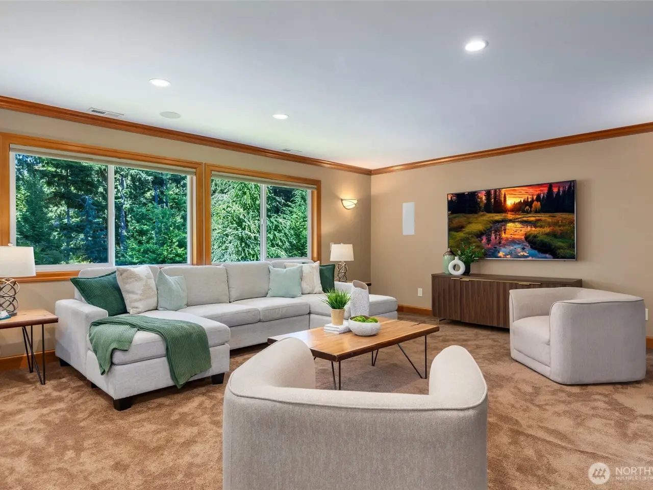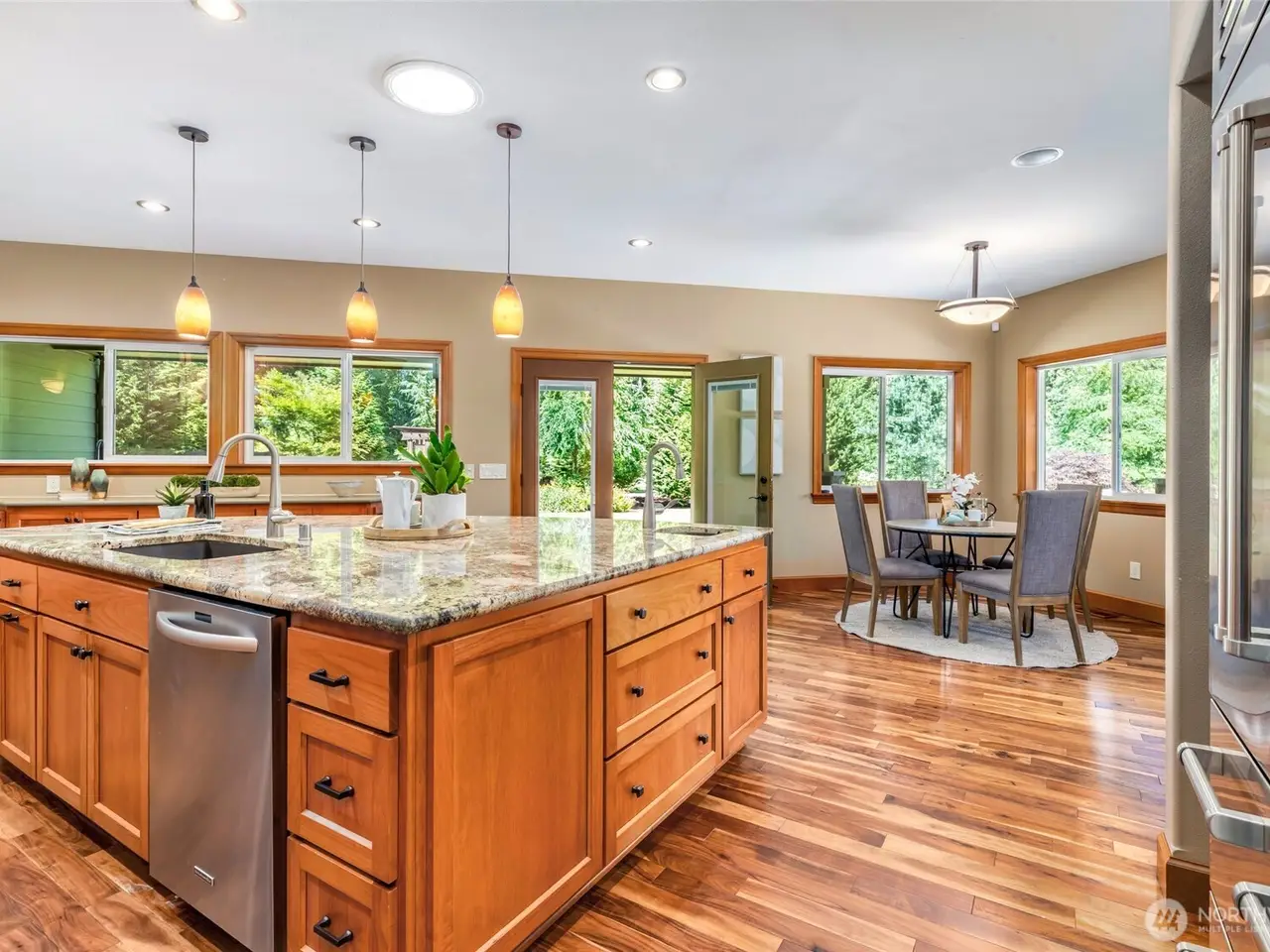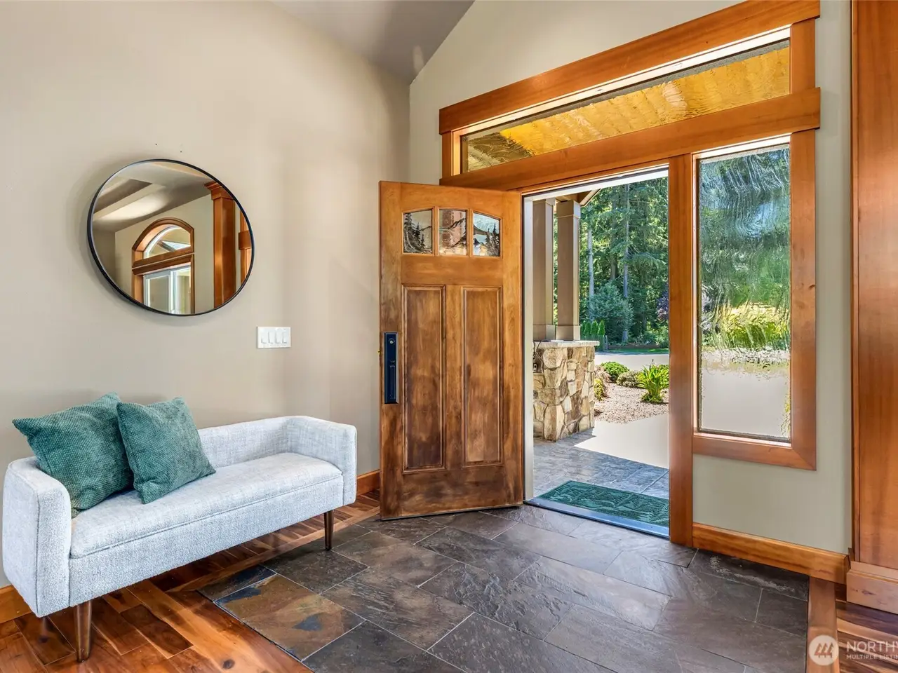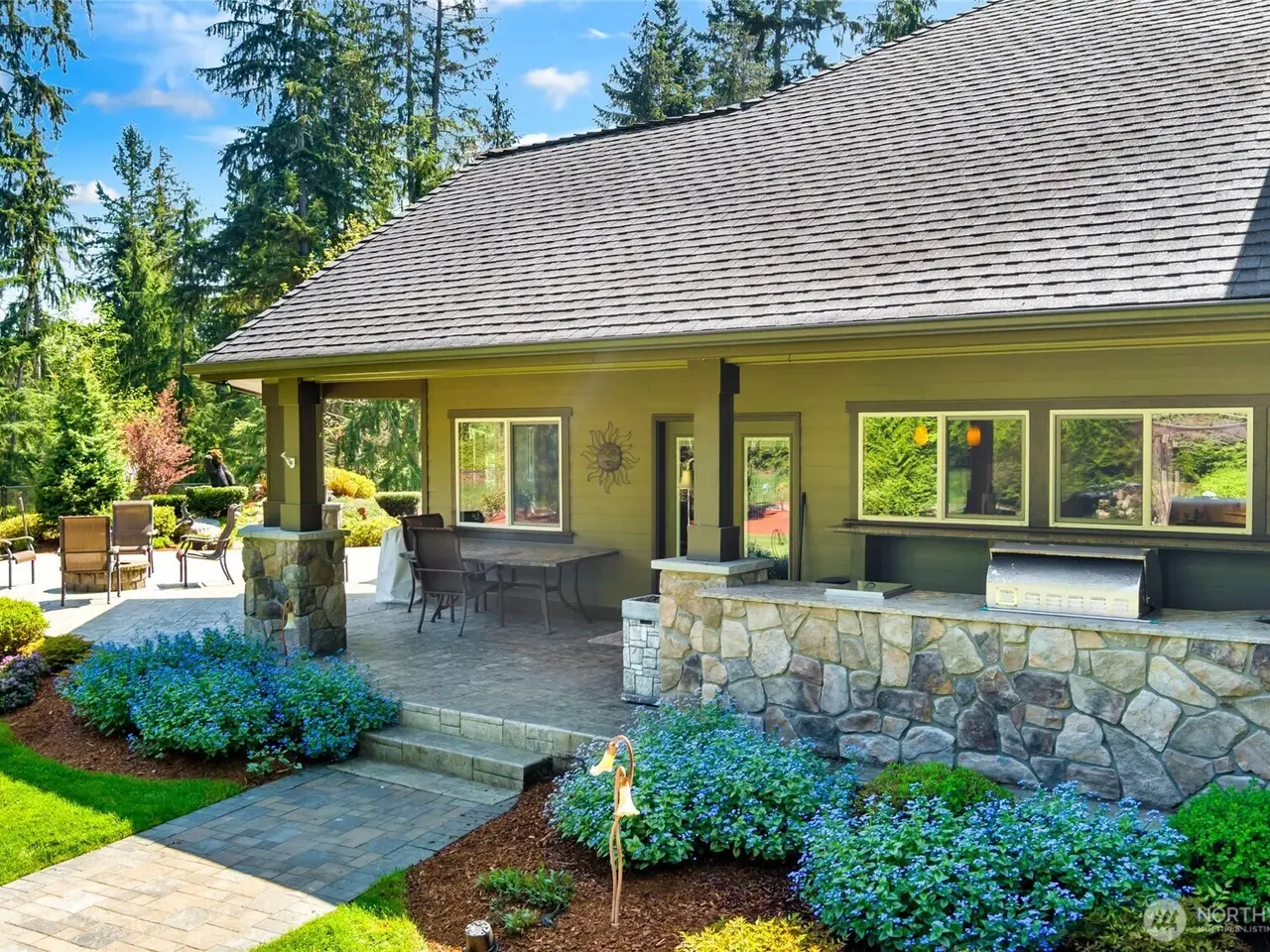 Nestled on five verdant acres just moments from Woodinville wine country, this private estate offers a seamless blend of refined luxury and natural beauty. Enter through a gated driveway to a grand circular entrance highlighted by a tranquil water feature. The main-level primary suite complements the home's soaring beam ceilings, floor-to-ceiling stone fireplace, and rich acacia hardwood floors. The chef's kitchen boasts Sub-Zero and Wolf appliances, framed by solid maple cabinetry. Outside, a covered pavilion with a second water feature and stamped concrete patio makes entertaining unforgettable. A detached three-bay shop and 42-foot motorhome garage add rare convenience to this extraordinary retreat.
