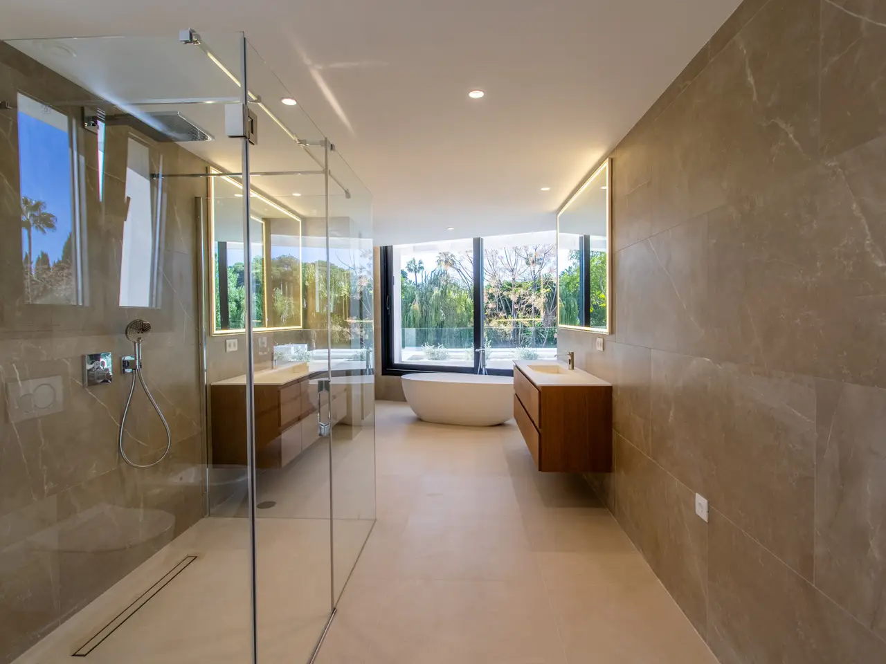 Located on a plot of over 2,000 square meters in one of the most exclusive areas of Sotogrande Costa, this magnificent villa combines modern and elegant style with its vertical lines and sober colors. The house is surrounded by large windows, maximizing natural light and energy efficiency. It features 5 bedrooms, 5 bathrooms, and 2 guest toilets. The ground floor consists of a beautiful entrance hall that separates the two bedrooms, both with ensuite bathrooms, from the spacious living-dining area with an open kitchen and a fantastic island. There is also a guest toilet and an elevator connecting all floors. From the living room, you can access the garden through a lovely terrace with pergolas, perfect for enjoying unforgettable moments under the moonlight with a drink or al fresco dining, taking advantage of the excellent climate of the area. Next to this terrace, there is a 14x6m infinity pool with LED lighting, offering both a swimming area and a relaxation area with sun loungers. The pool also has pre-installation for heating, so you can enjoy a swim after a long day of work. On the first floor, you will find an impressive master bedroom with an ensuite bathroom, a dressing room, and a private sitting area. The master bedroom also has access to a covered porch with stunning views. On the other side of the first floor, there are two more bedrooms, both with ensuite bathrooms. On the next floor, there is an uncovered terrace of 150 square meters. Can you imagine it? Finally, the basement offers endless possibilities. In addition to a covered garage of almost 50 square meters, a laundry room, and a toilet, there is a spacious open area of 149 square meters that can be used as a playroom for children, additional bedrooms, a gym, a wine cellar, a spa, or a magnificent home cinema! As for the quality of the materials, this spectacular villa is equipped with a reinforced door and energy-efficient VRF air conditioning system, as well as ventilation systems with heat recovery for increased comfort and energy savings. It also has underfloor heating and an aerothermal system. The villa is pre-installed for solar panels and an electric car charging point. The kitchen is furnished and equipped by Modulnova, with appliances from the Gaggenau brand. This is the perfect villa in the perfect location. Call us to arrange a viewing!