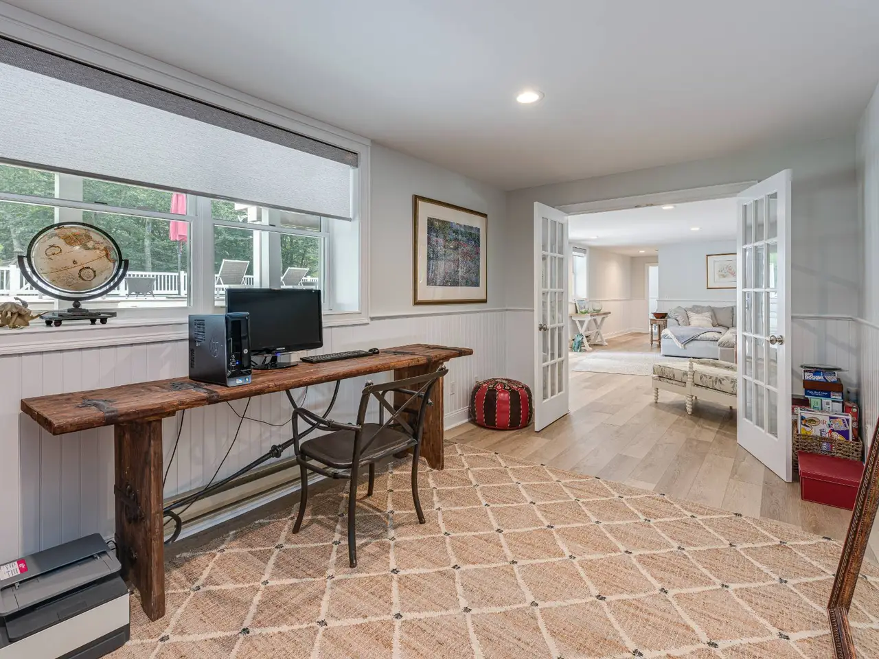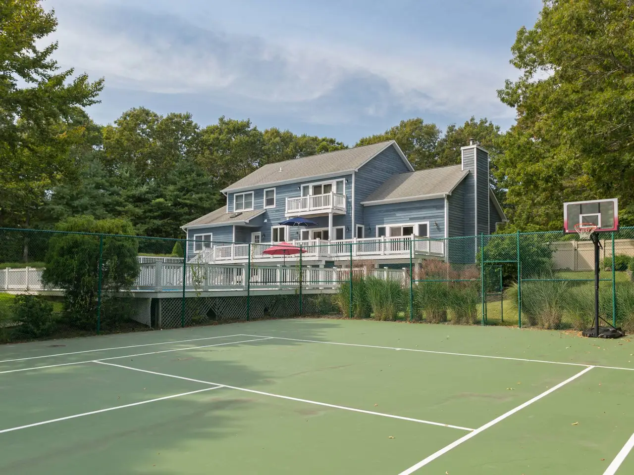 RP250274. On a quiet cul-de-sac, this beautifully renovated, three-level home offers a mature landscaped, private setting on 1.8 acres surrounded by a Peconic Land Trust reserve. 4,000 sf of Ipe decking leads to your tennis court, heated pool, outdoor dining and significant entertaining space.With the rear yard facing east, you are ensured of brilliant sun from dawn to late afternoon. The spacious, open floor plan on the main level offers a sun-drenched great room, a separate den, a junior master suite, dining area and chef's kitchen featuring top of the line appliances, wine/beverage fridge, double ovens and much more. Walk out onto your beautiful deck from both the kitchen and living areas. On the top level you'll find a very spacious master bedroom and bath with two additional guest bedrooms joined by a double sink, jack and jill bathroom. Down to the walk-out, lower level you'll find a large sitting/entertaining space, a separate office and a gym outfitted with professional grade equipment including a treadmill, bicycle and weight machine. Also, on the lower level you'll find the 5th bedroom and bathroom. This is the complete Hampton's package! The only thing you'll need to bring is your suitcase, and don't forget your toothbrush! Listing ID: 754635