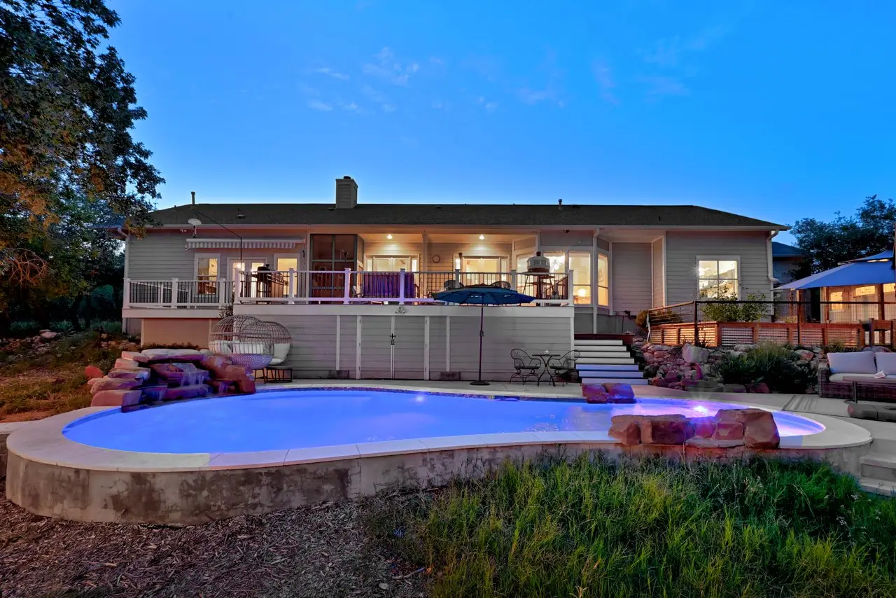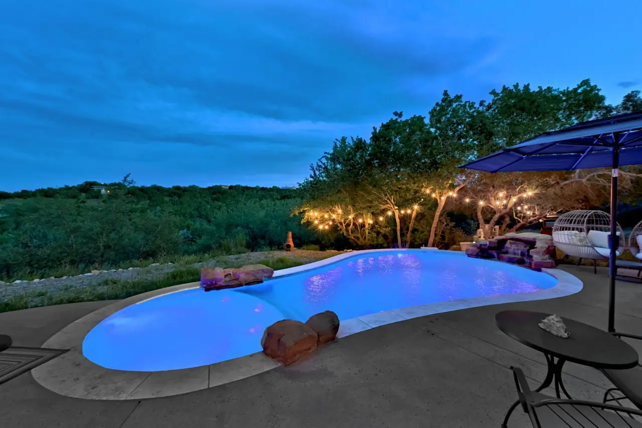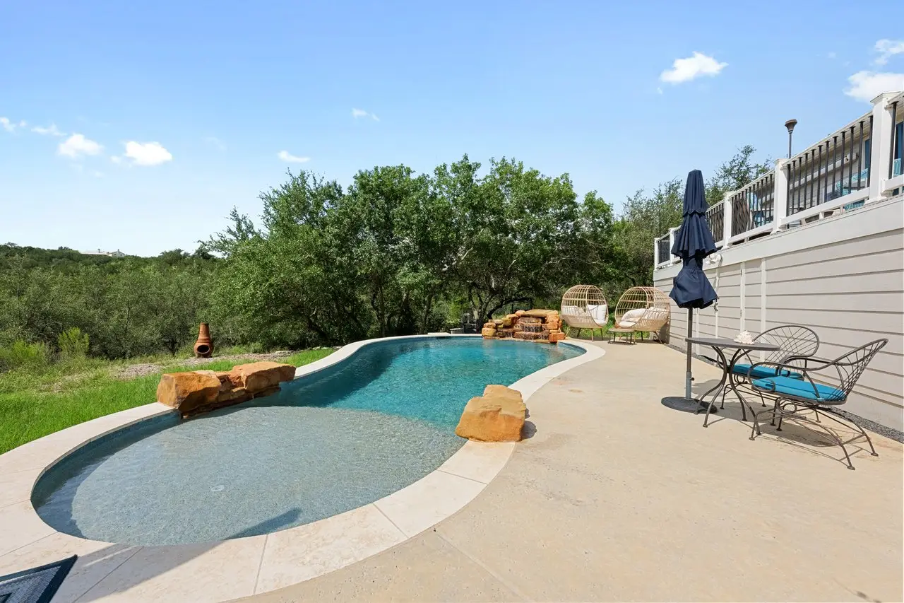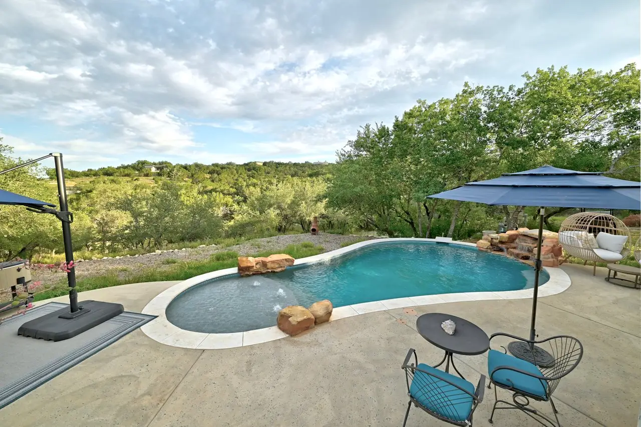Beautifully UPDATED SINGLE-STORY near Bee Cave with panoramic Hill Country views, pool, creek, and 1.72 acres of utter privacy and serenity! Thoughtful updates and natural beauty combine in this low-tax, convenient community with private Lake Travis access. A natural rock wall and trellis-covered path lead to the front door, where a charming fountain welcomes you. Inside, abundant natural light fills the open layout, featuring two flexible spaces—ideal for offices, sitting areas, or formal dining. One includes a walk-in closet and can serve as a 4th bedroom with access to the guest bathroom. The open kitchen/living area is lined with windows capturing sweeping views and seamless indoor-outdoor flow. The kitchen boasts light gray cabinetry, honed marble counters, farmhouse sink, reverse osmosis filtration, wine fridge, and a commercial-grade 6-burner + griddle gas range with double ovens. No carpet—just upgraded lighting and flooring throughout. The private owner’s suite features a spa-like bath with a tiled rain shower, soaking tub, dual vanities, and walk-in closet, plus an attached Zen den for yoga, nursery, or office. The guest/kids wing has its own flex space for a playroom or another office option. A newly added "moody mudroom" enhances functionality and style with custom storage and designer wallpaper. Outside, enjoy a resort-style backyard with a quartz-plaster UV-purified pool, splash pad, and expansive patio. Sustainable living is supported by a raised garden with drip irrigation, private well, rainwater collection, tankless water heater, and water softener. The oversized 3-car garage offers a workshop area, decked attic storage, and additional storage beneath the back deck. All just 10 minutes from Hill Country Galleria, in acclaimed Lake Travis ISD, with ~1.6% tax rate.