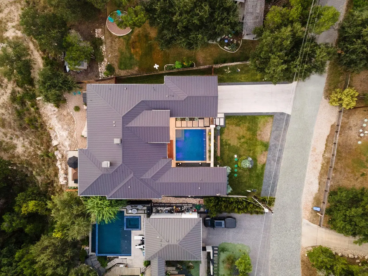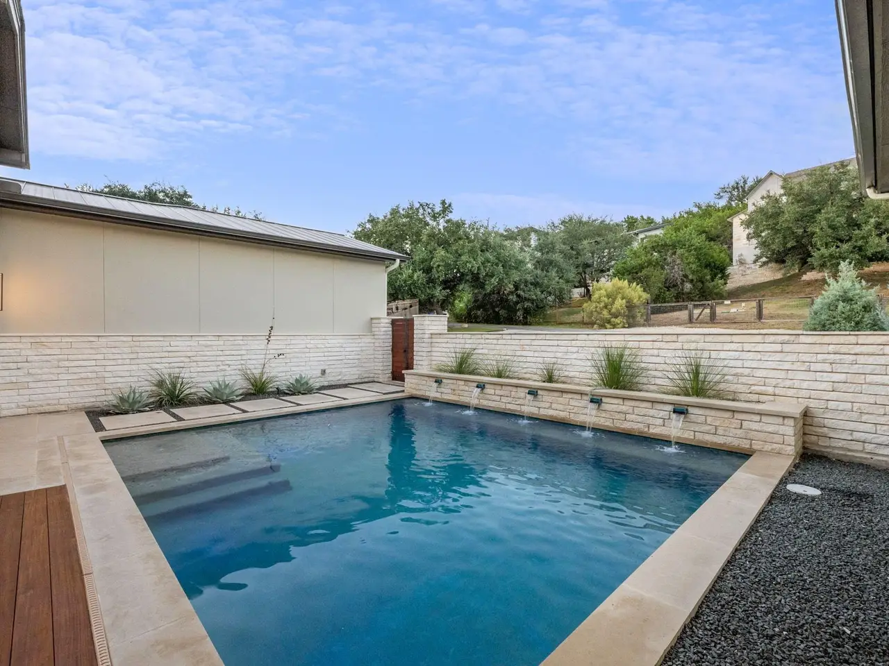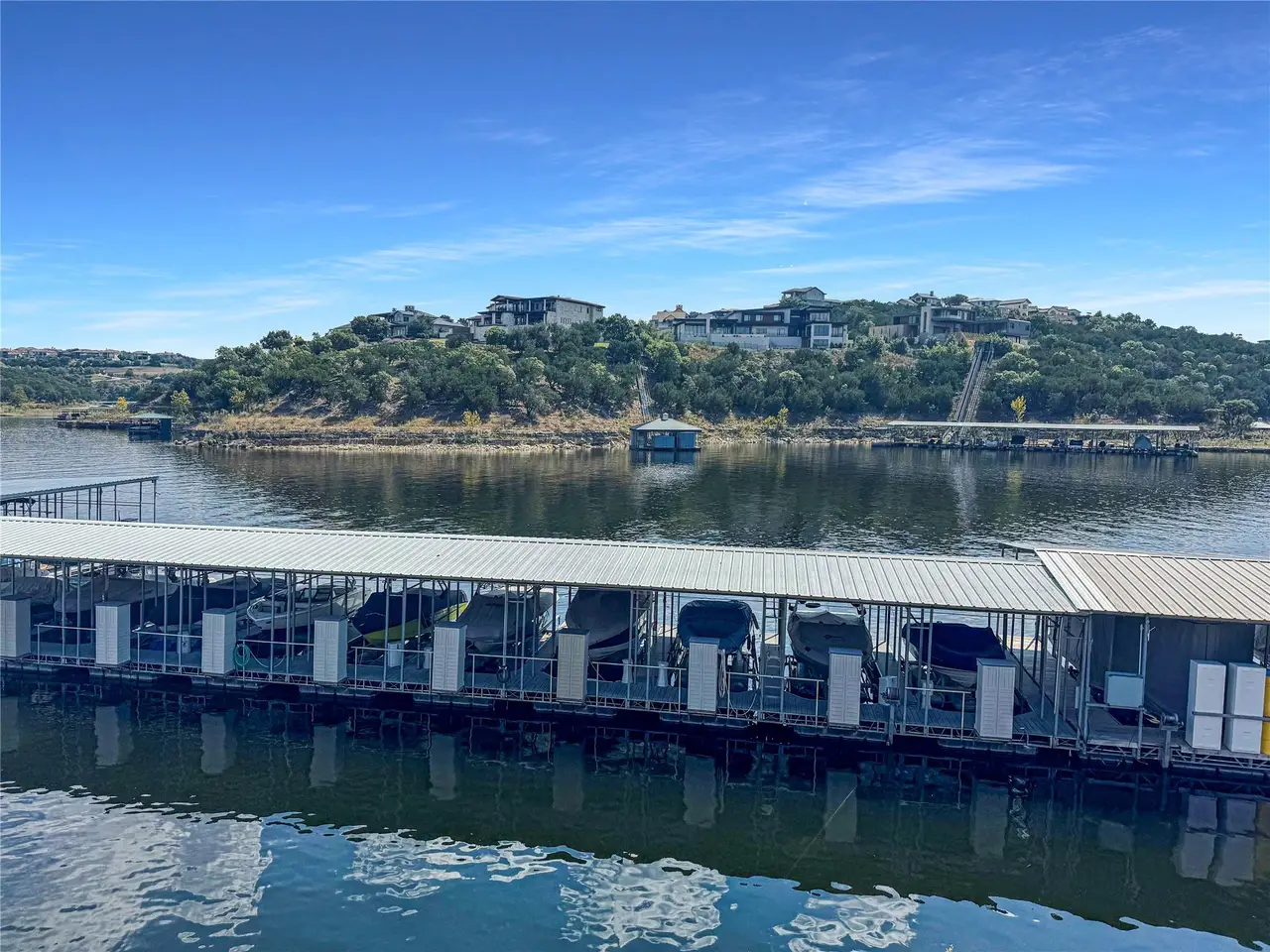 Discover a truly special home in Spicewood's most desirable gated community--Inverness Point. Live the ultimate Lake Travis lifestyle just steps from the water, where you can walk to your private MARINA for boating, fishing, or kayaking. Everyday living feels like a lakeside retreat, surrounded by nature and Hill Country serenity. This rare single-story residence captures stunning Hill Country VIEWS with a meticulously designed layout that's both luxurious and inviting. From the dramatic oversized double front doors to the tranquil courtyard centered around a private POOL and waterfalls, every detail reflects intentional craftsmanship and resort-inspired design. Inside, soaring ceilings, wood beam accents, and walls of glass set the stage for open, light-filled living. The entry features a natural stone wall with recessed grout balanced by a glass-enclosed wine room, introducing the home's sophisticated style. The living area centers around a sleek linear fireplace and flows seamlessly into the chef's kitchen with a waterfall island, commercial-grade appliances, built-in refrigerator, gas range with double oven, and a butler's pantry with beverage fridge, workspace, and coffee bar. The primary suite offers a fireplace, patio access, and a spa-like bath with LED-lit soaking tub, oversized shower, floating vanities, and custom walk-in closet. A separate casita provides its own living room, bedroom, and full bath--perfect for guests or multi-generational living. Outdoor living shines with covered patios, a full kitchen, fireplace, and multiple lounge areas to enjoy Hill Country breezes, sunsets, and sweeping views. A work center with built-ins, oversized laundry room, and storage-rich garage add convenience to the luxury. With a metal roof, LOW HOA fees, LOW tax rate of +/-1.6%, Lake Travis access, private marina, and tennis courts, this home is more than a place to live--it's a lifestyle.