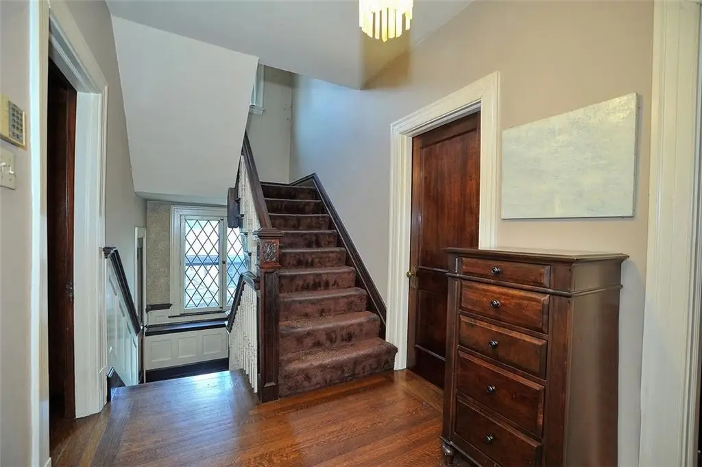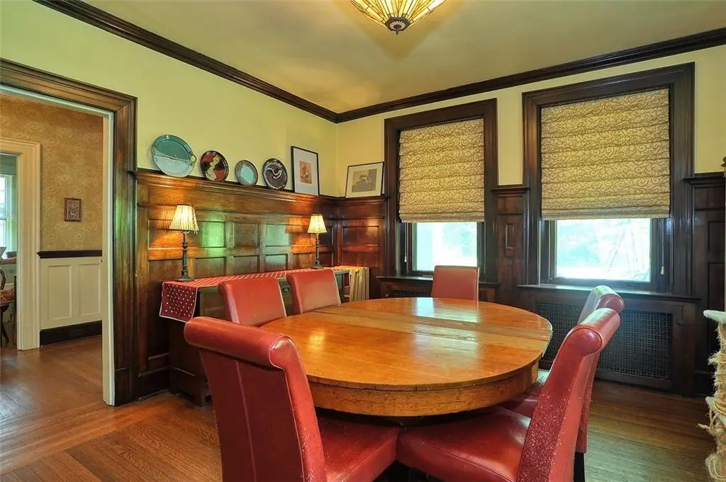 Stone & Stucco Tudor Residence features 6 BR's, 3.5 Baths, Tiled Vestibule Entry, Center Hall with Extensive Woodwork, Stained & Leaded Glass, Original Bronze & Glass Light Fixture; Handsome, Rich Woodwork w/Beamed Ceiling, Fireplaces, Built-in Cabinets w/Leaded Glass & window Seating; Natural woodwork, Wainscoting, & wood Paneled Walls. Kitchen Cherry Cabinets, Gas Cooktop, & SS Appliances. Kitchen opens to 1st Floor Family Room that opens to Outdoor Large Deck & Backyard; Pwd. Rm. on 1st floor too; NEW ROOF (2024); Charm & Character Abound throughout this Gracious home! 2nd floor (4) Bedrooms includes Updated Master Bath w/Oversized Walk-in Shower & Diamond Paned Windows; The fourth BR on this living level of the home offers a Fireplace w/Rockwood Tiles; Tooled & Painted Leather Mural. Sun Room & En-suite Remodeled Bath w/Claw Footed Tub, blt-in Shelving & Stained Glass Window! 3rd Floor three add'l rooms with Pine Floors and Natural Light! Oversized 2 Car Garage w/storage space!