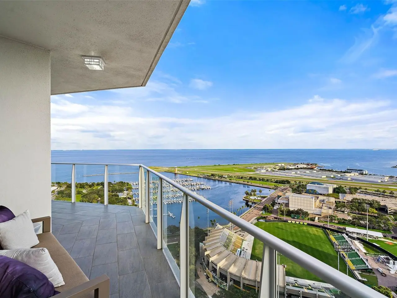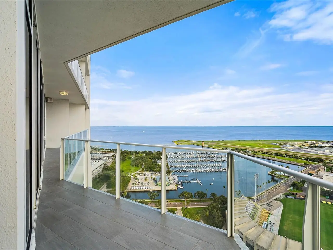 JAW DROPPING JUNIOR PENTHOUSE WITH UNOBSTRUCTED PANORAMIC WATER VIEWS! Prepare to be amazed as you step into this stylishly stunning 32nd floor, 3 bed, 3.5 bath, 2,354 SF Junior Penthouse. Nestled amongst the clouds and wrapped in walls of windows this striking residence boasts numerous features and upgrades that are sure to impress. Exquisite porcelain tile floors throughout the home are sure to catch your eye. The consummate chef’s kitchen is highlighted with superior quartzite kitchen countertops, custom designer glass tile backsplash, a center island with tailored cabinetry, and is equipped with the highest quality Wolf appliances, including a sub-zero refrigerator as well as wine fridge, microwave, dishwasher, and an induction cooktop with hood. Impressive wood doors with frosted glass inserts welcome you into every room. Each bedroom provides a spacious footprint and offers closet space with extensive custom shelving systems and all the bathrooms feature convenient dual sinks, upgraded plumbing fixtures, and specially made cabinets. Designed beyond standards, this home is also outfitted with all the latest in modern technology, including motorized blinds on all windows and balcony doors, remote control ceiling fans, and a Crestron home automation system that allows you to dim the lights, open or close the blinds, adjust your brand new A/C, operate the TV, access your internet or Wi-Fi, or control your home audio system that spreads throughout the entire residence and out onto your balcony, all from your favorite smart device. Directly off the spacious living area is your 469 SF private balcony with glass railings that run the length of the condo providing magnificent and truly special views. The Rowdies' Stadium is fully visible so you can enjoy every game without ever buying a ticket. You have a birds-eye view of the exciting downtown activities and can spend countless hours watching sailboats, yachts and jet skis cruising in and out of the marina, the planes taking off and landing at Albert Whitted Airport, and, during the annual St. Petersburg Grand Prix, you can enjoy race cars scream around the track. The unique angle placement of the building and the location of this home provides views wrapping from the east to the west, allowing you to embrace all the sights & scenes that span from the magical morning sunrises over the emerald-green waters of Tampa Bay to the renowned Skyway Bridge, and all the way over to the Gulf Beaches and evening sunsets that light the sky on fire. Included with this Junior Penthouse are two parking spaces and two climate-controlled storage units located on the fifth floor. An architectural icon with its dramatic and modern design, Signature Place is in the heart of downtown and offers resort-style amenities that include: 24/7 concierge, a grand lobby, 2 beautifully appointed club house rooms, state of the art fitness center, heated infinity edge pool and spa, outdoor grills, a putting green and more. Just a short walk to dozens of restaurants, grocery stores, retail shops and boutiques, museums, the Pinellas trail, sports arenas, and waterfront parks, living here gives you endless entertainment options.