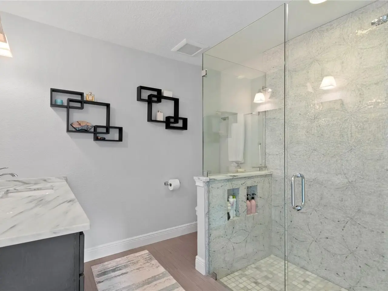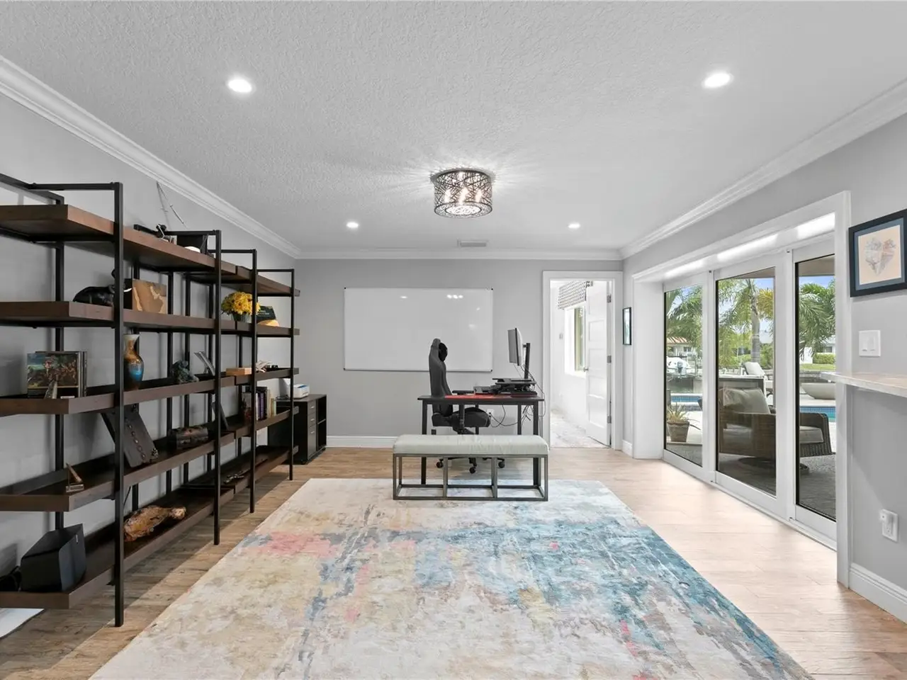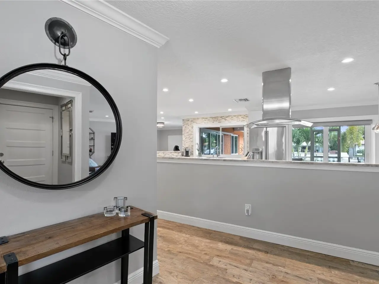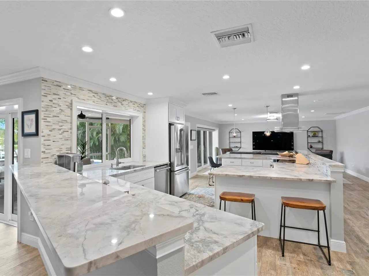 Don’t miss your opportunity to own this stunning home in the highly sought-after waterfront community of Venetian Isles! This beautiful 4-bedroom, 3-bath residence offers the perfect blend of luxury, comfort, and modern coastal living. Step inside to an expansive open-concept layout where the family room, kitchen, and dining area flow seamlessly into a screened lanai and beautifully landscaped backyard—perfect for effortless indoor-outdoor entertaining. The home welcomes you with a spacious foyer or a convenient mudroom entrance from the two-car garage. Throughout the living spaces, wood-look ceramic tile creates a warm, elegant ambiance. At the heart of the home, the chef’s dream kitchen features a large U-shaped eat-in island with marble countertops and backsplash, high-end Café series stainless steel appliances, and stylish custom cabinetry. The interior laundry room is as functional as it is beautiful, complete with Whirlpool Cabrio washer and dryer, built-in cabinetry, utility sink, and marble tile accents. Thoughtfully designed for privacy, the home offers a split bedroom layout. The first guest bedroom enjoys a beautifully appointed full bath, while two additional bedrooms in a separate wing share a spa-like bathroom with Danze fixtures and designer finishes. The private master suite is a true retreat, showcasing a luxurious marble bathroom and a generous walk-in closet. Enjoy true Florida living with hurricane-rated sliding glass doors that fully pocket back, connecting your main living spaces to the screened lanai and creating a seamless indoor-outdoor experience. Whether you're relaxing by the heated saltwater pool and spa, or enjoying tranquil canal views from the cozy firepit corner, this backyard oasis has it all. Boaters will appreciate the composite dock with electric, water, a 10,000 lb. boat lift, and updated seawall (2017). The lush landscaping provides ample privacy and is enhanced by elegant outdoor lighting for evening ambiance. Best of all, this home has experienced no water damage from any hurricanes—a testament to its strong construction and elevated location. Homes like this in Venetian Isles don’t come around often—schedule your private showing today!