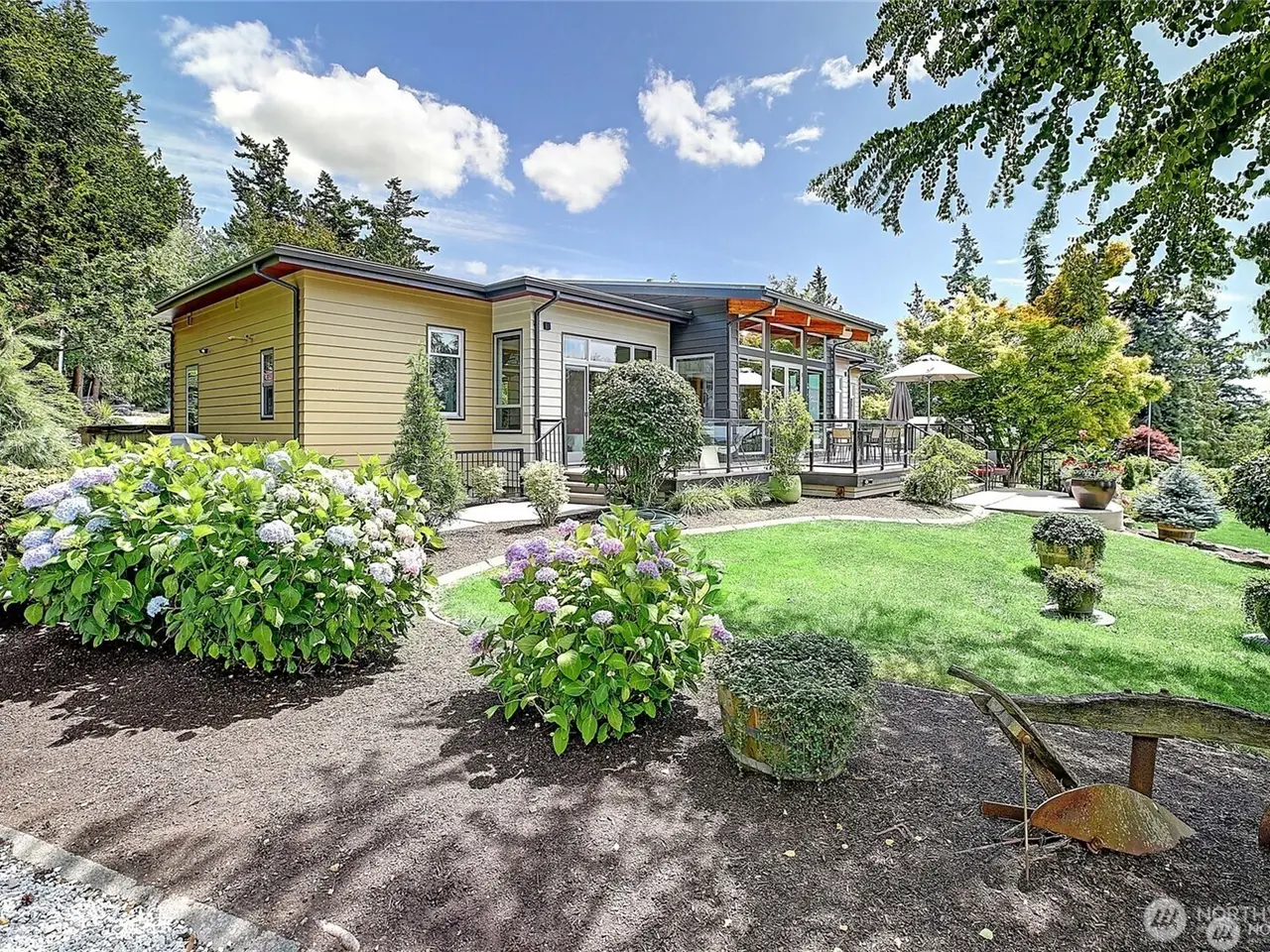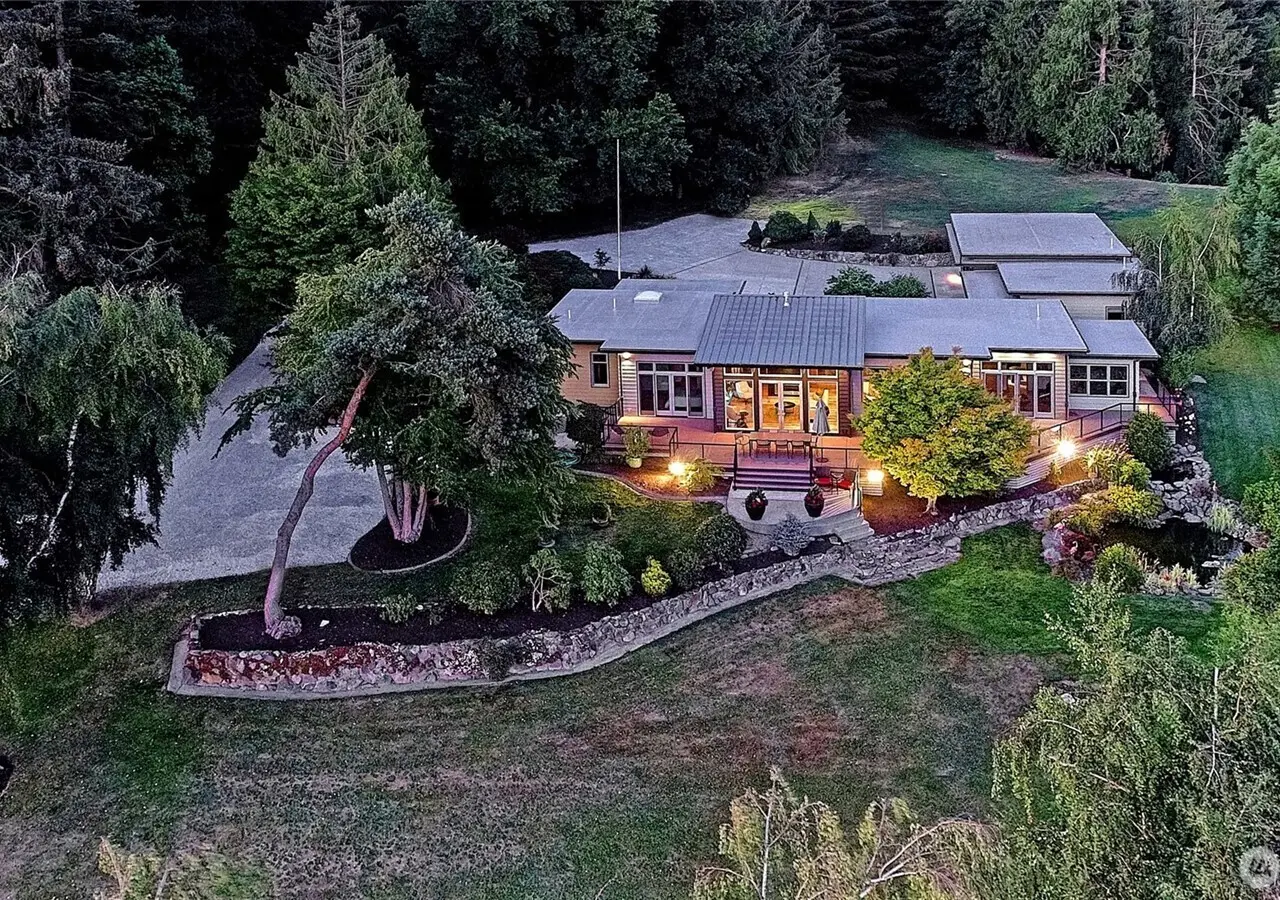 Exquisite Mid-Century style home on 6.4 beautiful acres with evergreens and trails throughout. Views of the Olympics, Sound, City, Sunsets, and Valley. Six parcels within the city limits. Drive up to your finished four-car garage and walk through a gorgeous courtyard into your own piece of paradise. Beautiful open kitchen with large island. Stainless high-end appliances. Adjoining is your dining area with lots of built-ins. TV room, with adjoining office. Huge deck the width of the house. Large living room with steel fireplace. Secondary bedroom, 3/4 bath, machine room and guest closet are steps away. Spacious primary suite with updated bath and walk-in closet. Detached studio guest room with beautiful granite counters and 3/4 bath. Green Built!