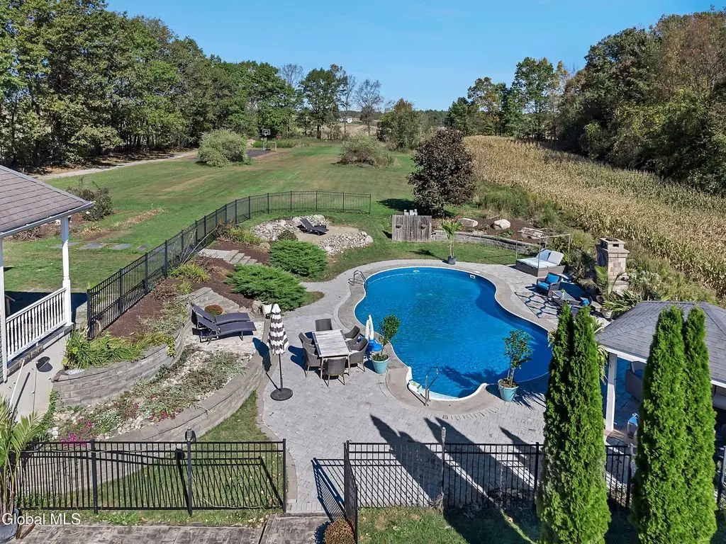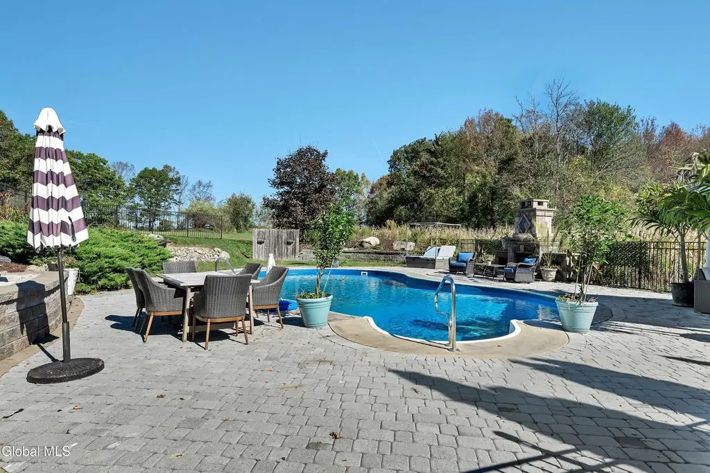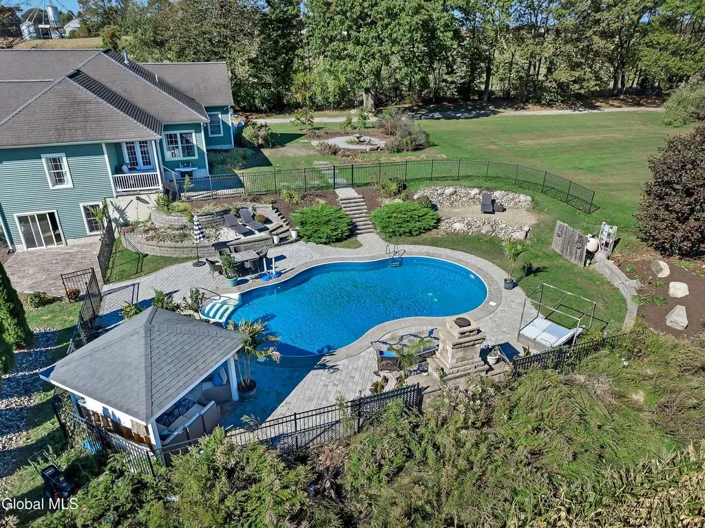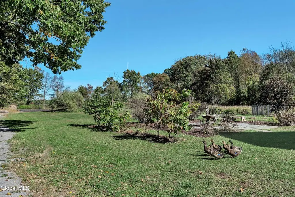 Nestled behind a gated entrance and surrounded by nearly three acres of beautifully landscaped grounds, 123 County Route 70 in Stillwater offers a refined country lifestyle just minutes from Saratoga Lake. Built in 2007, this European-inspired home features three bedrooms, three full bathrooms, and a home office. The front of the home showcases a circular driveway, a striking stone facade, and a grand entrance with blue stone stairs leading to a covered front porch. Inside, the kitchen features cherry cabinetry, granite countertops, stainless steel appliances, and a large walk-in pantry. It opens to the dining area and living room, where you will find tray ceilings and a gas fireplace. The first-floor primary suite offers a spacious, spa-like bath with an oversized ceramic tile shower, dual vanity, and built-in shelving. It also includes a generous walk-in closet complete with a custom built-in closet system. The finished lower level includes a home theater with a projector and a separate recreation room with access to the outdoors. The backyard is designed for entertaining with an inground pool, paver patio surround, a built-in outdoor fireplace, and a cabana. Enjoy privacy and natural beauty with scenic walking trails, a private 600-foot driveway lined with flowering pear trees, and additional amenities including a basketball and pickleball court, garden beds, and cleared acreage ideal for expansion or recreation. Additional highlights include a newer furnace and central air. An adjoining 15-acre parcel is also available for purchase. This is an exceptional opportunity to own a private retreat in a prime location near Saratoga Lake. Schedule your private showing today and experience luxury living at its finest. Check out the full feature YouTube Video!