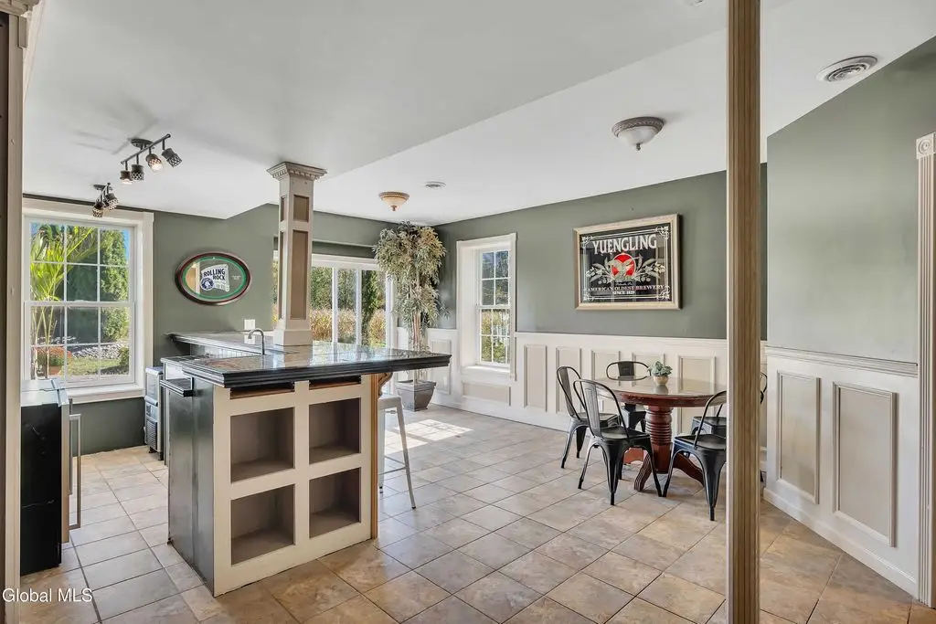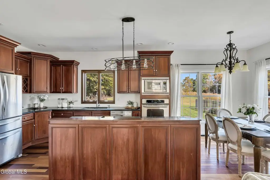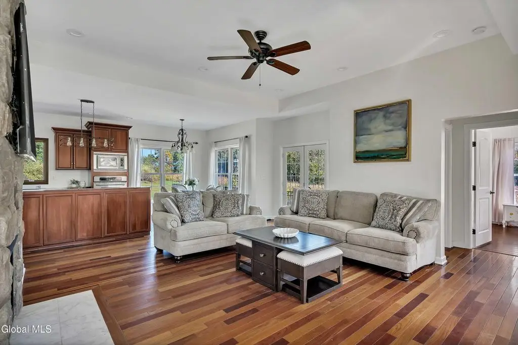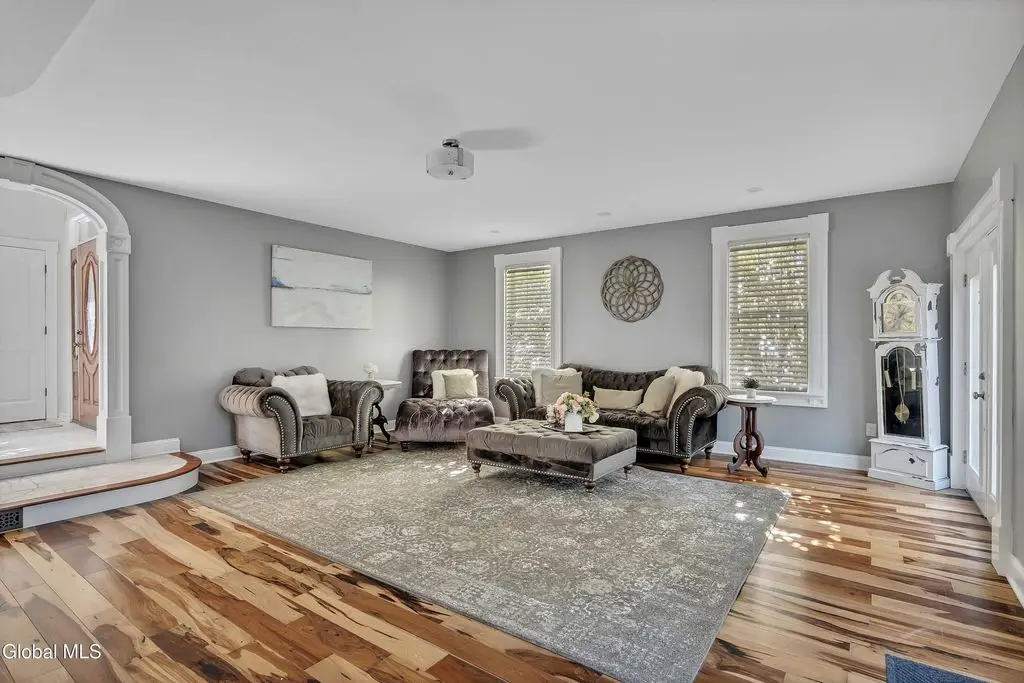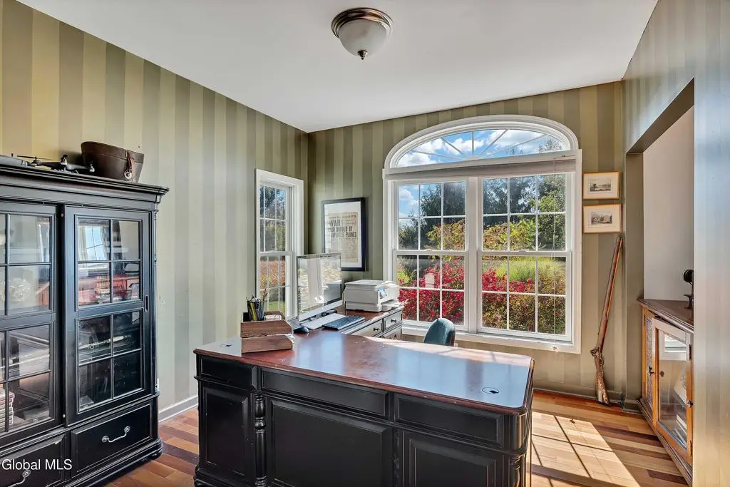 Nestled behind a gated entrance and surrounded by nearly three acres of beautifully landscaped grounds, 123 County Route 70 in Stillwater offers a refined country lifestyle just minutes from Saratoga Lake. Built in 2007, this European-inspired home features three bedrooms, three full bathrooms, and a home office. The front of the home showcases a circular driveway, a striking stone facade, and a grand entrance with blue stone stairs leading to a covered front porch. Inside, the kitchen features cherry cabinetry, granite countertops, stainless steel appliances, and a large walk-in pantry. It opens to the dining area and living room, where you will find tray ceilings and a gas fireplace. The first-floor primary suite offers a spacious, spa-like bath with an oversized ceramic tile shower, dual vanity, and built-in shelving. It also includes a generous walk-in closet complete with a custom built-in closet system. The finished lower level includes a home theater with a projector and a separate recreation room with access to the outdoors. The backyard is designed for entertaining with an inground pool, paver patio surround, a built-in outdoor fireplace, and a cabana. Enjoy privacy and natural beauty with scenic walking trails, a private 600-foot driveway lined with flowering pear trees, and additional amenities including a basketball and pickleball court, garden beds, and cleared acreage ideal for expansion or recreation. Additional highlights include a newer furnace and central air. An adjoining 15-acre parcel is also available for purchase. This is an exceptional opportunity to own a private retreat in a prime location near Saratoga Lake. Schedule your private showing today and experience luxury living at its finest. Check out the full feature YouTube Video!