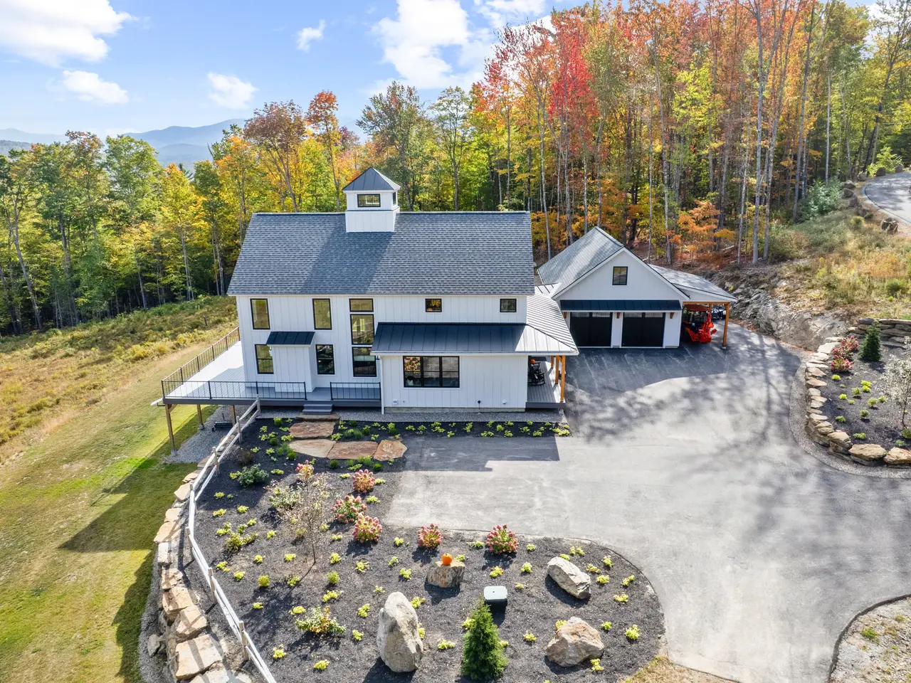 Experience Mountain Living at Its Finest. Why wait to build when this brand-new, custom-designed Yankee Barn stunning retreat is waiting for you now? The home is crafted with Douglas Fir beams and elegant half-lap joinery. Expansive elevated windows flood the open-concept interior with brilliant natural light. The main level includes a welcoming entrance onto the farmer's porch. Then, entering the home, a powder room to your right and a bedroom ensuite to the left; a state-of-the-art kitchen awaits, featuring a double-thickness quartz center island and marble backsplash, Thermador appliances, and a double wall oven. The living/dining area features a warming stone fireplace and opens to a generous deck, showcasing breathtaking mountain views. Upstairs, you'll find the primary ensuite with a private office and luxurious bath. The lower level is plumbed and ready for a future bathroom, bedroom, and family room, with walk-out access to a private backyard and space for additional gardens. Outdoor enhancements include lush gardens, stonework, private patios, and a two-bay garage with a loft, all on over 20+/-AC. Located on prestigious Blake Road, once home to the historic Peckett’s Inn, it was the summer retreat to many wealthy visitors and Hollywood elite. This property offers timeless charm in the heart of Sugar Hill. You'll be close to all the White Mountains have to offer. Great opportunity! Land in CU.