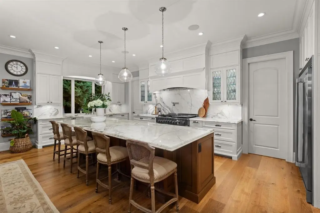 Magnificent French inspired estate situated on one of our South Surrey’s most picturesque streets. This exquisite 8,500 sqft mansion boasts top quality finishes inside and out. Timeless architecture adorned in limestone sets the tone of sophistication. Grand double height foyer, with cross-hall formal Living and Dining Rooms. Great Room along the back of the home features accordion doors creating seamless indoor & outdoor living. Chef’s dream Kitchen complete with custom millwork and calacatta marble, along with a bonus wok kitchen. Main floor features a private guest suite, along with a den and home office. Upper level features 4 ensuites bedrooms including the Primary Suite rivalling the Ritz with its opulence; spa-like ensuite and dressing room. Almost 27,000sqft South facing property.
