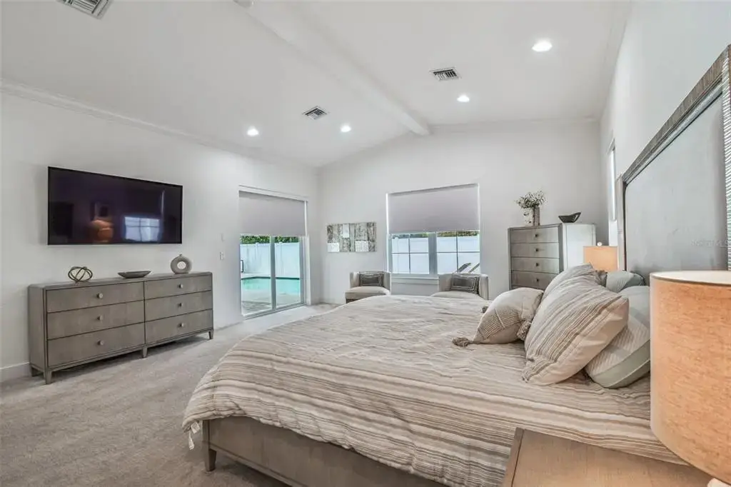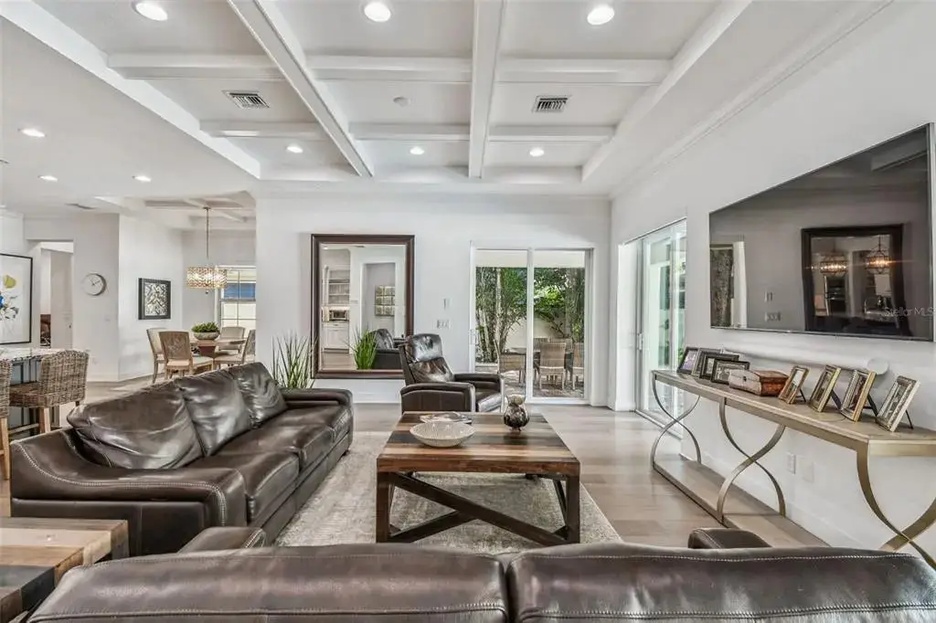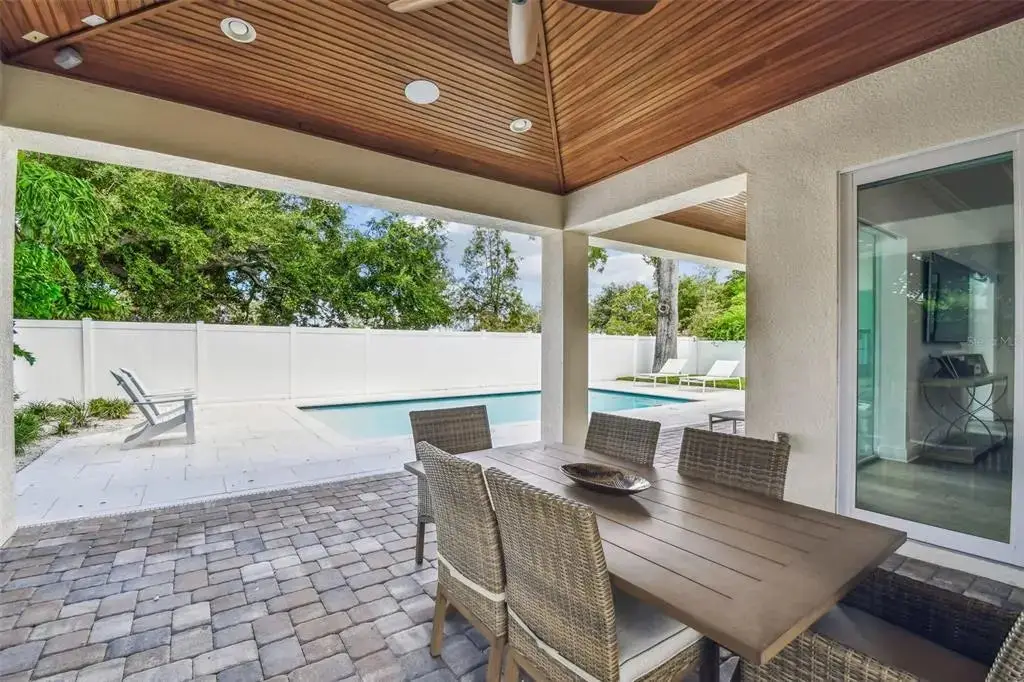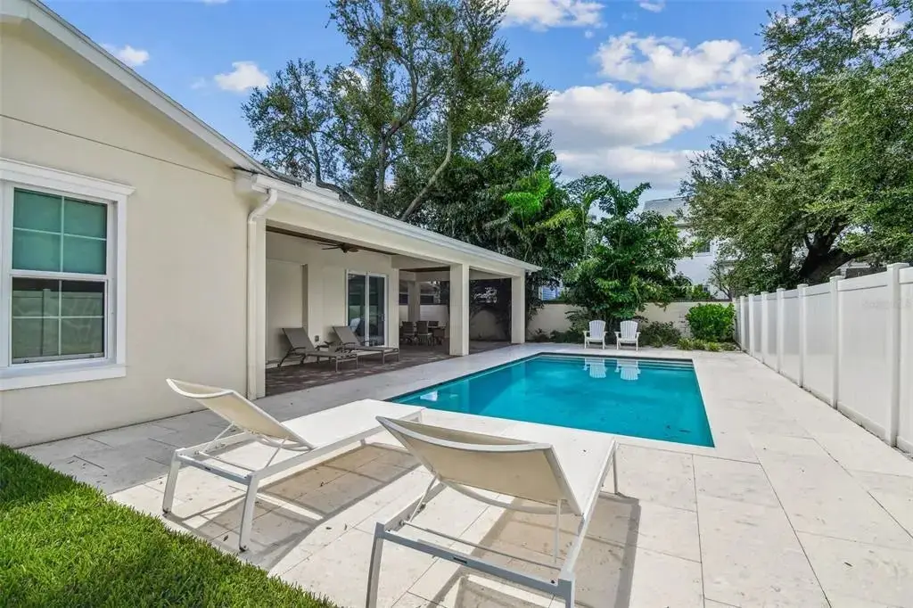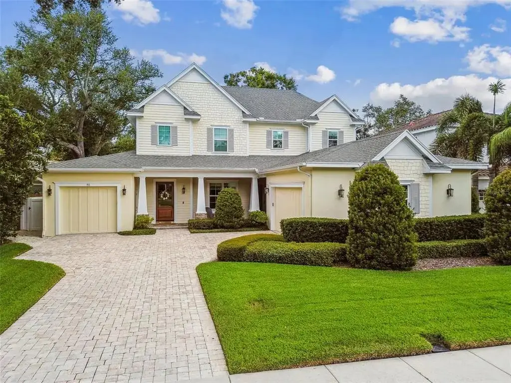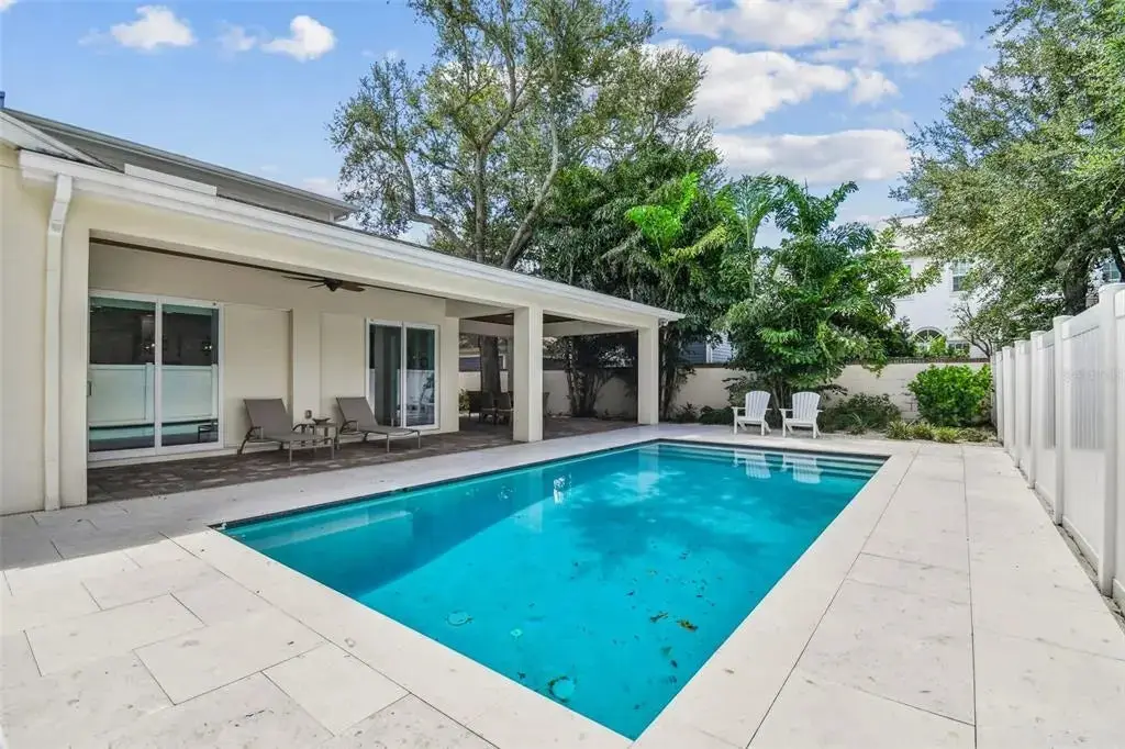 Welcome to this stunning Craftsman-style estate in the highly sought-after Golfview neighborhood of South Tampa. This meticulously designed five bed, four bath home offers over 4,200 square feet of heated living space and more than 1,100 square feet of covered outdoor areas. Built in 2016 on a 75x100 lot in Flood Zone X, the home features a split three-car garage with ample guest parking. From the moment you arrive, the home makes a grand impression with its covered front porch, wooden staircase, paneled walls, and abundant natural light. Inside, you'll find hurricane-impact sliding glass doors and windows, rich crown molding, coffered ceilings, and custom light fixtures throughout. The formal dining room sets a refined tone, while the dry bar and arched entryway lead you into the heart of the home: an open-concept kitchen, breakfast nook, and great room designed for both everyday living and entertaining. The oversized island is the centerpiece of the space, and customized with Thermador appliances, a walk-in pantry, built-in butler’s pantry/wet bar, and a large mudroom/laundry room with sink and ample storage. The private first-floor primary suite is a serene retreat with vaulted ceilings, paneled walls, and direct access to the pool and lanai. Its spa-like bath includes a walk-in glass shower with dual shower heads, a freestanding soaking tub, dual vanities with storage, and a spacious walk-in closet. A second first-floor bedroom and full bathroom offers flexibility as a guest room or dedicated office. Upstairs, you'll find three generously sized bedrooms—each with walk-in closets and custom lighting—two full bathrooms, and a versatile loft area perfect for play, study, or relaxation. Attic access is available through the mechanical room for additional storage. Step outside to discover the ultimate outdoor lounge—virtually hidden from the rest of the house and other outdoor living spaces. Complete with a cozy gas fireplace, large built-in TV, stained wood ceilings, and ceiling fans, it’s the perfect setting for gameday gatherings or relaxing movie nights. The expansive backyard lanai features travertine decking, a gas feed and vent ready for your dream outdoor kitchen, and a 392-square-foot in-ground concrete pool (installed in 2017) surrounded by vinyl fencing and a grassy play area. Open space behind the property offers tranquil views of the ever-changing sky, adding to the sense of privacy and serenity. Located just minutes from top-rated restaurants, shopping, Palma Ceia Golf and Country Club, and only half a mile from Plant High School this home is a rare blend of craftsmanship, comfort, and coastal charm. Schedule your private showing today and experience the lifestyle you’ve been dreaming of.