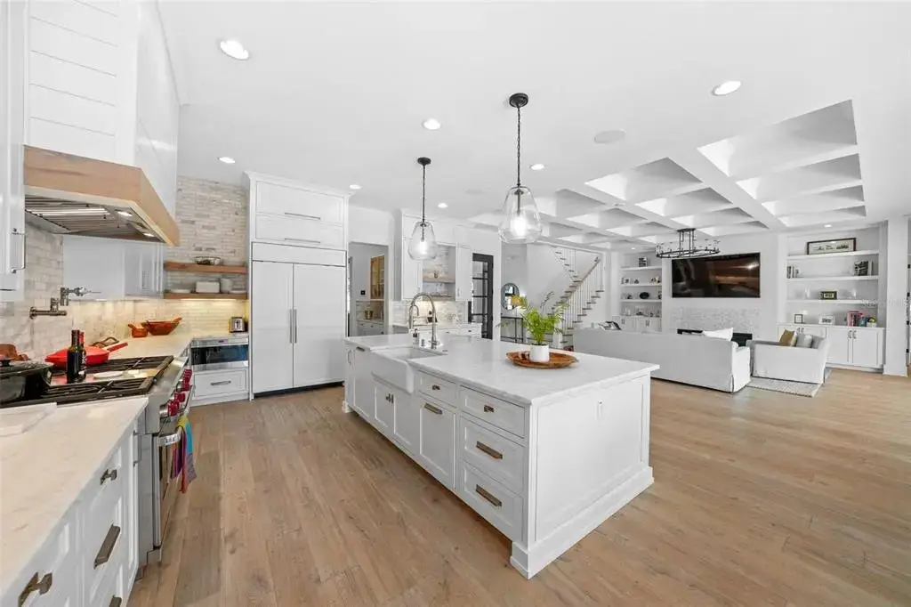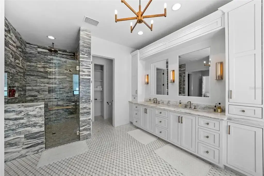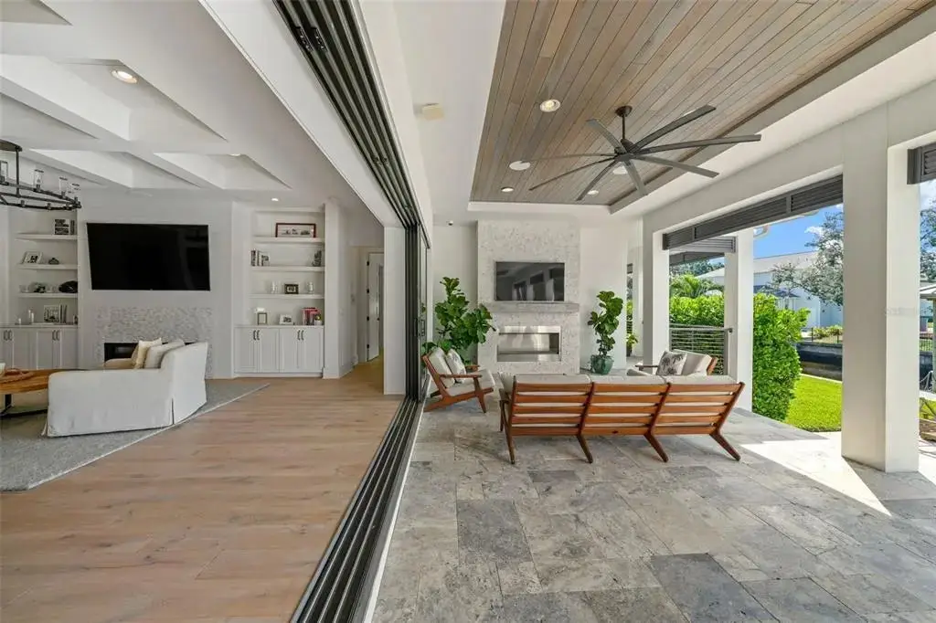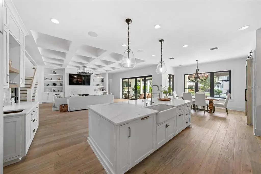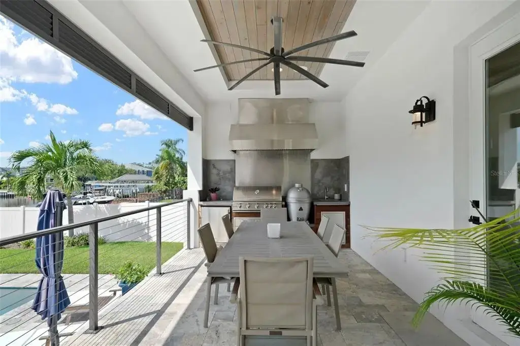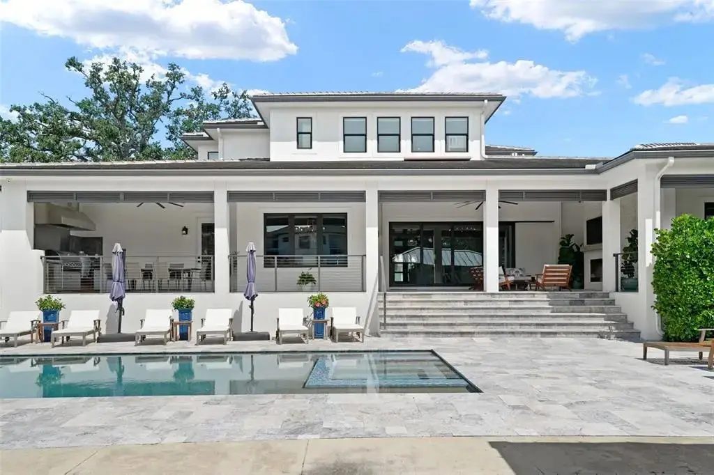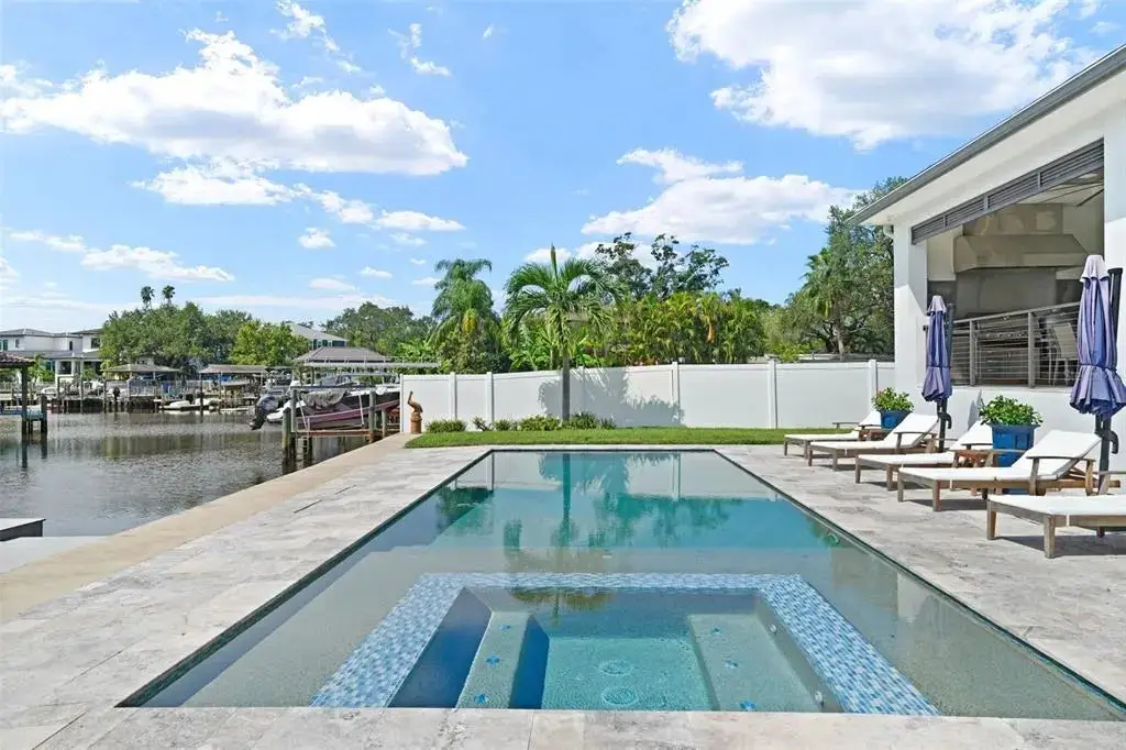 Davis Islands Modern Coastal on 100’+ of Waterfront with first-floor master bedroom. This custom-built residence blends timeless design with the highest standards of craftsmanship and is located on a quiet street on Davis Islands. The entry showcases a custom contemporary mahogany six-panel front door with impact glass and transom, opening to light-filled interiors defined by white oak engineered hardwood floors. A glass-fronted refrigerated wine cellar—with split-system cooling, floor-to-ceiling wood tile, stainless steel wine racks, a mahogany solid wood door, marble floors, custom cabinetry, and an electronic lock—serves as both functional storage and a striking design feature. The chef’s kitchen pairs marble counters and backsplash with premium appliances, complemented by a butler’s pantry and walk-in pantry. Living areas flow seamlessly to the outdoors through a 4-panel impact pocket slider, while PGT high-impact bronze windows with transoms on the front and rear elevations frame every view. Every element of the home reflects thoughtful engineering and luxury detail—from its piling foundation and concrete flat tile roof to the light sand finish stucco and custom Bahamian shutters with crafted metal railings and fencing that frame the façade. The primary suite offers two walk-in closets and a spa bath finished with imported marble flooring, counters, and shower, plus a freestanding soaking tub. Additional bedrooms include en-suite baths with marble finishes, continuing the home’s refined material palette.. At the water’s edge, a new seawall supports a composite dock with a covered 13,500lb boat lift—finished with a metal roof, lighting, water, and electric service. An additional electric 1,500lb lift lowers directly into the water, easing access for boating or water toys. The backyard is a showcase for Florida living: a contemporary rectangular saltwater pool with water-edge spa, glass waterline tile, umbrella stand, lounge area, and automated Hayward LED lighting. Surrounding the pool and lanai, silver travertine pavers set the stage for gatherings. The lanai’s cypress coffered ceiling frames a linear gas fireplace with a tabby shell stucco surround and a custom barnwood mantel, while a custom outdoor kitchen—featuring a Blaze grill and smoker with a double hood, stainless steel backsplash, beverage center, concrete counters, sink, and an Ipe wood surround—makes entertaining effortless. A plumbed outdoor shower with hot and cold water completes the resort feel. Six gas lanterns accent the entry and garages, bringing coastal character to evening hours. The oversized three-car garage offers versatility with a deep two-car bay (workbench and storage included) and an extended one-car garage sized for a golf cart. A whole-house generator ensures comfort and security year-round. Come enjoy the DI lifestyle with its walking and bike path, and just a short distance away from Davis Islands Village with many restaurants, shops, and bars. Bring your golf cart and enjoy the Island lifestyle with baseball fields, public tennis courts, a public historic pool, two dog parks (one wet and one dry), a beach, a public marina, and an airport. Located only minutes from Downtown Tampa, Water Street, Sparkman Wharf, and the Tampa Riverwalk, this neighborhood is the most desired in South Tampa!
