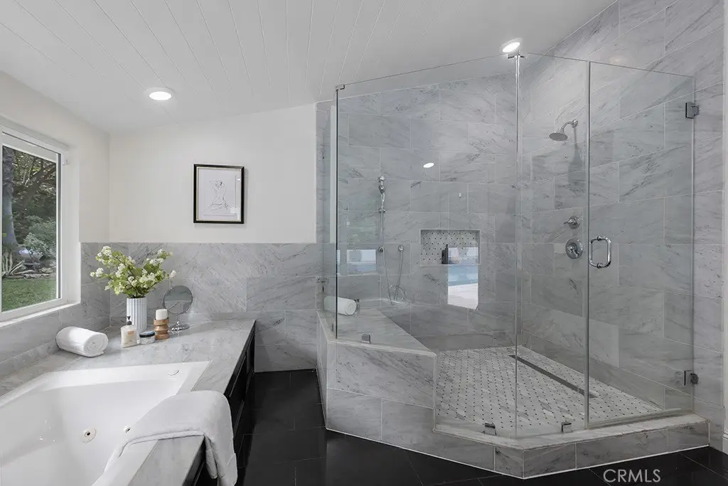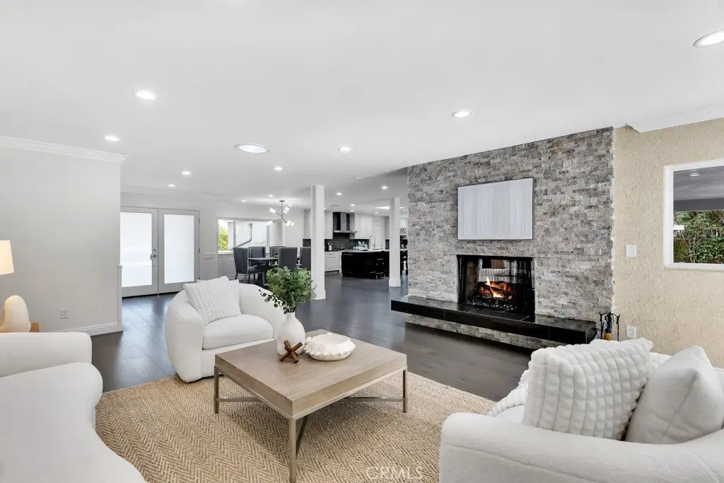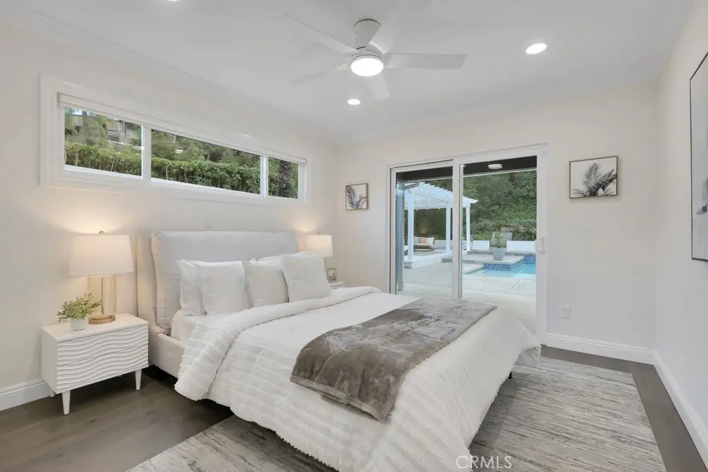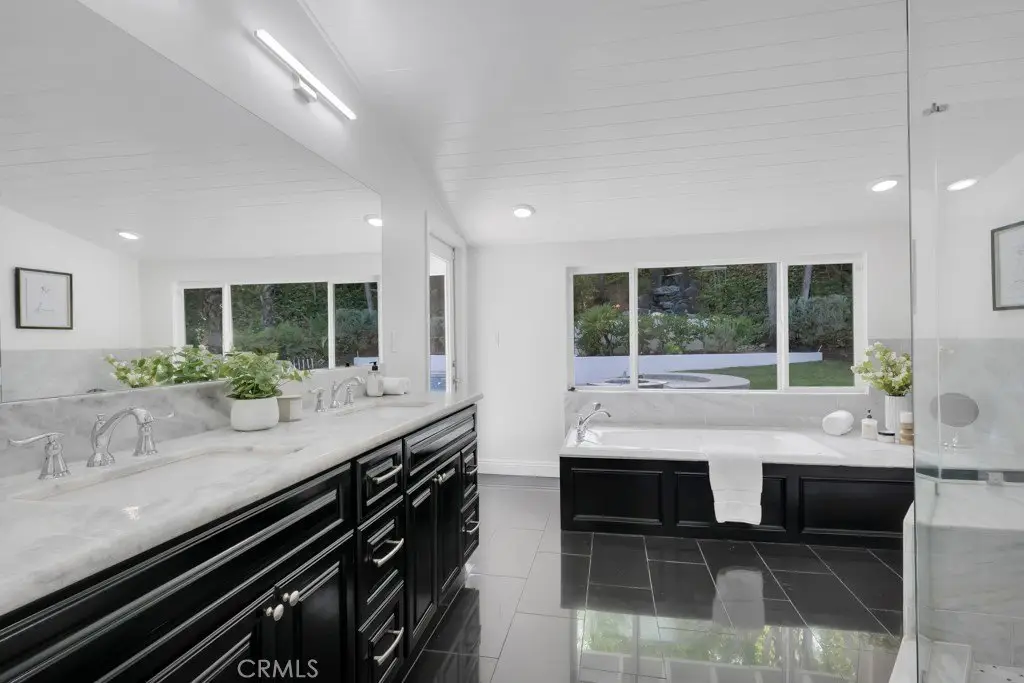 Welcome to your private sanctuary tucked away on a peaceful cul-de-sac in the highly sought-after hills of Tarzana. This luxuriously renovated single-story home offers 5 bedrooms, 4 bathrooms, and 3,386 sq ft of refined living space on a sprawling 21,529 sq ft lot designed for both relaxation and entertaining. Step inside to experience the seamless flow of this modern open-concept layout, filled with natural light and sophisticated finishes. The heart of the home is the designer kitchen, featuring custom cabinetry, a striking black arabesque tile backsplash, professional-grade stainless steel appliances, and an oversized granite island perfect for gatherings. The kitchen opens to expansive living and dining areas anchored by a floor-to-ceiling double-sided stone fireplace, creating an inviting ambiance for both casual and formal entertaining. Retreat to the spacious primary suite, complete with a walk-in closet, spa-inspired ensuite, and a private bonus room ideal for a home office, gym, or nursery. Each bedroom is thoughtfully positioned for privacy and comfort, including a guest suite with its own bath. Outside, experience your very own resort-style paradise. The sparkling pool with a Baja shelf invites you to unwind under the California sun, while the covered patio and string-lit pergola offer the perfect setting for al fresco dinners and weekend gatherings. A large grassy lawn provides space for kids or pets to play, complete with a charming 2-story treehouse and slide, while a hillside viewing deck delivers breathtaking sunset views over Tarzana’s rolling landscape. Blending luxury, comfort, and tranquility, this home perfectly captures the essence of Southern California living — a rare find in one of Tarzana’s most desirable neighborhoods. Close to premier shopping, dining, and top-rated schools, this property truly has it all.