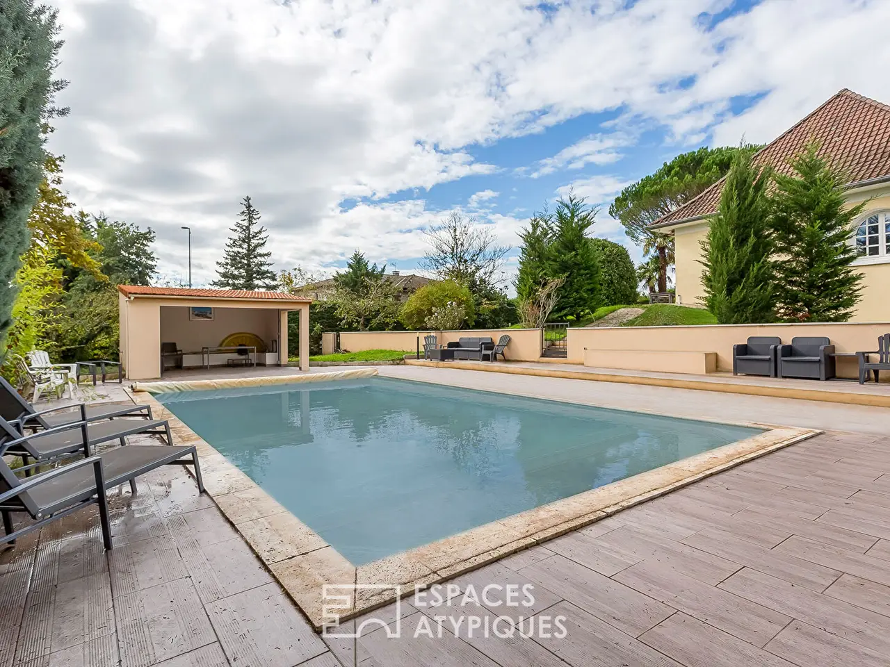Located in Tassin la demi-lune on the border of Craponne, this renovated house built in 1976 is located on a plot of land of 1502m2 with swimming pool and recent pool house (2020). The entrance opens onto a magnificent staircase and serves on one level the independent equipped kitchen opening onto the large terrace, the living/dining room with fireplace, a 15m2 office and a bedroom with private bathroom. The upper floor consists of three large bedrooms with exposed beams which share a bathroom. The basement, partly semi-buried, consists of a guest bedroom with bathroom, a 35m2 games room, a cinema room, a laundry room and a garage of almost 80m2. The quality of construction, the pleasantness of the garden with the swimming pool and the large terraces as well as the volume of the rooms are the main assets of this beautiful house. ENERGY CLASS: E / CLIMATE CLASS: B Estimated average amount of annual energy expenditure for standard use, established from energy prices for the year 2021: between EUR3,420 and EUR4,680 REF. 8174 Additional information * 9 rooms * 6 bedrooms * 1 bathroom * 2 shower rooms * Outdoor space : 1502 SQM * Parking : 5 parking spaces