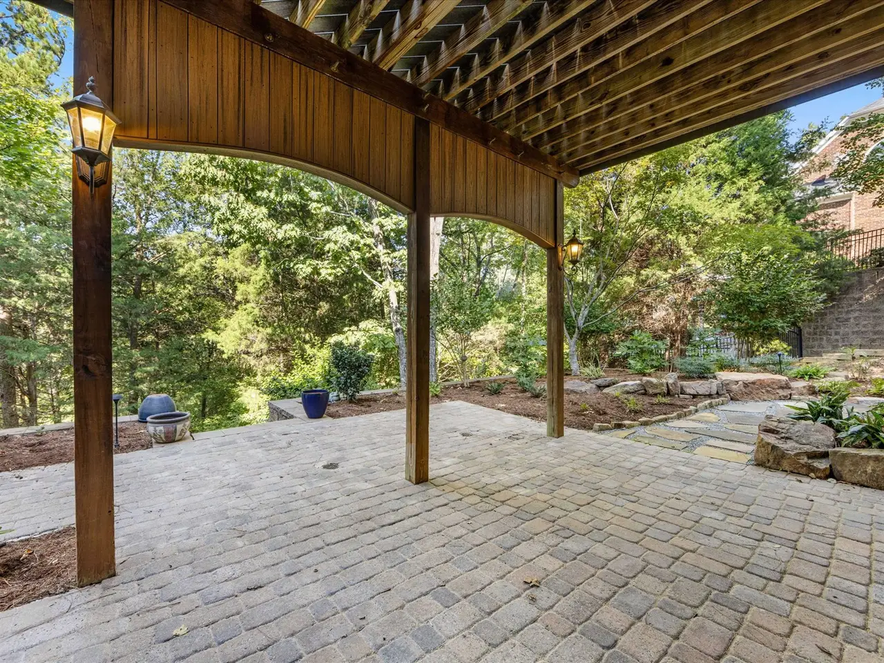 Covered deck overlooking landscaped backyard