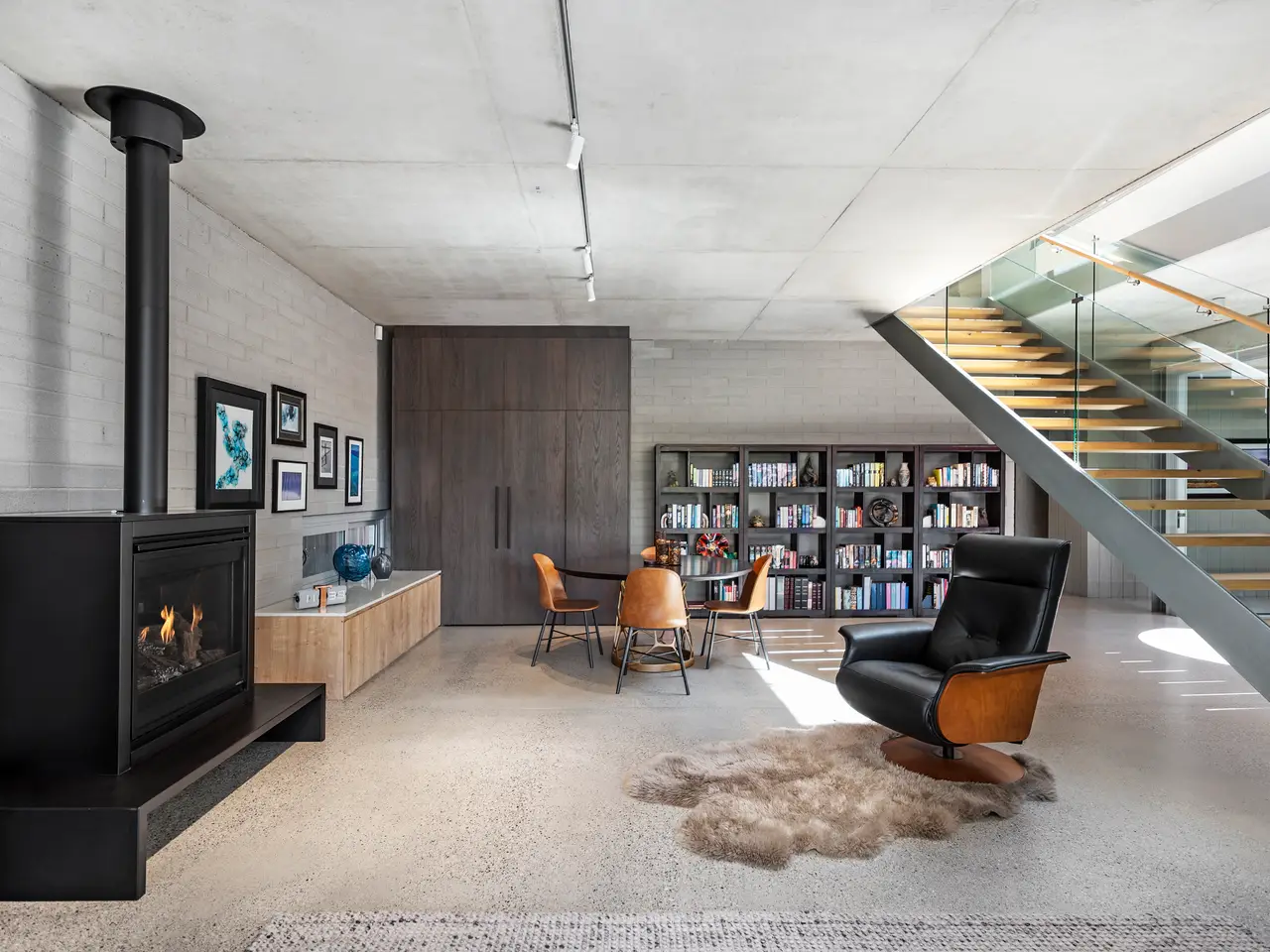 - Exposed concrete, brick, and steel materials