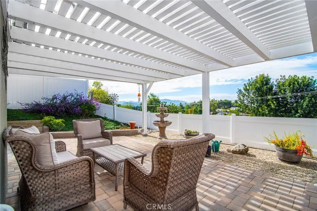 Welcome to this inviting two-story home, peacefully tucked at the end of a quiet cul-de-sac in Thousand Oaks with scenic hillside and sunset views.Light and inviting, this residence offers comfortable living spaces, fresh interior paint, wood-style flooring, plantation shutters, newer vinyl windows, and updated plumbing, creating a move-in-ready feel throughout. The entry opens to bright living and dining spaces that flow easily for everyday living and entertaining. The kitchen provides ample counter and cabinet space with a breakfast bar overlooking the family room, creating a natural gathering area with access to the backyard. Upstairs bedrooms enjoy peaceful treetop and hillside views, with an additional bedroom located on the main level for guests, work-from-home needs, or flexible use. Bathrooms are updated with modern finishes that complement the home’s clean, refreshed feel. Step outside to enjoy the best of California living under the new backyard patio cover, offering a welcoming space for outdoor dining, relaxing, and taking in evening skies. The yard features low-maintenance hardscape, mature landscaping, and a tranquil fountain — a calm retreat ready for everyday enjoyment. Located near parks, scenic trails, award-winning Conejo Valley schools, shopping, dining, and commuter access, this home brings together comfort, convenience, and a serene setting in one of Thousand Oaks’ most desirable neighborhoods.