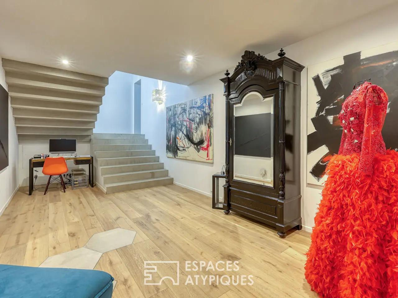 On the lower floor, an art gallery-style home office reveals itself as a confidential space, ideal for working. The atmosphere continues in a room dedicated to evenings, where billiards, pinball, fireplace and sofas create a convivial setting.