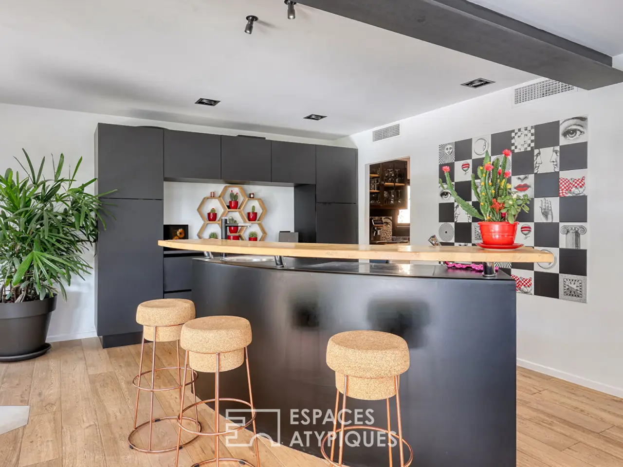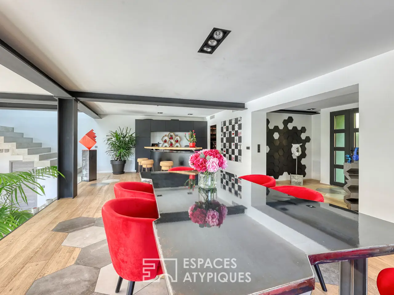 The theatrical dining room harmoniously complements the living room, connected to a fitted and equipped kitchen, ingeniously designed for entertaining with its counter.