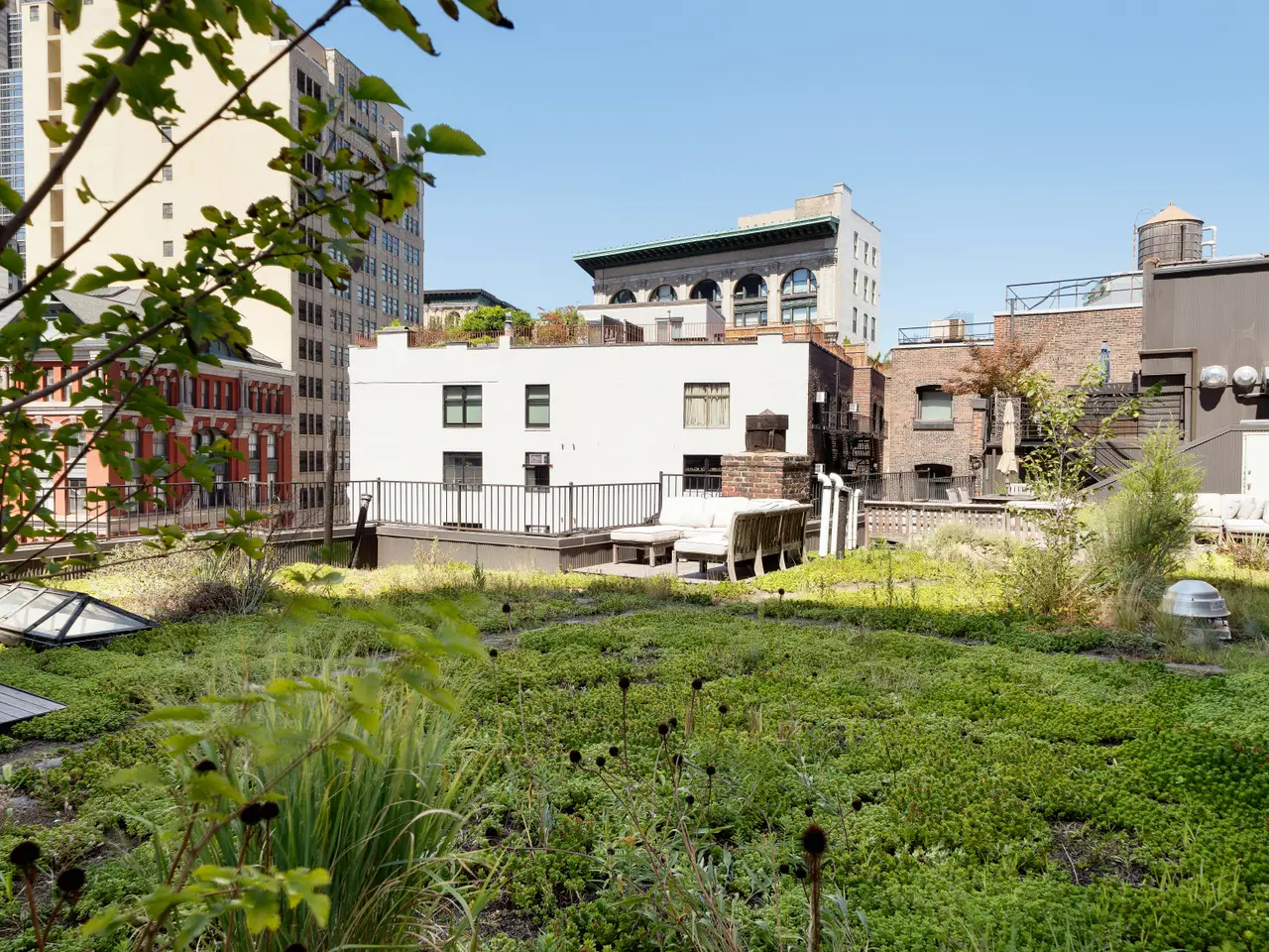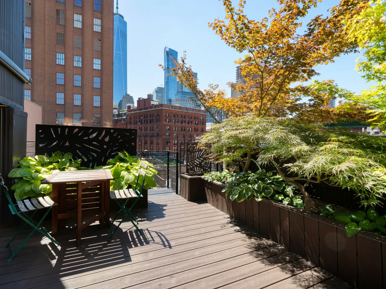 This meticulously renovated Tribeca loft seamlessly blends the iconic character of the neighborhood with contemporary luxury living. Atop a 6 story walkup and crowned with a 420 SF private roof deck this home offers a unique layout of multiple levels and an unparalleled indoor-outdoor living experience in one of NYC's most coveted neighborhoods. Tucked away on a picturesque, tree-lined street, this 2-bed, 2.5-bath loft exudes classic Tribeca charm-soaring beamed ceilings, exposed brick, and a stunning wall of floor-to-ceiling windows where you can enjoy sunset views over the cobblestone streets and eclectic architecture of the surrounding area. The gourmet kitchen seamlessly integrates into the living/dining area, featuring Carrara marble countertops and top-tier Bosch and Bertazzoni appliances. Thoughtfully designed for privacy, both bedrooms have en-suite baths and generous closet space, positioned on opposite sides of the loft. Enter the primary suite through a salvaged freight elevator door from the original manufacturing space, where you'll find 14' ceilings, a skylight, a sitting area perfect for a home office or dressing room, a walk-in closet, and a luxurious marble bath with a deep soaking tub. A retractable staircase in the living room leads to a landscaped private outdoor space with additional access to the building's furnished common roof deck. As an added bonus, the original mechanical room for the building's freight elevator shaft has been reconstructed into a flexible space unlike any other in NYC. With its own heating/cooling system, this space is ideal as a gym, home office, studio, or anything you could imagine. Additional highlights of this one of a kind home include central heating & air, an in-unit washer/dryer, abundant built in closet space throughout and a video intercom. Please note: gas and water are an additional $153/month. 1 Worth Street offers unparalleled access to one of NYC's most sought-after neighborhoods. Known for its cobblestone streets, historic architecture, and vibrant arts scene, Tribeca is home to some of the city's best dining, shopping, and entertainment. Indulge in Michelin-starred cuisine at Marc Forgione or enjoy classic Italian at Locanda Verde and modern French cuisine at The Odeon. For brunch, Bubby's is a neighborhood favorite. High-end shopping awaits at Shinola and Patron of the New, while the Tribeca Film Festival adds a cultural touch each year. Enjoy outdoor escapes at Hudson River Park and Pier 25, featuring waterfront views, a skate park, and mini golf. Convenient access to multiple subway lines (1, 2, 3, A, C, E, 4, 5, 6, R, W) ensures effortless travel throughout the city.