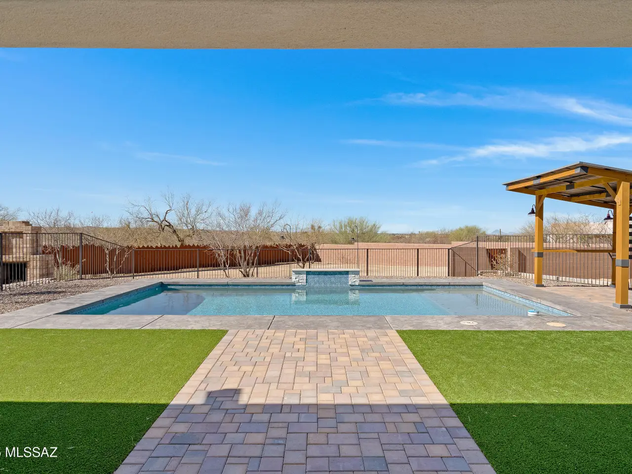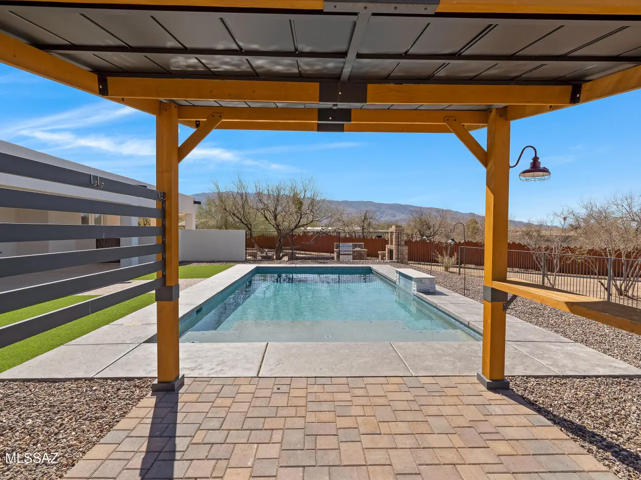 **End of the Road in Magical Tanque Verde!** Breathtaking Contemporary Oasis Crafted in 2025. Embrace clean lines & a thoughtful floorplan. Mountain views from nearly every window! Minutes away, ntl. forest awaits exploration, along w/ shopping, golf & fine dining. Enjoy the FREEDOM of life without an HOA! Shaded by deep, full-length covered patio. Oversized windows bathe the great room in natural light with views of the waterfall pool. Backlit, remote ignition fireplace allows you to set the perfect mood. White quartz w/gray veining provides an elegant complement to the gourmet kitchen's seating island. With a Split BR plan, the primary bath stands out as a work of art! The finished yard boasts BBQ, fireplace, shade trees in divided spaces w/over 600ft of walls & fencing on an ACRE LOT.