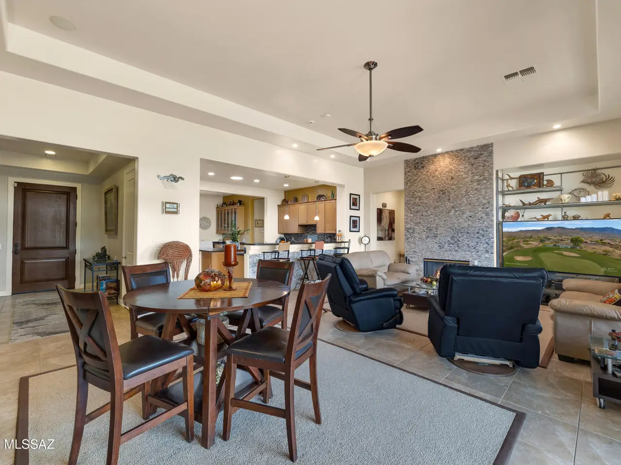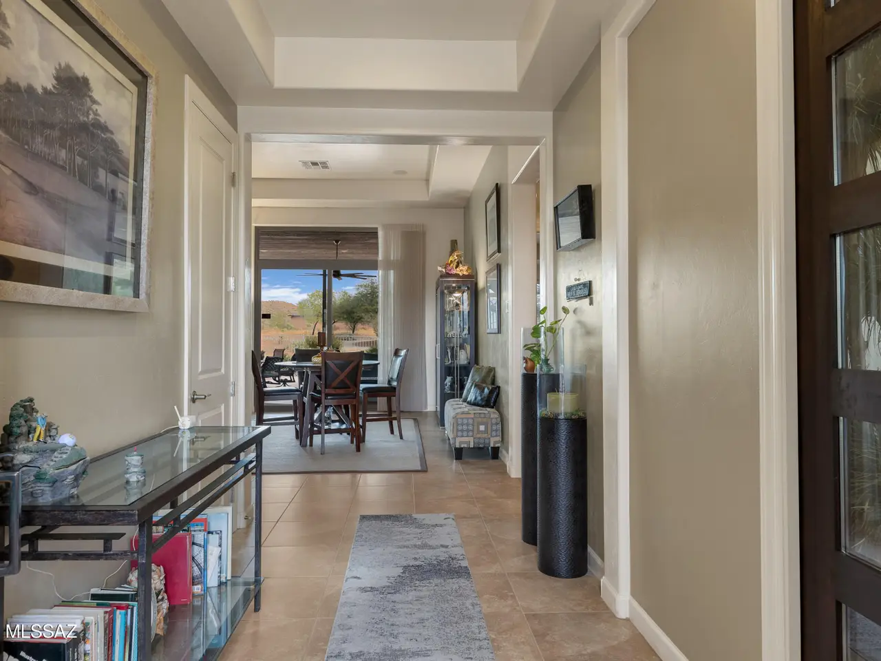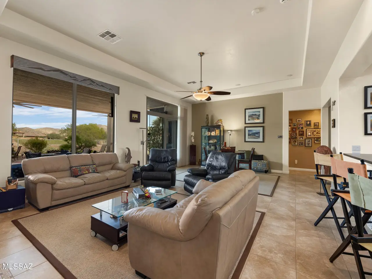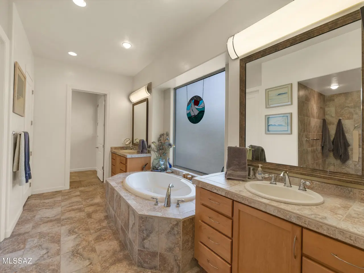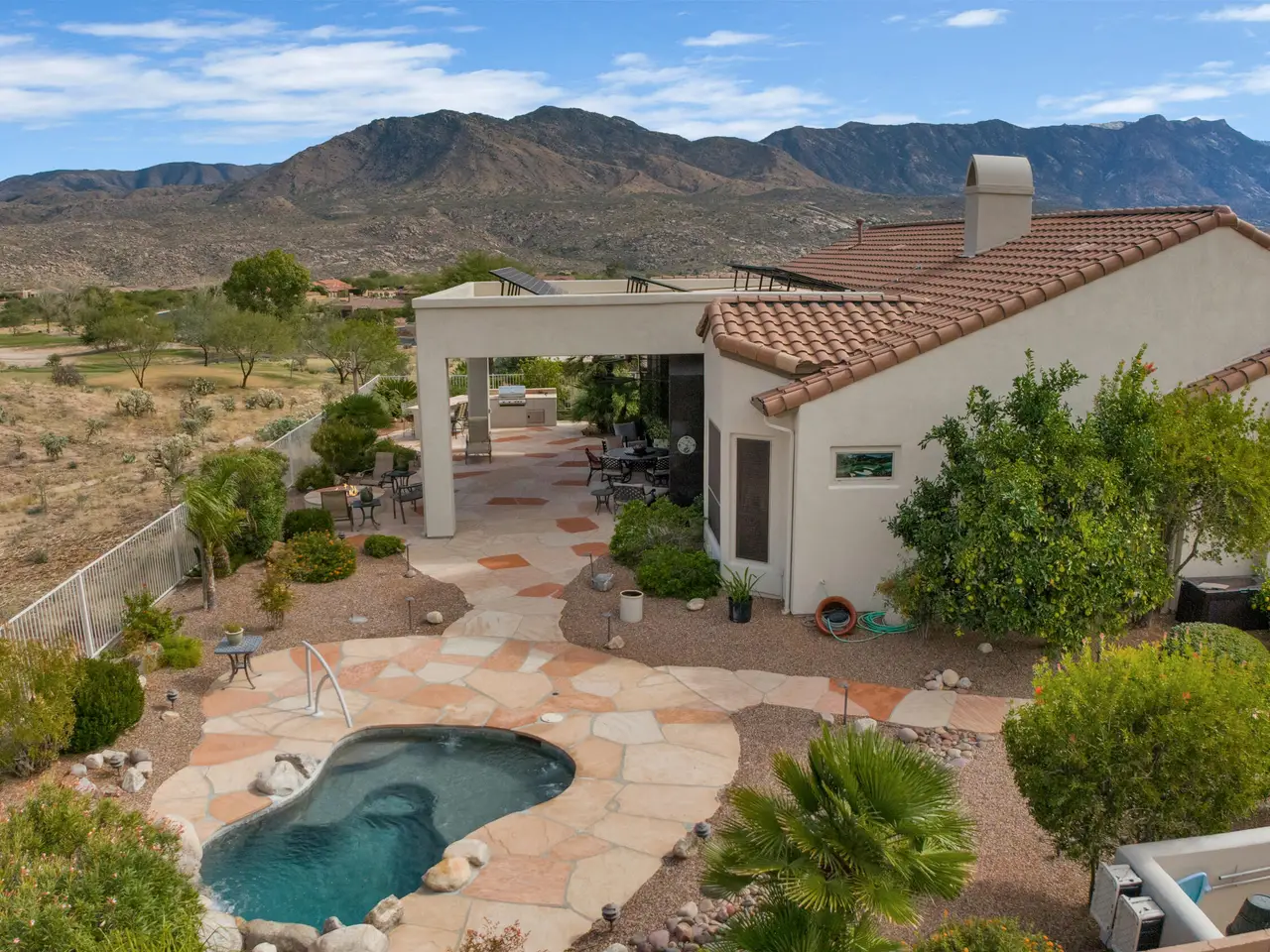 Highly upgraded SABINO model sits above the 11th hole and 12th tee box of The Preserve golf course with sweeping views of the Catalina Mountains from both the front courtyard and the expanded rear patio. Home features an owned 9.5kW solar system, Tesla Powerwalls, 2023 Trane 18 seer HVAC system, new water heater and R30 insulation. Kitchen has a custom cabinet, quartz countertop, built-in ice maker and wine cooler. Rear patio roof has been extended 8ft with tongue and groove ceiling. 2 Bromic gas heaters and flagstone patio. Large entertaining backyard has Pebbletec spool, rock waterfall, fire pit, BBQ island that seats six and endless mountain views. Also has a side load garage and windows have sun screens. Contact today for your private showing.