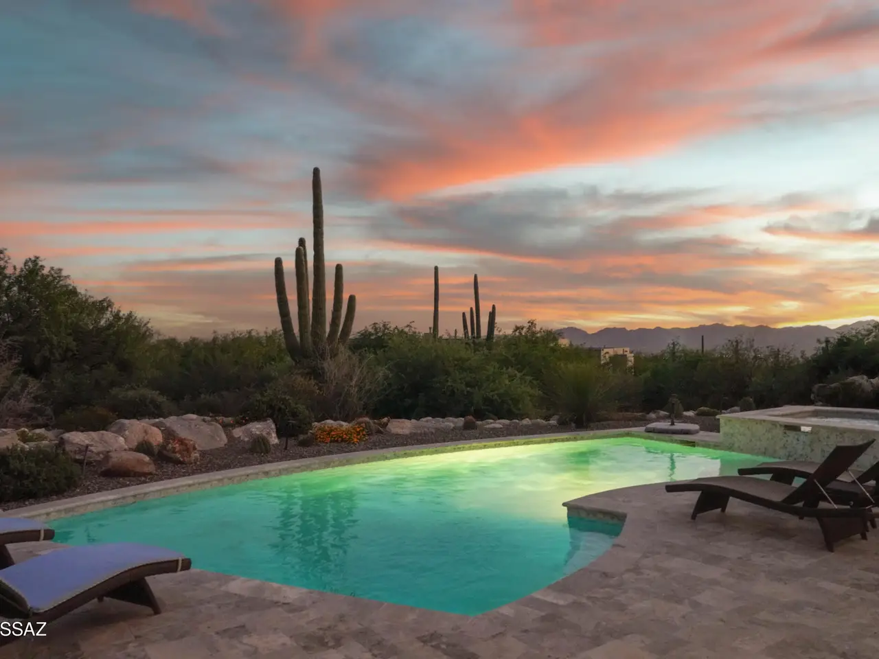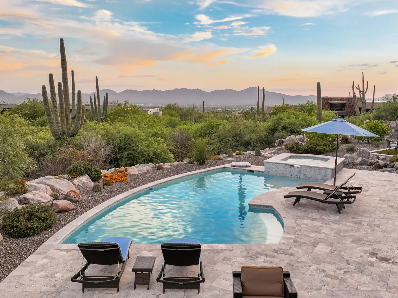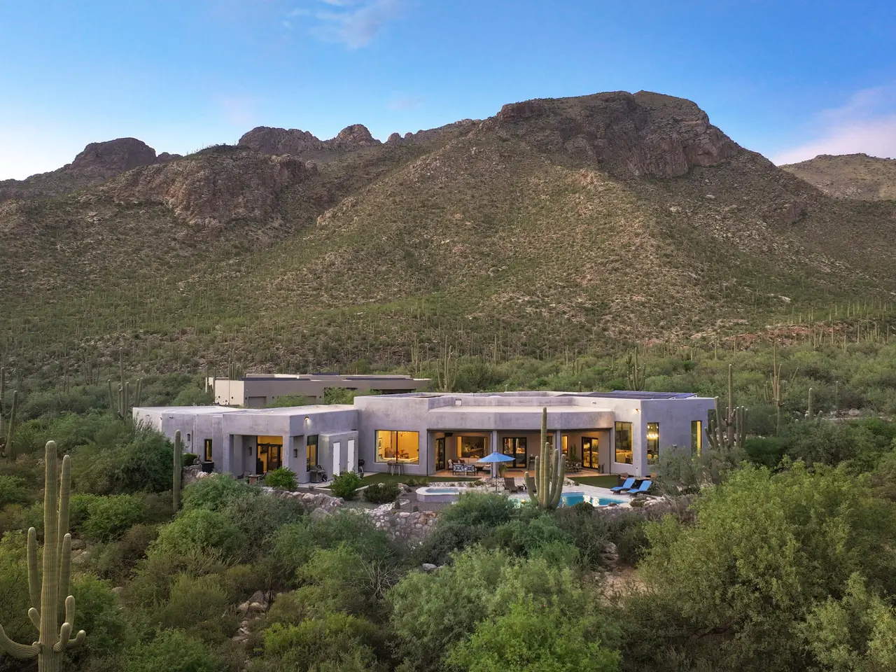 Modern Elegance Meets Desert Serenity in Prestigious Pima Canyon! Nestled on 1.2 private acres, this 5,805-sqft custom residence masterfully blends sleek modern architecture with timeless desert sophistication. Designed by renowned architect Kevin Howard, the home showcases impeccable craftsmanship, breathtaking views, and an effortless indoor-outdoor lifestyle. From the moment you step through the custom Victory Metal Works iron and glass entry door, you're greeted with soaring style and substance--five spacious ensuite bedrooms, energy-efficient design, a 2021-owned solar photovoltaic system, and three high-efficiency Trane HVAC systems (14-16+ SEER). The resort-style backyard is an entertainer's dream, featuring a sparkling pool and spa, travertine