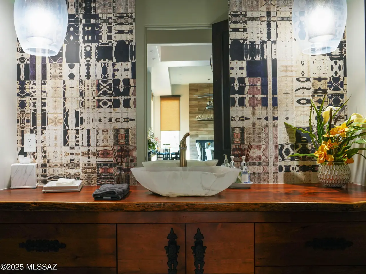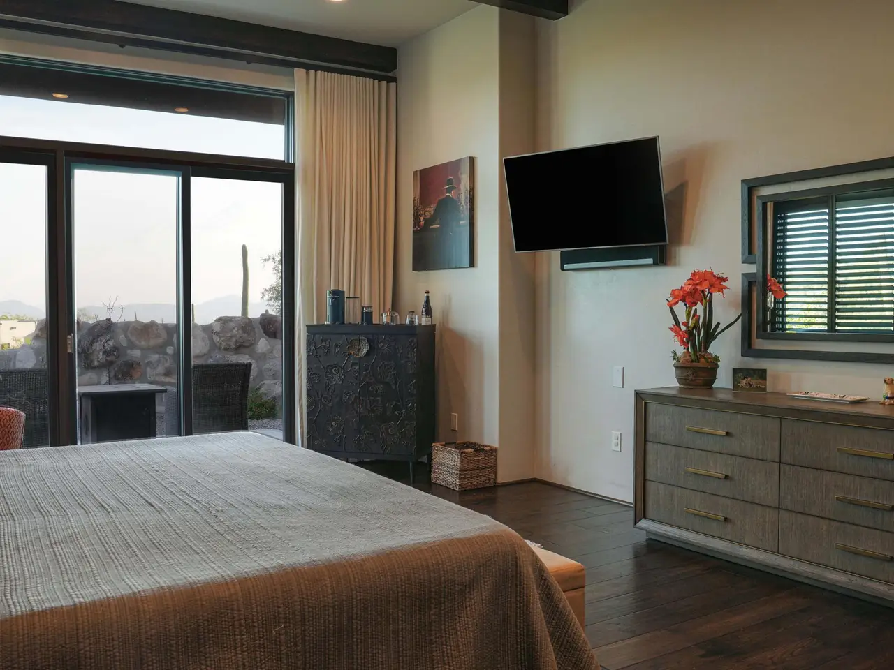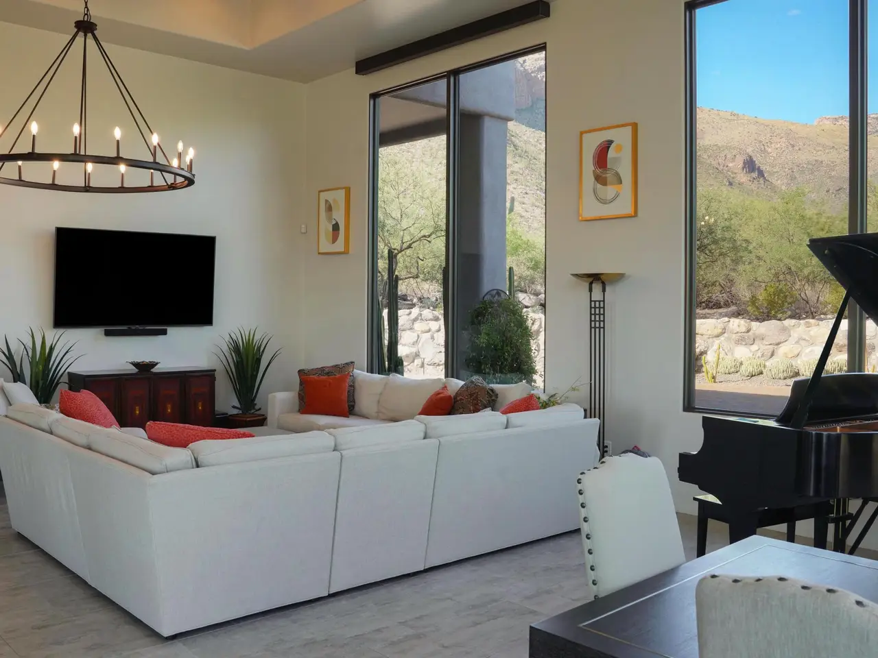 Modern Elegance Meets Desert Serenity in Prestigious Pima Canyon! Nestled on 1.2 private acres, this 5,805-sqft custom residence masterfully blends sleek modern architecture with timeless desert sophistication. Designed by renowned architect Kevin Howard, the home showcases impeccable craftsmanship, breathtaking views, and an effortless indoor-outdoor lifestyle. From the moment you step through the custom Victory Metal Works iron and glass entry door, you're greeted with soaring style and substance--five spacious ensuite bedrooms, energy-efficient design, a 2021-owned solar photovoltaic system, and three high-efficiency Trane HVAC systems (14-16+ SEER). The resort-style backyard is an entertainer's dream, featuring a sparkling pool and spa, travertine
