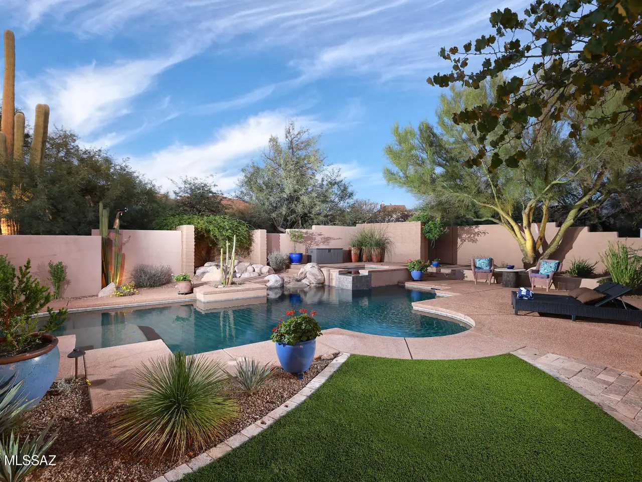 This beautifully updated home features breathtaking mountain views on 3.2 Acres with a 4 car garage & Rock waterfall and elevated heated spa that flows beautifully into the heated pool. A gated front courtyard with a soothing fountain welcomes you and sets the tone for what you're about to experience. Step through the custom mesquite entry door into a light-filled living space with walls of windows that frame the surrounding scenery. The gourmet kitchen, completely remodeled in 2023, showcases shaker-style cabinetry with lots of drawers. All Stainless steel appliances with Bosch refrigerator and top of the line WOLF gas cooktop with griddle, WOLF convection oven, WOLF steam oven - a dream for any home chef. With 4 bedrooms plus an office, plus a den/TV room and 4 full baths. there's plenty of space for everyone.The luxurious primary suite offers a private sitting area, a two-sided fireplace, spa-like bath, and a large walk-in closet. Step outside to your resort-style backyard featuring a sparkling pool with rock waterfall, heated spa, outdoor fireplace, and artificial turf for easy care. The built-in outdoor kitchen with BBQ and seating is perfect for entertaining under the stars. Additional highlights include a tankless water heater (2021), two newer HVAC systems (2019), and a high-efficiency water softener. All this just half a mile from the trailhead, where you can enjoy hiking and the beauty of nature right outside your door.