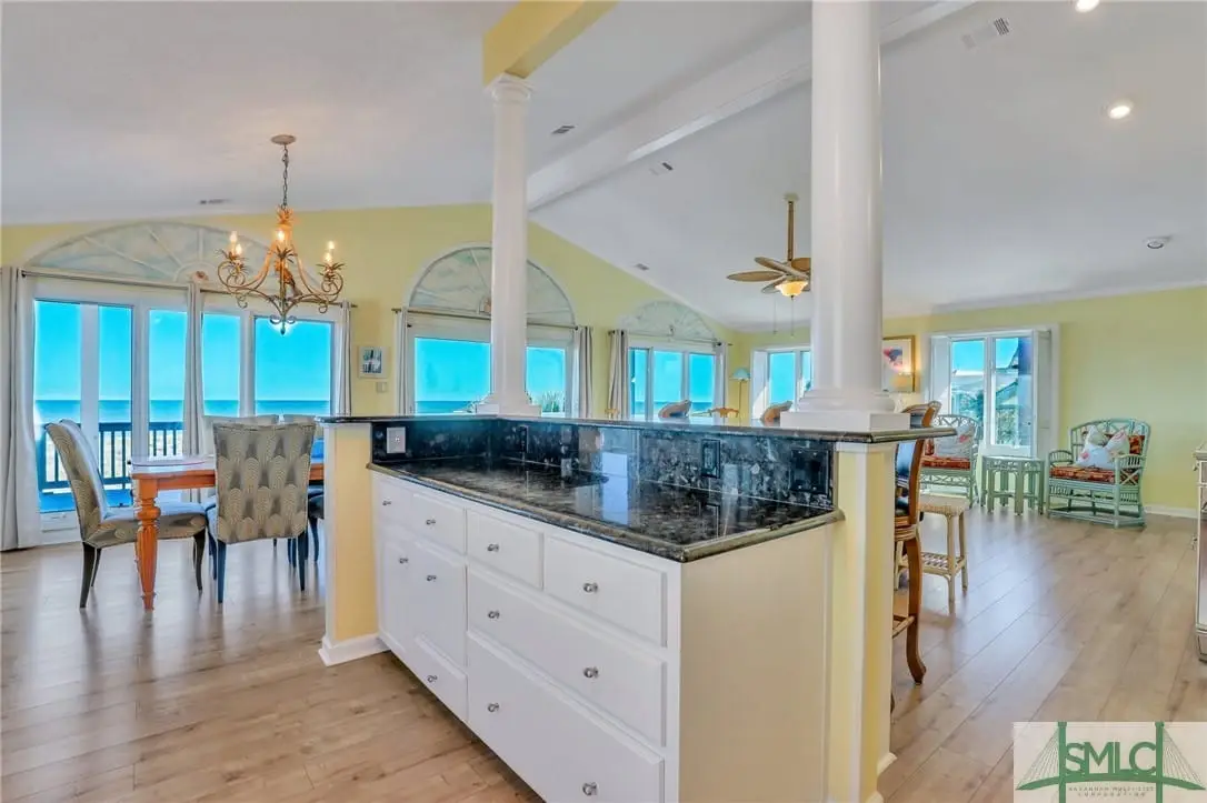 OCEANFRONT in the RT zone on Tybee Island steps away from dipping your toes into the Atlantic Ocean. Known as Bella Luna, this beach house has an open living concept with kitchen, dining, living areas featuring hand painted murals and unparalleled panoramic view of the Ocean and beach from the upper lever. From there step out onto the sun deck to take in the sounds of the sea with frolicking dolphins and shore birds, watch the international ship traffic entering channel while soaking up the sun or toasting the end of the day. This level also includes 1 guest room & bath plus generous in-law suite with morning kitchen, fireplace and deck. The lower-level consists of entrance foyer, elevator, sizable laundry, 3 bedrooms, 2 baths and easy to maintain tile floors throughout. The front facing garage includes a handicap ramp and additional parking for 6 cars in the driveway. Bella Luna is an income-producing property with a strong rental history and is the essence of Coastal Living.