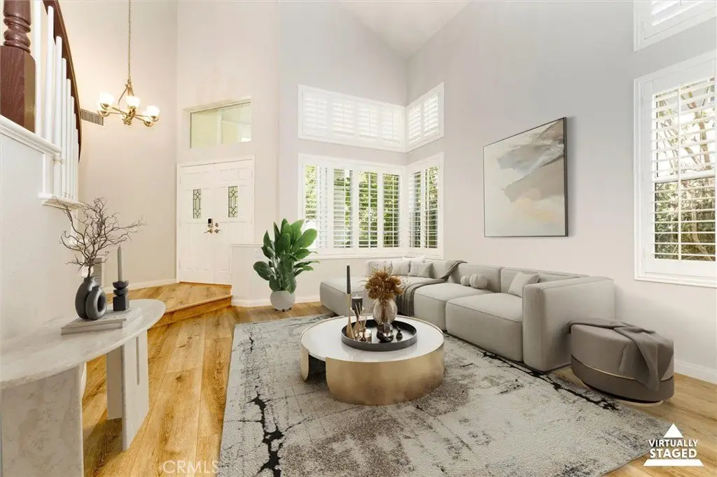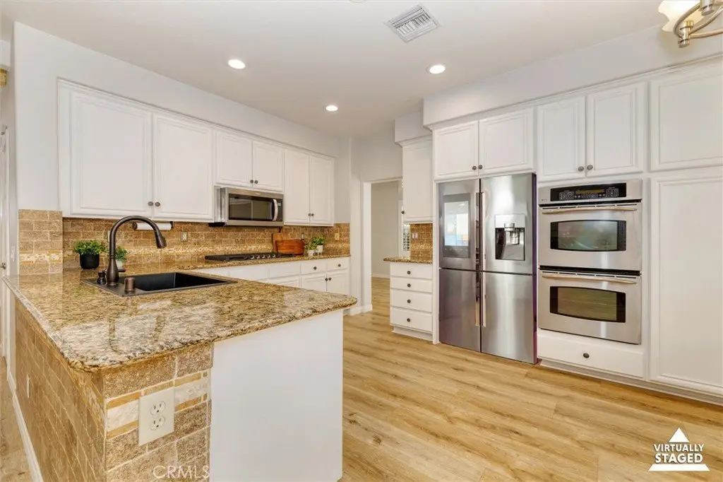 Step into this stunningly remodeled Warmington Plan I with 4 bedrooms, 2.3/4 bathrooms and a bonus room off the primary bedroom, perfect for a baby nursery or home office. Located in the highly sought after area of Valencia Northbridge, on a quiet cul-de-sac with quick access to the beautiful paseos leading to the community pools and tennis courts, Helmer’s Park and award winning Charles Helmers Elementary. Relax in your low maintenance backyard which was designed for entertaining with a built-in bar, BBQ, refrigerator, fire pit and lighting. In addition to palm trees, there is an apricot and apple tree for you to harvest fruit from each year. The backyard is also pre-wired for a hot tub. Sellers have recently updated the home with modern finishes including fresh paint inside and out, new flooring, updated bathrooms, new stove top, microwave and water heater. The large three car garage has a new opener and offers an over abundance of storage with custom cabinetry, built-in shelving and a loft for larger items. This beautiful home is move-in ready and waiting for you to enjoy all of the recent upgrades and wonderful community amenities. Welcome home to 23609 Wilmington Court!