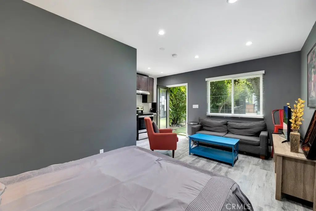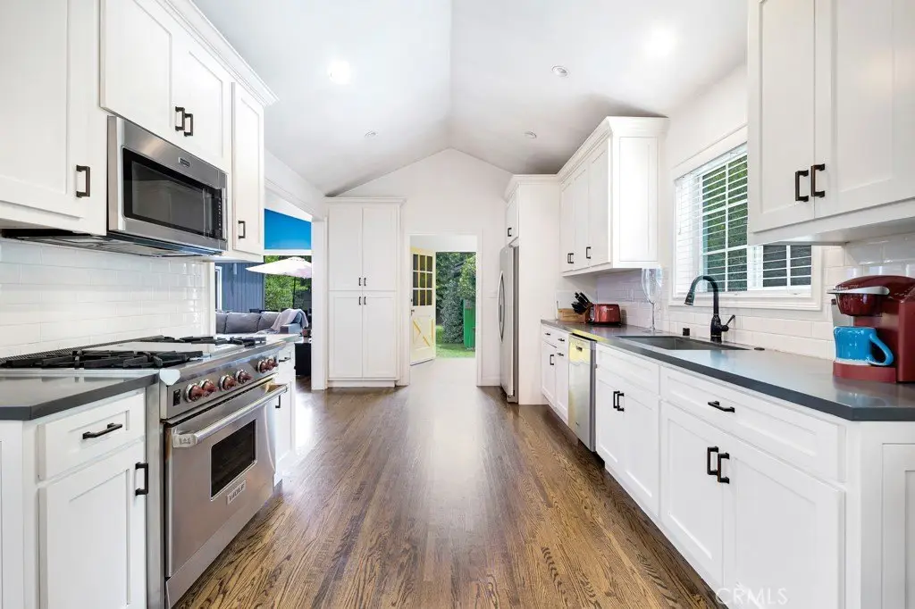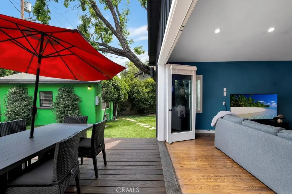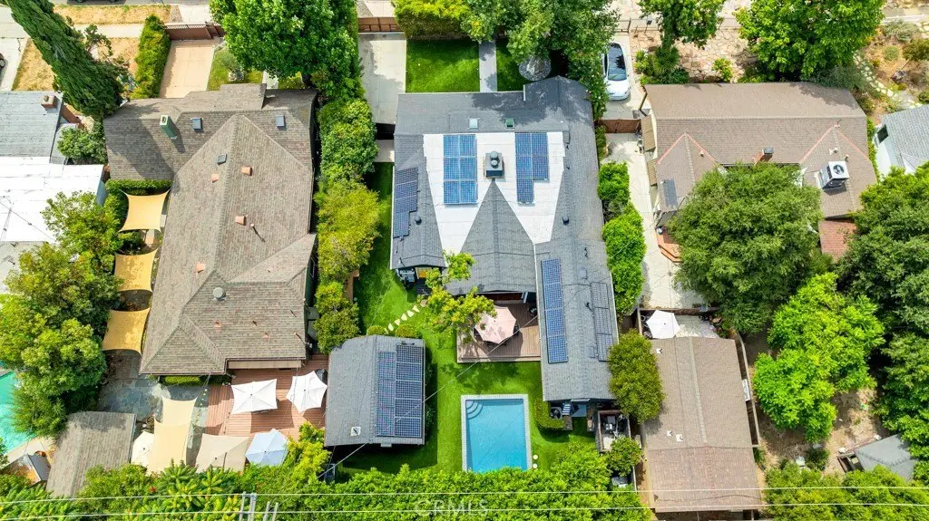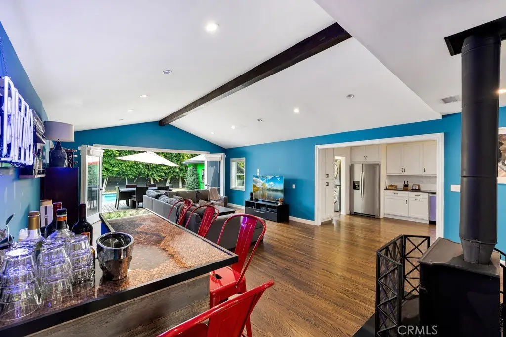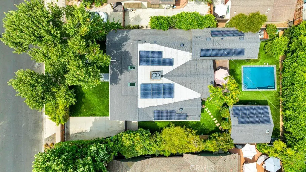 This stunningly renovated and expanded three bedroom, two bathroom home is a true masterpiece! With its soaring vaulted ceilings and open, airy layout, this residence showcases top-notch finishes and exceptional indoor/outdoor living. A charming Dutch door welcomes you into the cozy formal living room, featuring a sophisticated stone fireplace as its centerpiece. The seamless flow of the open-concept design leads you effortlessly into the dining area, which is beautifully highlighted by a striking architectural light fixture. The contemporary kitchen is a chef's dream, complete with custom cabinetry, quartz countertops, a Wolf range, and high-end stainless steel appliances. The newly designed master suite is a luxurious retreat, featuring a spacious walk-through closet and an ensuite bathroom adorned with premium finishes such as Waterworks tile, bespoke cabinetry, and elegant European fixtures. The airy great room is accentuated by large modern bi-fold doors that open up completely to reveal a brand-new deck and an exquisitely landscaped backyard. The outdoor space boasts a heated saltwater pool and a Studio ADU equipped with its own full kitchen. Additionally, the property is outfitted with fully paid-off Tesla solar panels and two Tesla batteries, enhancing its energy efficiency. This incredible opportunity is not to be missed!