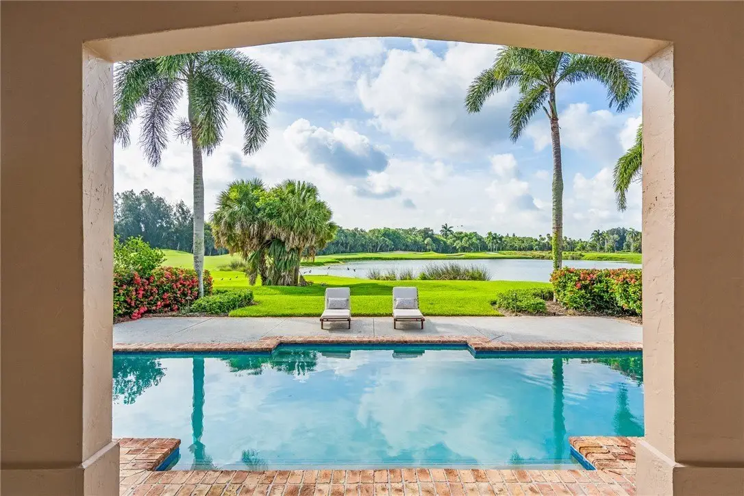Designed by renowned architect Peter Moor, charming one of a kind 3br/3.5ba golf estate. Custom details include dramatic vaulted ceilings, fireplace, stone flooring, expansive primary suite with luxurious bath and dual walk-in closets. Open great room plan with built-ins, grand eat-in island kitchen. Covered lanai overlooks the large lap pool and lush yard, all situated on one of Orchid Island's best estate size lots with beautiful lake and golf course views. Garaging for 3 cars plus golf cart. Room sizes approximate.