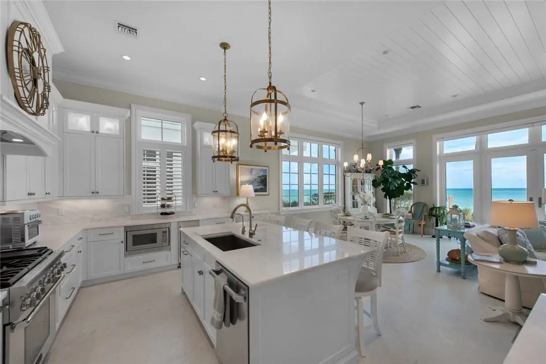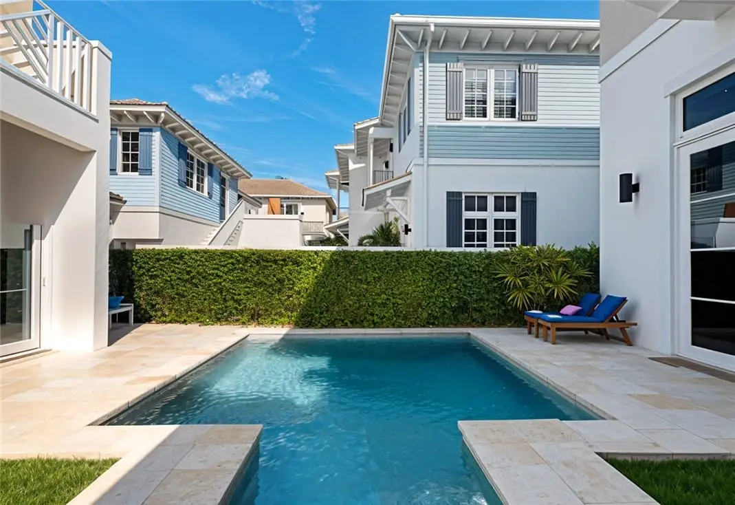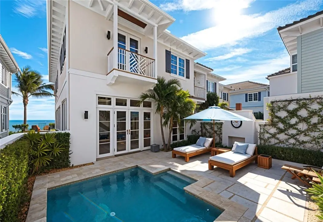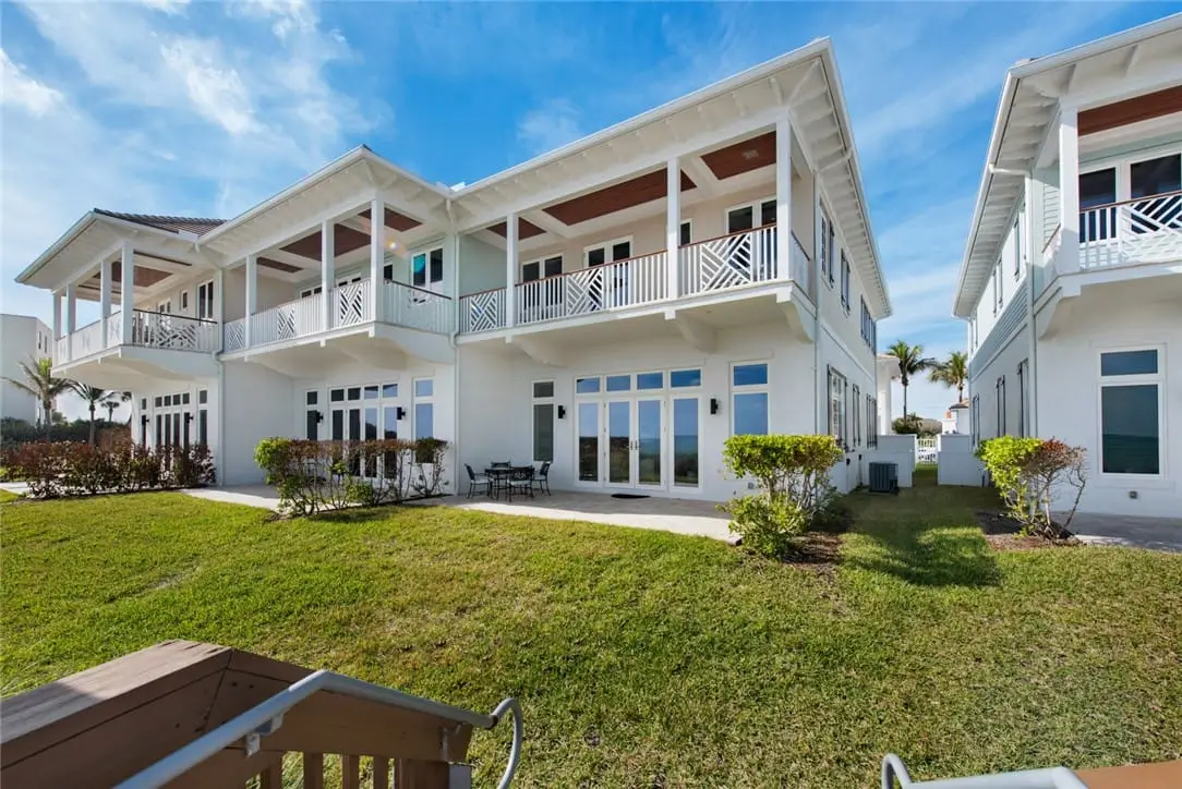 Oceanfront townhome seamlessly blends luxury with coastal charm! Boasts natural light, impact glass, and hardwood and stone floors. The gourmet kitchen, living room with fireplace and covered beachfront lanai offer elegance, while an elevator adds convenience. The master suite with a serene balcony and a guest haven upstairs ensure comfort and the courtyard with pool and fireplace provides a serene retreat. The courtyard beckons with an electric-heated pool, gas fireplace and built-in grill. Private fourth bedroom above garage. Enjoy private beach access and proximity to an array of restaurants and shops. Sizes approximate/subject to error.