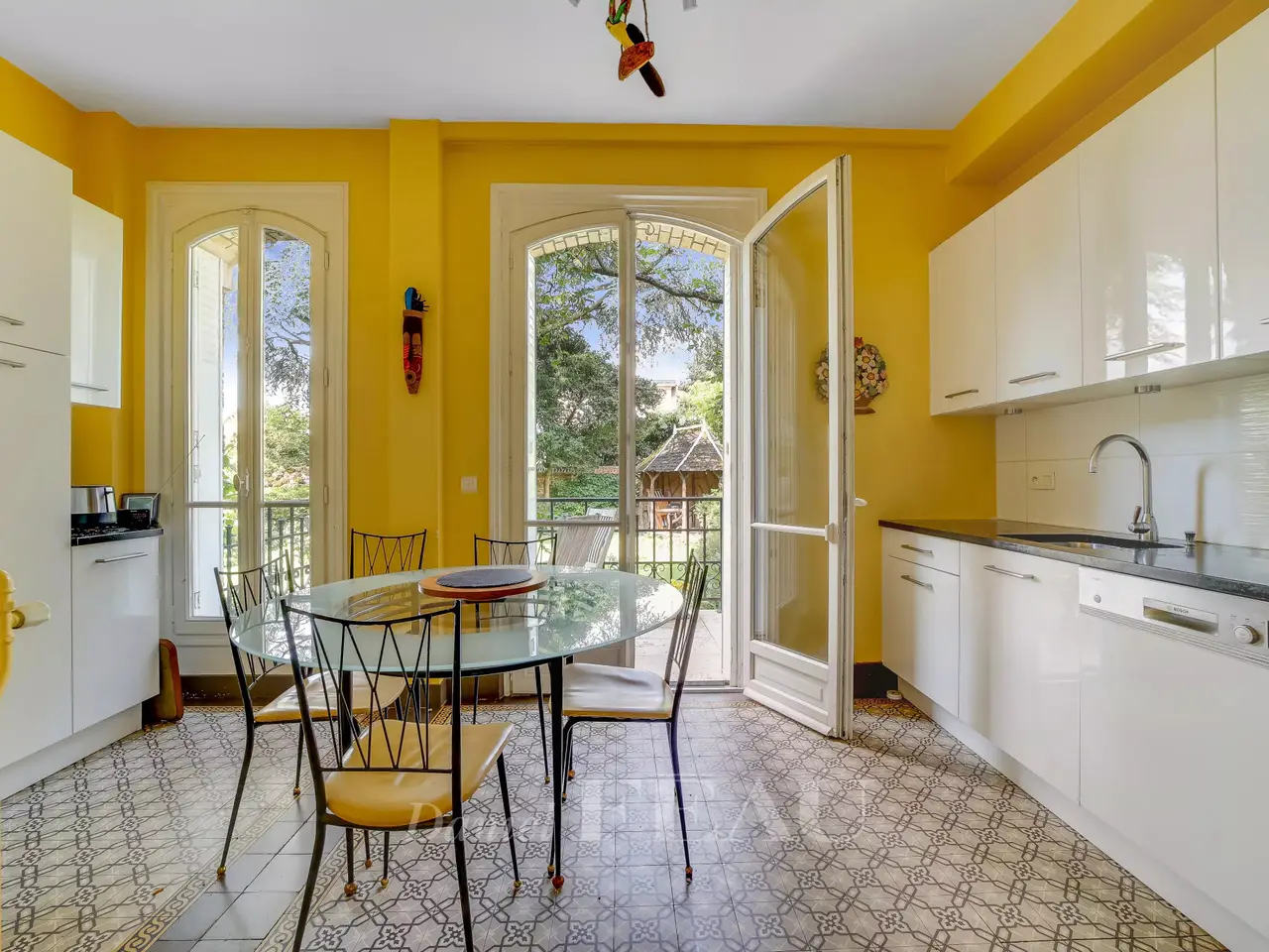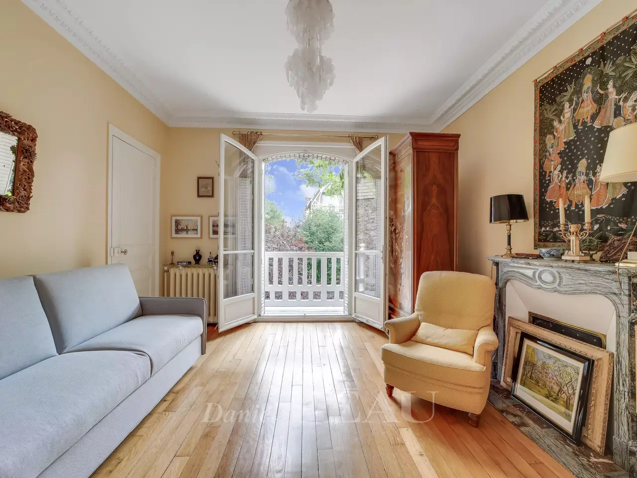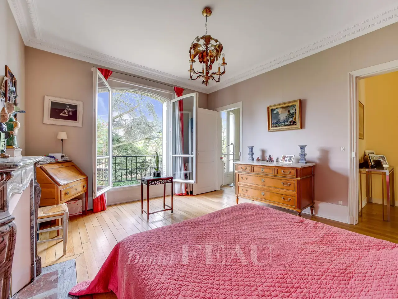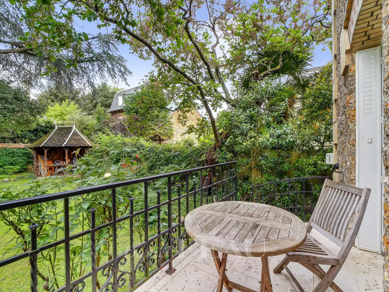 This well-maintained early 20th century brick and millstone-built property is set in a 545 sqm plot. Offering 320 sqm of floor space and about 250 sqm of living space, it includes an entry with fitted cupboards featuring cement mosaic floor tiles, a dual-aspect double living/reception room featuring a Prussian stove, oak parquet flooring and high ceilings, a drawing room or study, a fitted and equipped kitchen with dining facilities accessing a stone-decked terrace, and a guest wc. Period features also include sculpted iron radiators. The original staircase accesses a landing leading to master bedroom with a bathroom and wc, a bedroom with a balcony, a shower room, a single bedroom and a wc. The top floor comprises three bedrooms, a bathroom, a dressing room and a wc. Fitted storage space. Period features also include panelling, Benefiting from exterior access, the convertible entresol includes a storage room, a utility room, a boiler room and a wine cellar. The garden benefits from automatic sprinkling and features a gloriette under a centennial cedar, and a rockery. Parking space. 7 minutes by foot from the station and the schools, and 12 minutes from Place du Marché. Easy A86 and A13 motorway access.