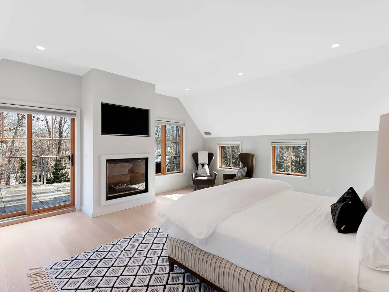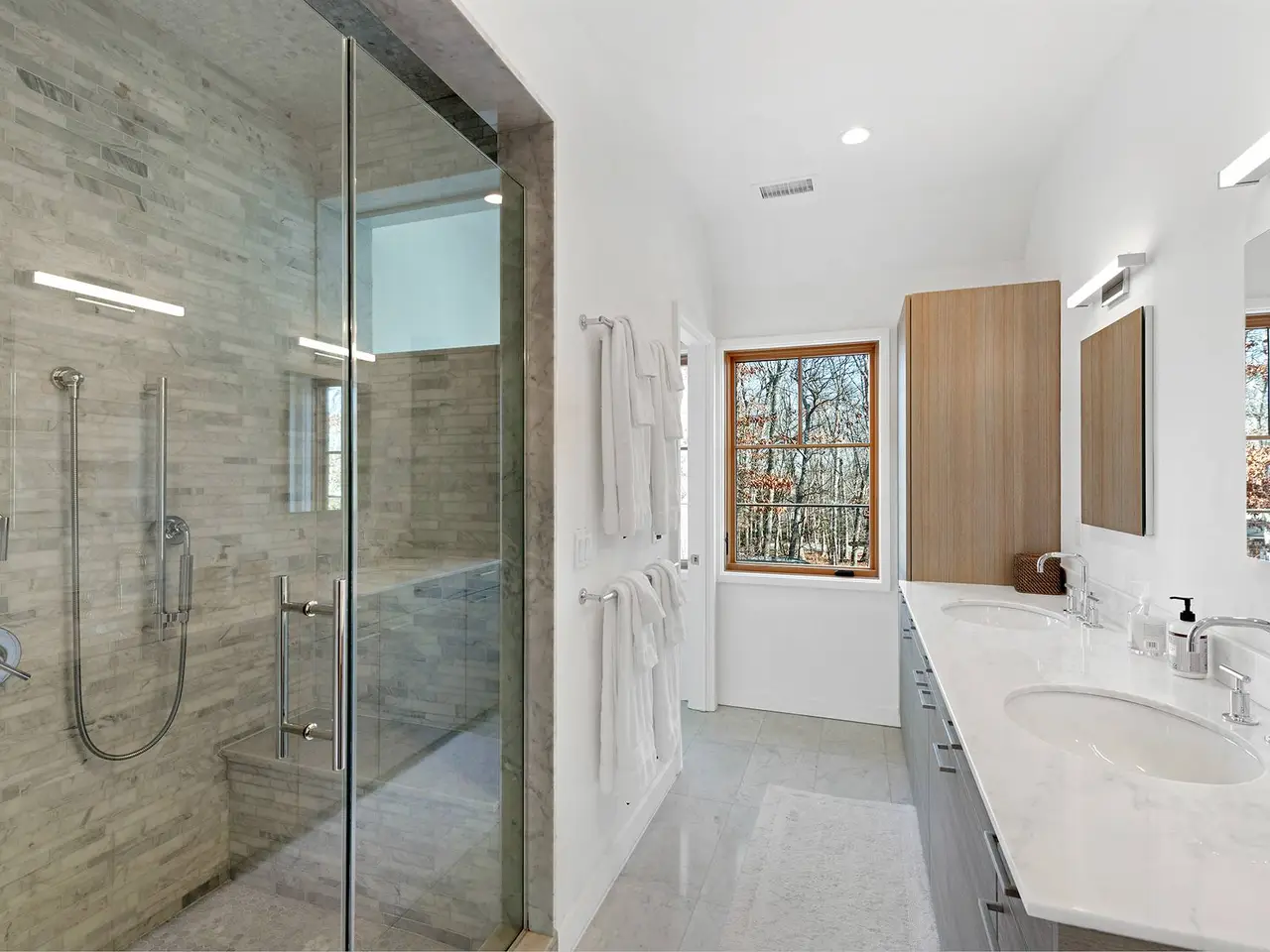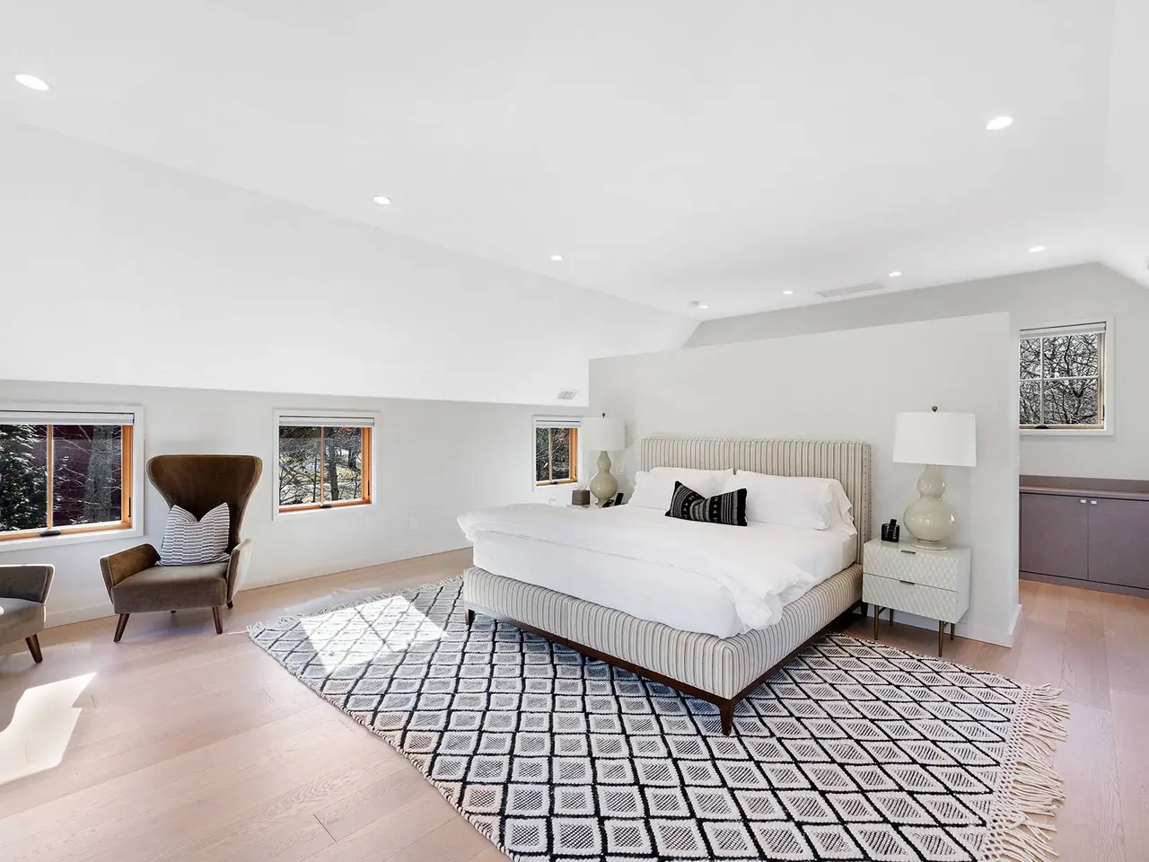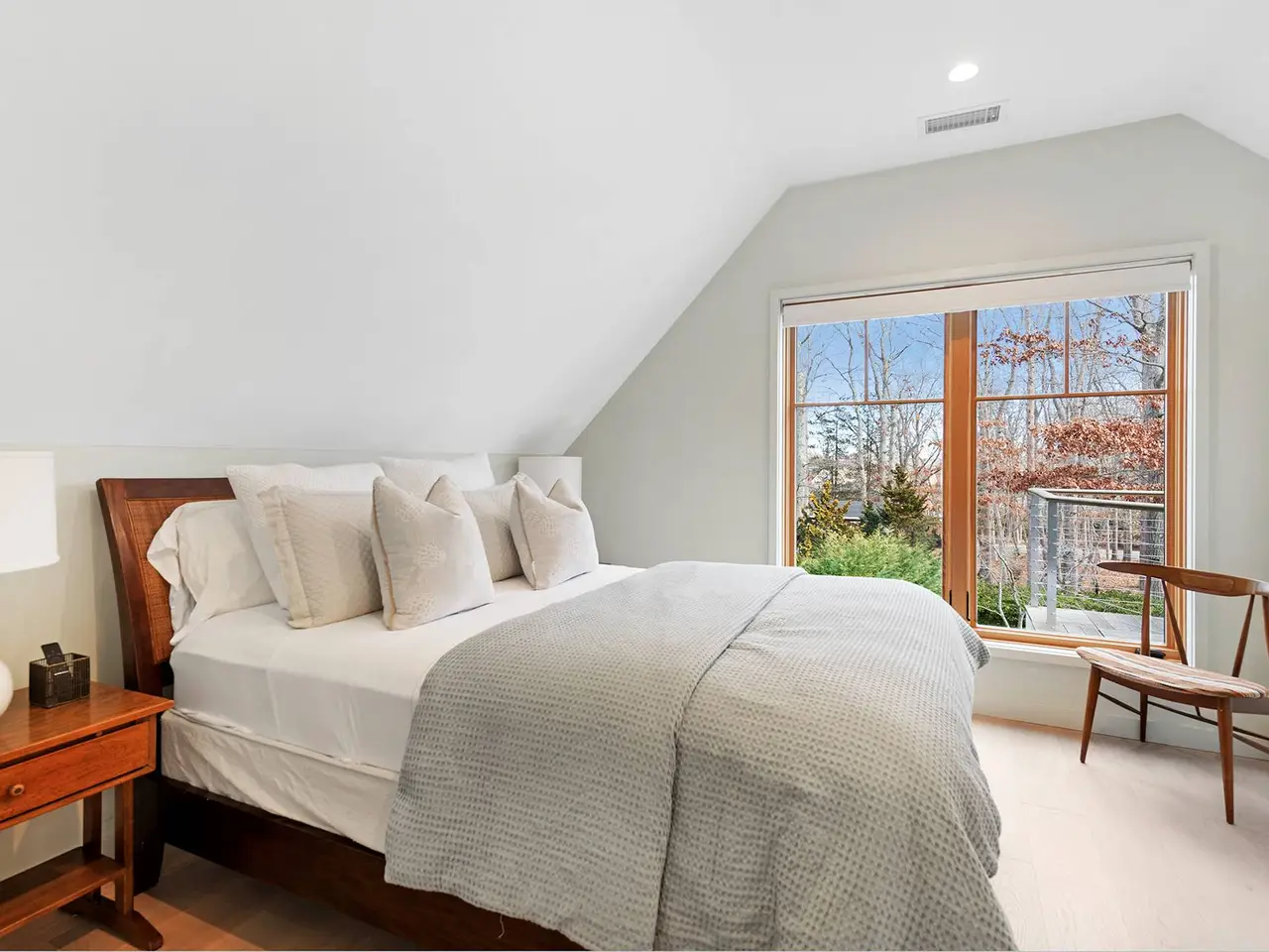Close to the Village, within a few blocks to a private community beach and less than 1.5 +- miles to Havens Beach in Sag Harbor, this stunning, modern farmhouse features six bedrooms and seven-and-one-half baths across approximately 3,800 square feet. Multiple sleek windows and oversized sliders create walls of glass in the grand, double-height living room with a fireplace that opens to the formal dining room and a designer chef's kitchen with a center island and counter dining. The spectacular primary en suite includes a vaulted-tray ceiling, a gas fireplace with a flat screen, and access to a large mahogany deck overlooking the background. A separate guest wing on the second level is accessed across the gallery bridge. Additional guest rooms and bathrooms are well-appointed with marble and contemporary fixtures. An extensive covered mahogany deck includes a lounge and dining space, ceiling fans, an outdoor fireplace, and a stainless grill. Beyond that, lush lawns and landscaping surround the zero-edge heated pool and spa. Additional amenities include a den with fireplace and flat screen, light, wide-plank hardwood flooring throughout, and a dedicated 1st-floor laundry room.
