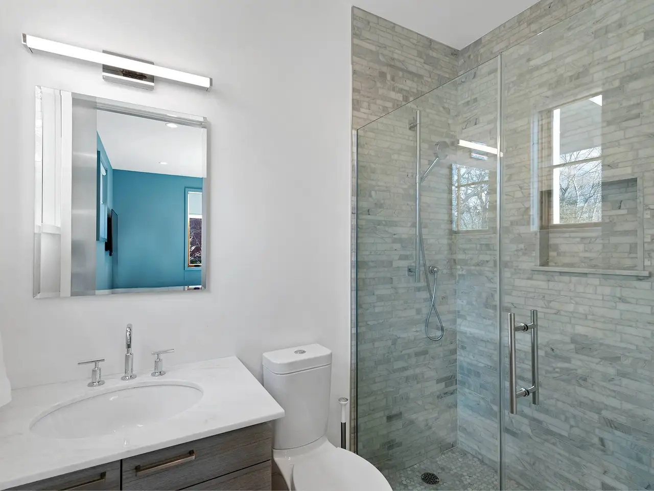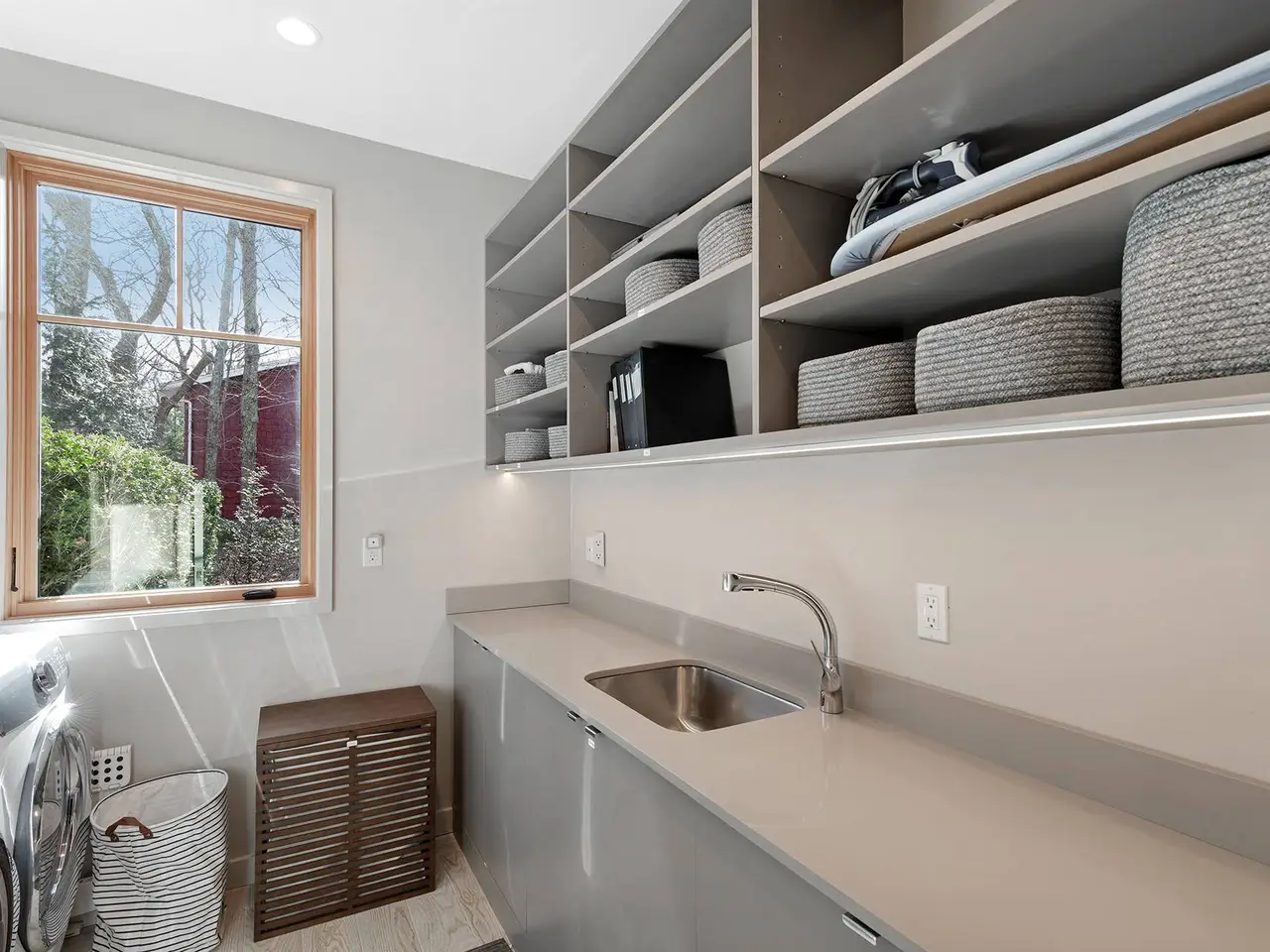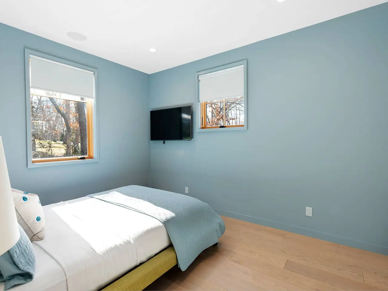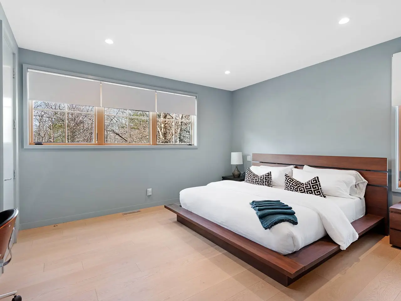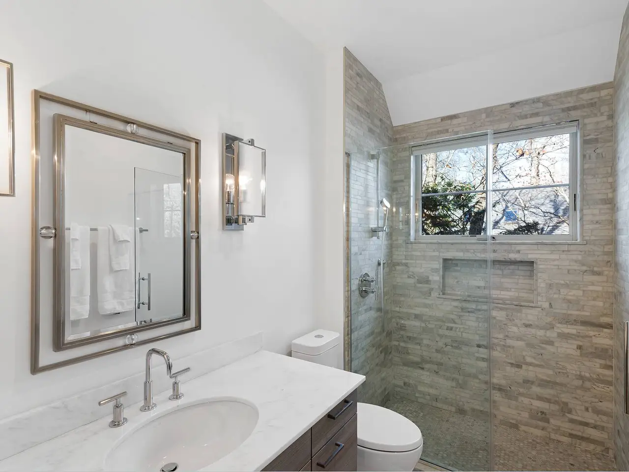 Close to the Village, within a few blocks to a private community beach and less than 1.5 +- miles to Havens Beach in Sag Harbor, this stunning, modern farmhouse features six bedrooms and seven-and-one-half baths across approximately 3,800 square feet. Multiple sleek windows and oversized sliders create walls of glass in the grand, double-height living room with a fireplace that opens to the formal dining room and a designer chef's kitchen with a center island and counter dining. The spectacular primary en suite includes a vaulted-tray ceiling, a gas fireplace with a flat screen, and access to a large mahogany deck overlooking the background. A separate guest wing on the second level is accessed across the gallery bridge. Additional guest rooms and bathrooms are well-appointed with marble and contemporary fixtures. An extensive covered mahogany deck includes a lounge and dining space, ceiling fans, an outdoor fireplace, and a stainless grill. Beyond that, lush lawns and landscaping surround the zero-edge heated pool and spa. Additional amenities include a den with fireplace and flat screen, light, wide-plank hardwood flooring throughout, and a dedicated 1st-floor laundry room.